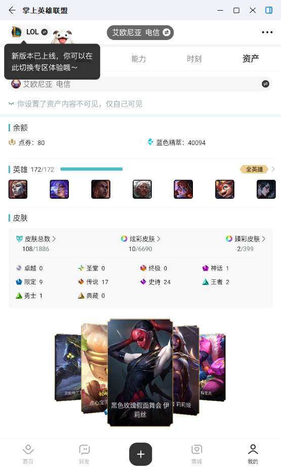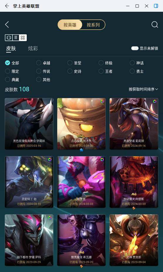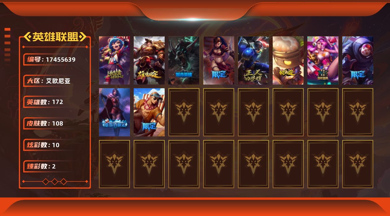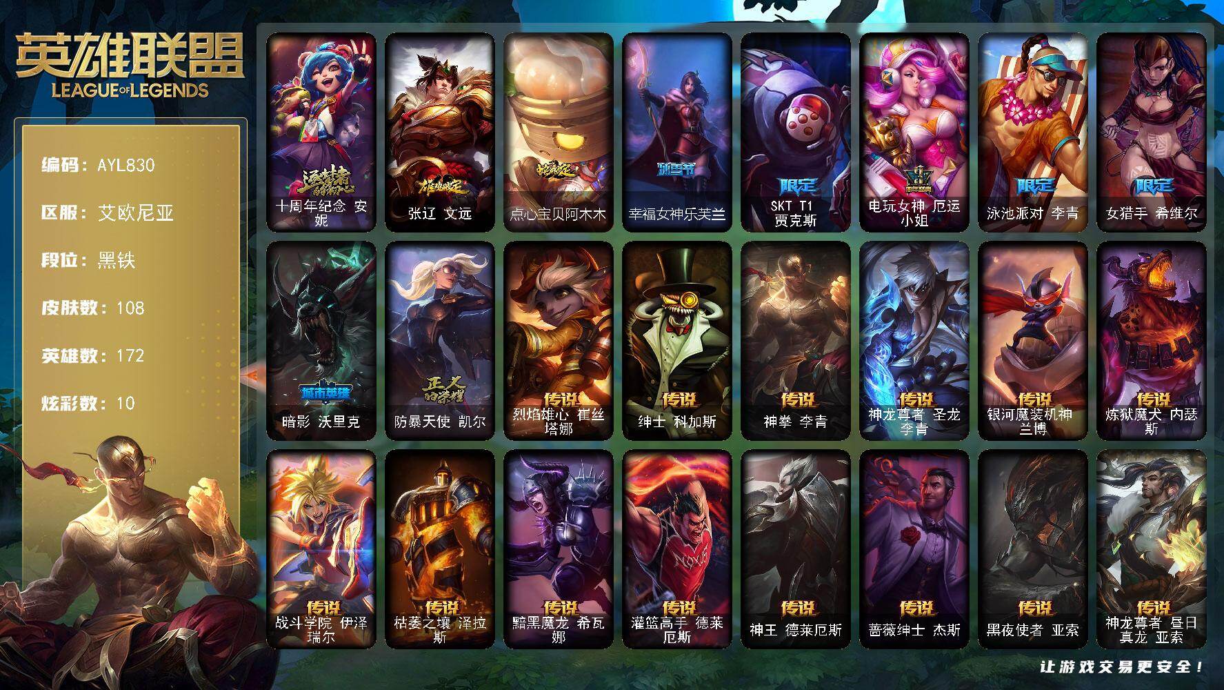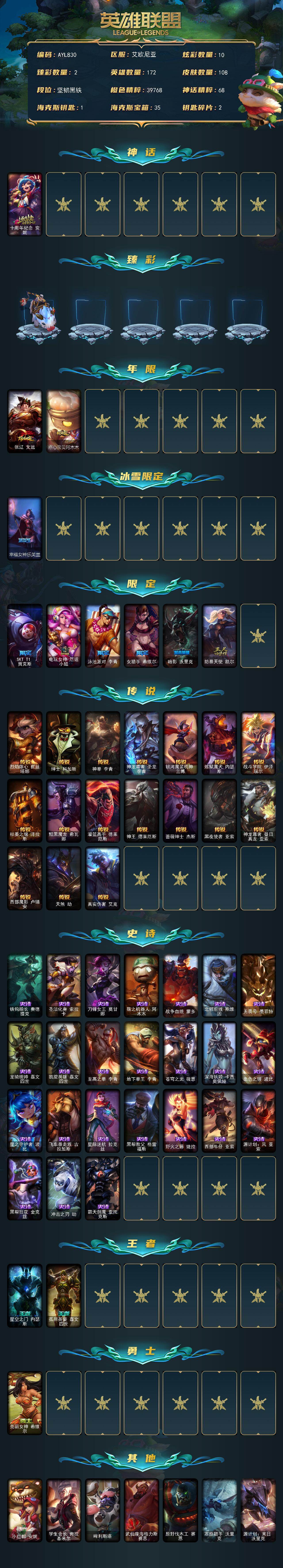 [17455639]黑铁段位-172英雄-108皮肤-10炫彩-0终极-1神话-9限定-17传说-24史诗