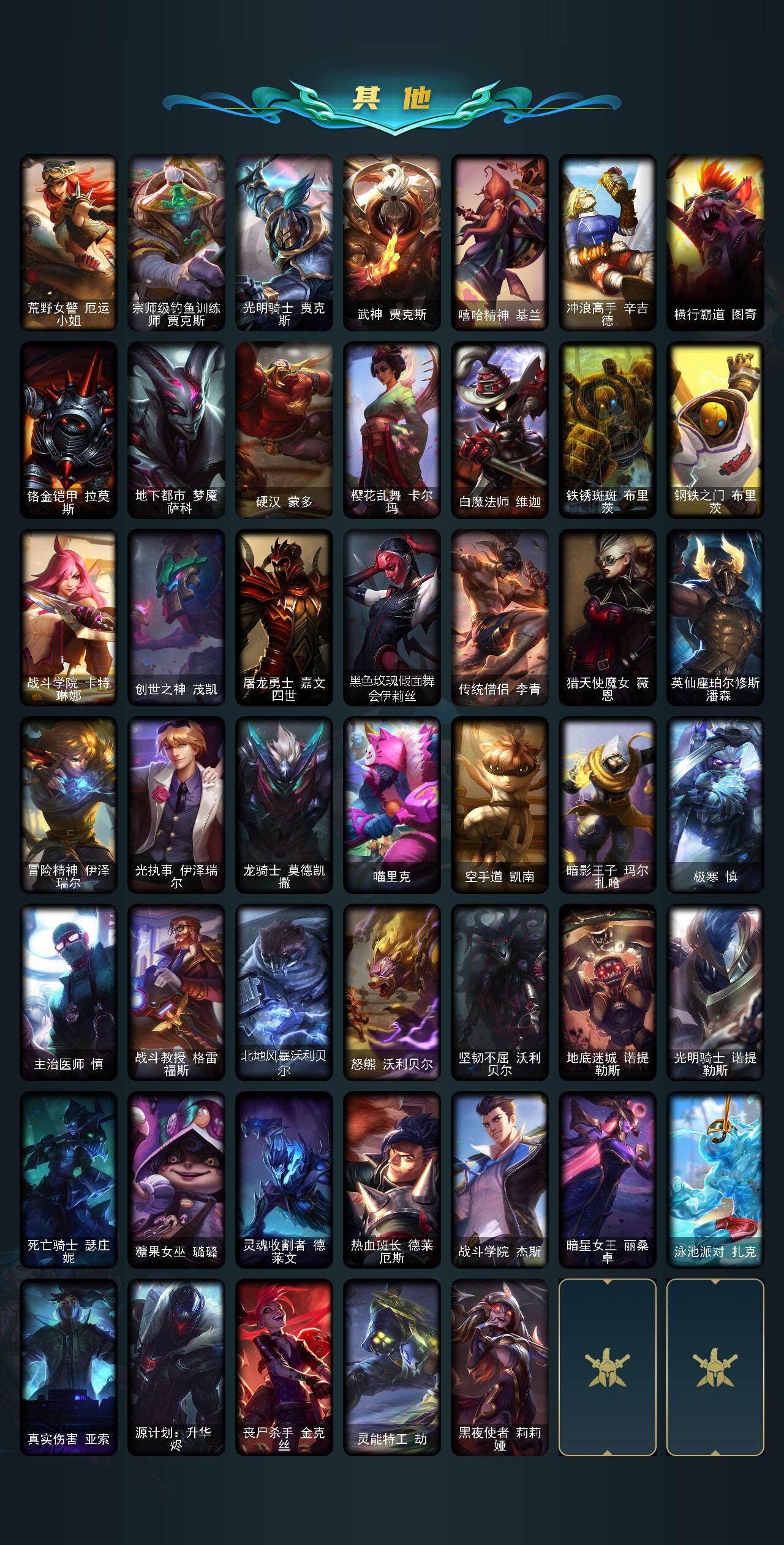 【其他皮肤1】:小红帽安妮,学生会长弗拉基米尔,哞利斯塔,武仙座海格力斯赛恩,原野伐木工赛恩,冻原猎手沃里克,源计划末日沃里克,荒野女警厄运小姐,宗师级钓鱼训练师贾克斯,光明骑士贾克斯,武神贾克斯,嘻哈精神基兰,冲浪高手辛吉德,横行霸道图奇,铬金铠甲拉莫斯,地下都市梦魇萨科,硬汉蒙多,樱花乱舞卡尔玛,白魔法师维迦,铁锈斑斑布里茨,钢铁之门布里茨,战斗学院卡特琳娜,创世之神茂凯,屠龙勇士嘉文四世,黑色玫瑰假面舞会伊莉丝,传统僧侣李青,猎天使魔女薇恩,英仙座珀尔修斯潘森,冒险精神伊泽瑞尔,光执事伊泽瑞尔,龙骑士莫德凯撒,喵里克,空手道凯南,暗影王子玛尔扎哈,极寒慎,主治医师慎,战斗教授格雷福斯,北地风暴沃利贝尔,怒熊沃利贝尔,坚韧不屈沃利贝尔,地底迷城诺提勒斯,光明骑士诺提勒斯,死亡骑士瑟庄妮,糖果女巫璐璐,灵魂收割者德莱文,热血班长德莱厄斯,战斗学院杰斯,暗星女王丽桑卓,泳池派对扎克,真实伤害亚索,源计划升华烬,丧尸杀手金克丝,灵能特工劫,黑夜使者莉莉娅