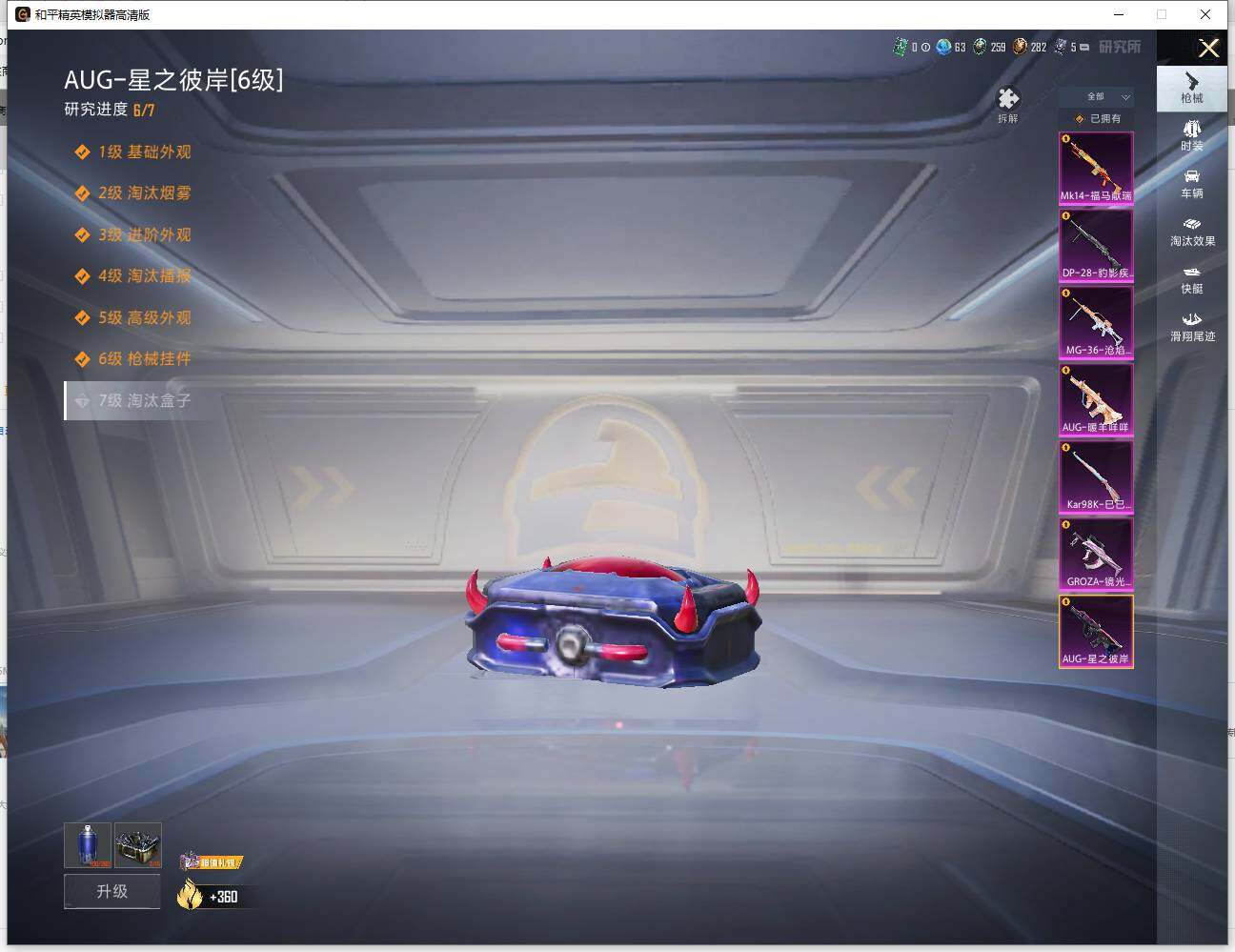 【粉色枪皮等级】:GROZA-镜光银凌(五级),AUG-星之彼岸(六级),AUG-暖羊咩咩(五级),Kar98K-巳巳如意(五级),Mk14-福马献瑞(五级),DP-28-豹影疾电(五级),MG-36-沧焰双生(五级)