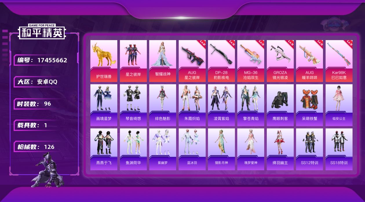 [17455662]【特价出售/店主推荐】 安卓 手Q-2粉装-7特效枪-1载具-2粉色飞行器-34928热力值-5王牌印记-96套装-126枪皮 【粉色套装】:粉装-星之彼岸,角色-智耀战神 【粉色枪皮等级】:GROZA-镜光银凌(五级),AUG-星之彼岸(六级),AUG-暖羊咩咩(五级),Kar98K-巳巳如意(五级),Mk14-福马献瑞(五级),DP-28-豹影疾电(五级),MG-36-沧焰双生(五级) 【粉色载具】:护世瑞兽 【粉色枪皮】:GROZA-镜光银凌,AUG-星之彼岸,AUG-暖羊咩咩,Kar98K-巳巳如意,Mk14-福马献瑞,DP-28-豹影疾电,MG-36-沧焰双生 【粉色飞行器】:炫彩糖果飞行器,万象金身飞行器 【粉色降落伞】:星之彼岸降落伞,彩虹甜喵降落伞,金蛇镇世降落伞,鬼刀降落伞,幻影飞狐降落伞,幻彩电音降落伞,炫彩糖果降落伞 【稀有套装】:套装-雪国风尚,套装-炫彩糖果,套装-马上有钱,角色-临安公主,套装-燕燕于飞,套装-鱼渊荷华,套装-紫幽梦,套装-蓝冰羽,角色-猎影月神,角色-瑰梦爱神,角色-绛羽幽主,套装-朱霞炽焰,套装-凌霄紫焰,套装-擎苍青焰,角色-绯色魅影,套装-画境星梦,套装-琴音绮想,套装-雨过天青,套装-红釉青花 【稀有枪皮】:AUG-冰晶雪宝,AKM-星之彼岸,SCAR-L-夜灯,SCAR-L-炫彩节奏,SCAR-L-玉兔迎春,M416-蓝色火焰,GROZA-影袭,GROZA-荧海星豚,AUG-甜蜜菠萝,AUG-金蛇镇世,M762-牛气冲天,AC-VAL-天降萌叽,AC-VAL-彩虹甜喵,蜜獾-娇憨猪猪,ACE32-画境星梦,ARX-凌霄紫焰,UZI-娇憨猪猪,UZI-影袭,UMP45-夜灯,UMP45-蓝色火焰,Vector-生命誓言,汤姆逊-幻影战神,MP5K-画境星梦,JS9-凌霄紫焰,P90-金蛇镇世,Kar98K-影袭,Kar98K-星穹咏叹调,VSS-星之彼岸,SLR-娇憨猪猪,MK20-H-樱桃泡泡,M1加兰德-画境星梦,MK12-金蛇镇世,S686-彩虹符号,S12K-玩趣呆呆,S12K-破晓战魂,S12K-夜灯,S12K-娇憨猪猪,S12K-幻影战神,S12K-智耀战神,AA12-G-画境星梦,M249-星之彼岸,M249-绯穹魔姬,MG3-幻世战舞者,MG-36-凌霄紫焰,P92-凌霄紫焰,短管霰弹-竹节火铳