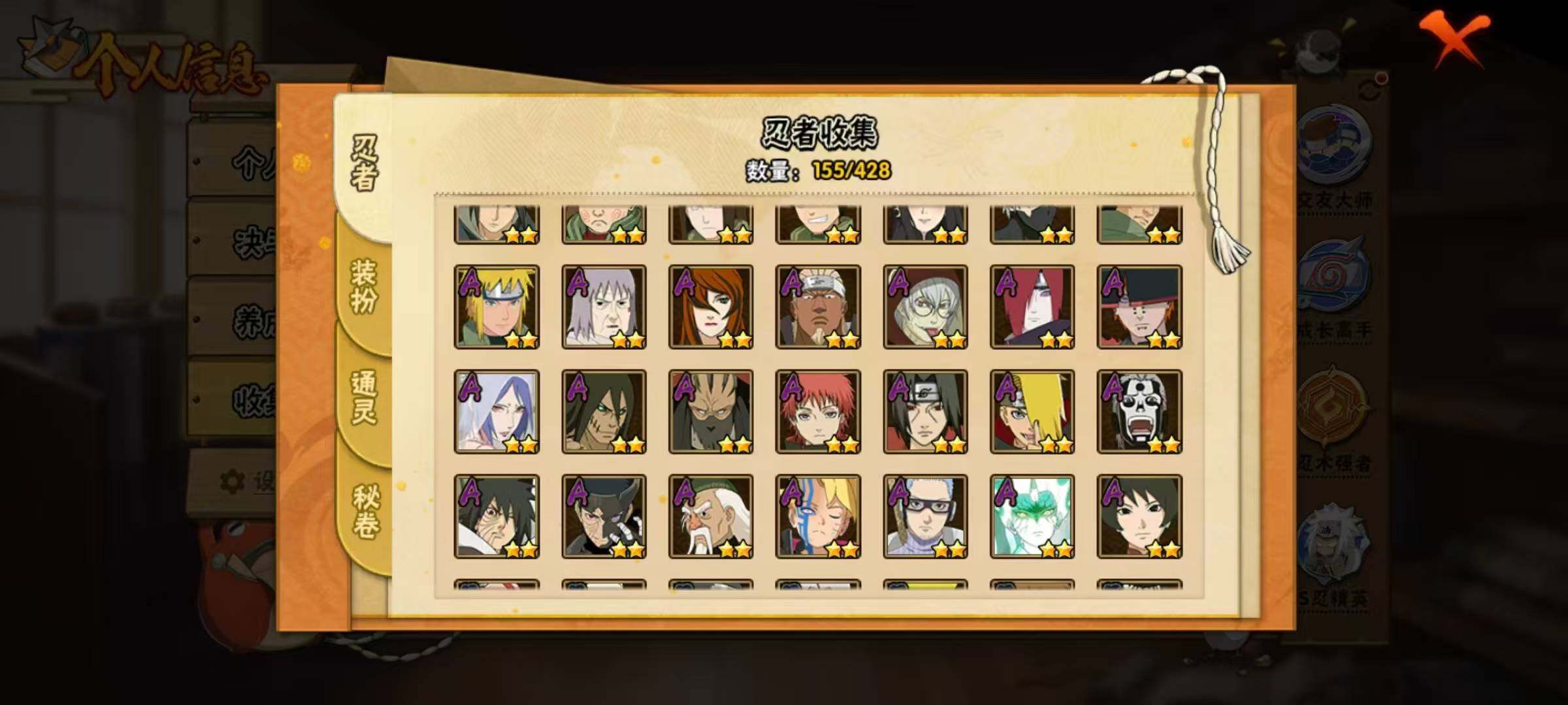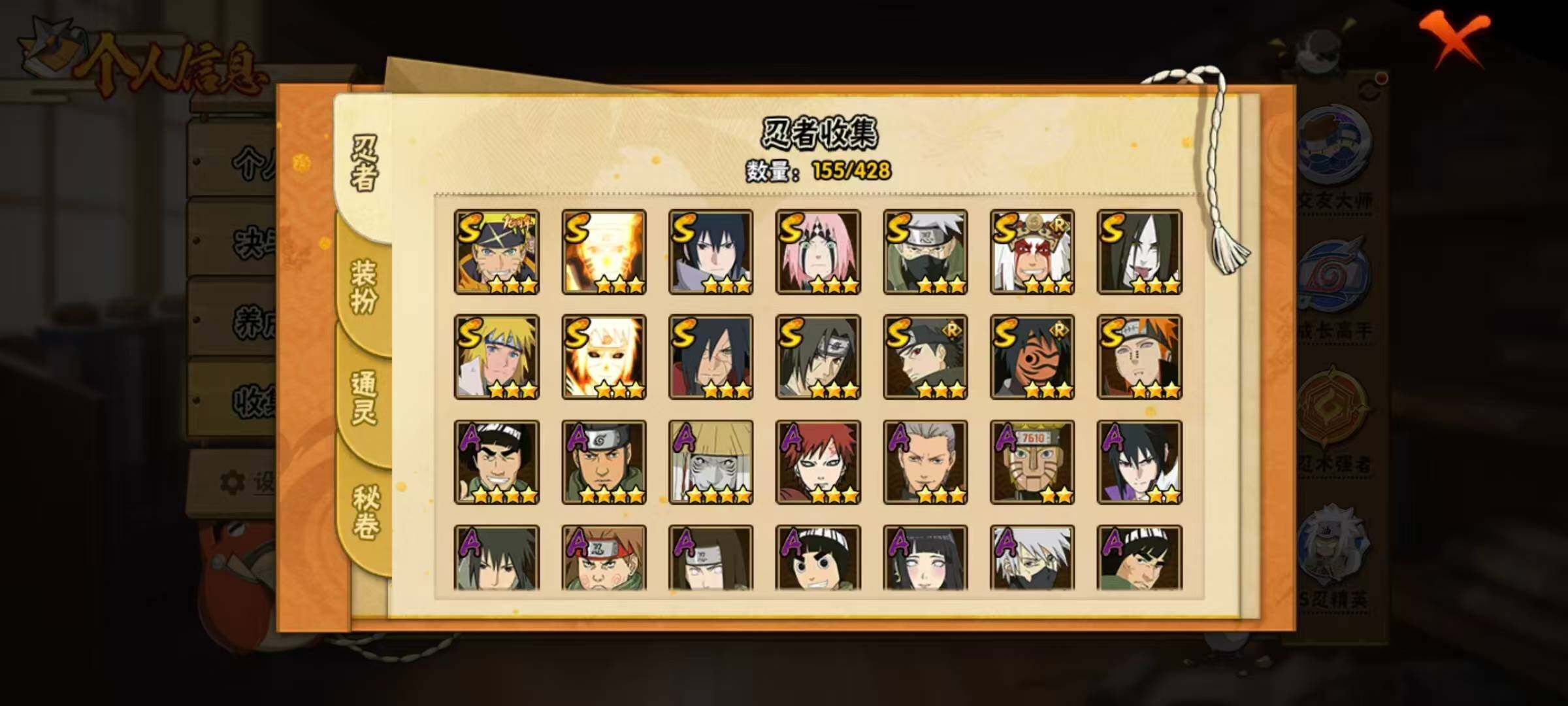 【A级忍者】:艾「青年」(2星),长门「青年」(2星),波风水门「青年」(2星),迪达拉(2星),飞段(3星),飞段「死司凭血」(2星),干柿鬼鲛(4星),漩涡博人「桃式显现」(2星),机械鸣人「初始形态」(2星),迈特凯(4星),旗木卡卡西「万花筒写轮眼」(2星),我爱罗「疾风传」(3星),蝎(2星),蝎「绯流琥」(2星),小南「漂泊浪客」(2星),角都「秽土转生」(2星),猿飞阿斯玛(4星),宇智波鼬(2星),宇智波佐助「侠隐江湖」(2星),药师兜「半蛇斗篷」(2星),照美冥「五代目水影」(2星),日向宁次「忍界大战」(2星),日向雏田「最终章」(2星),宇智波带土「暴怒」(2星),宇智波带土「漂泊浪客」(2星),长十郎「六代目水影」(2星),佩恩·六道「漂泊浪客」(2星),李洛克「忍界大战」(2星),黑土「博人传」(2星),秋道丁次「忍界大战」(2星),千代「近松十人卫」(2星),宇智波泉奈(2星),大野木「侠隐江湖」(2星),巳月「仙人模式」(2星),迈特凯「青春爆炸」(2星)