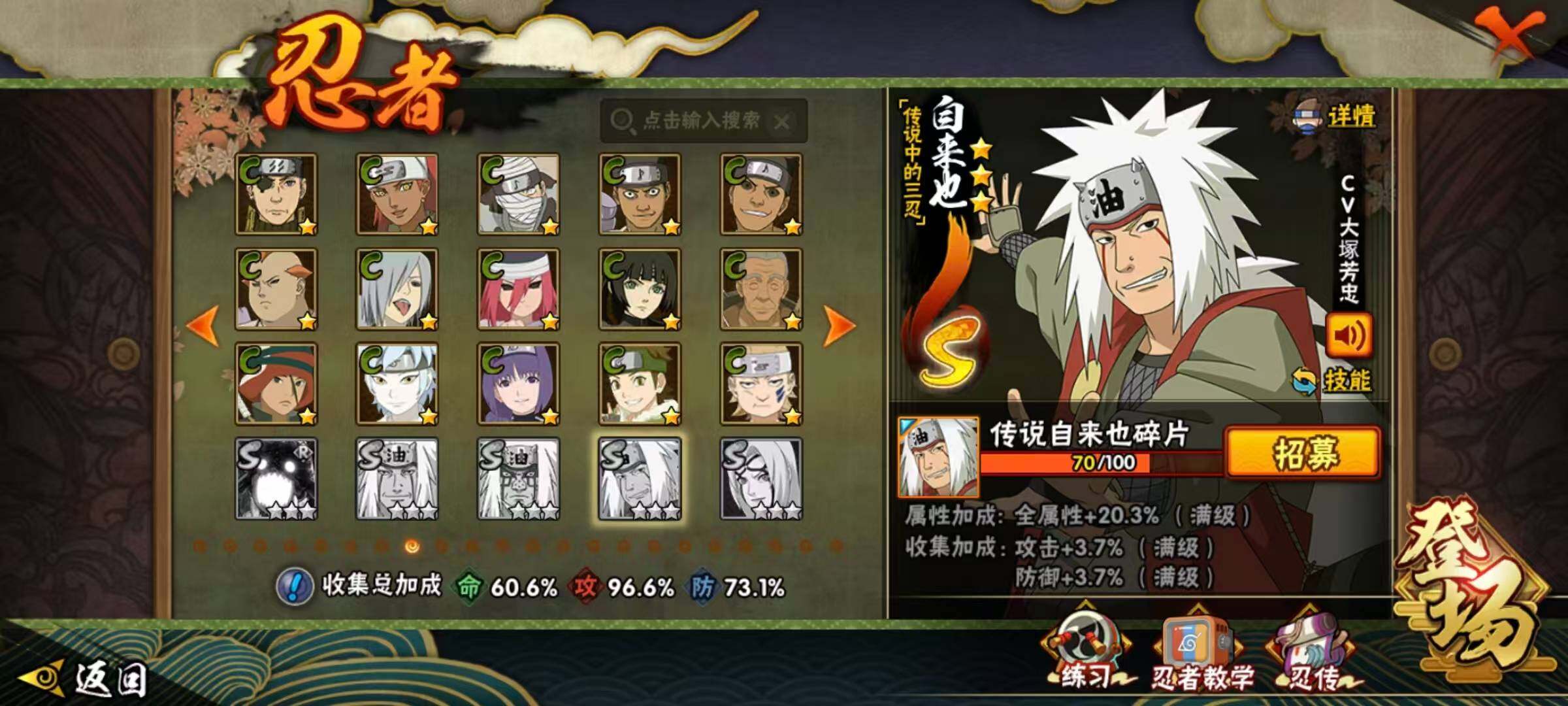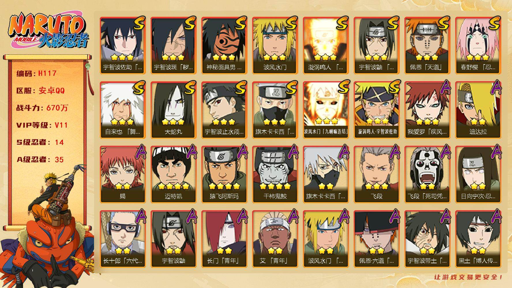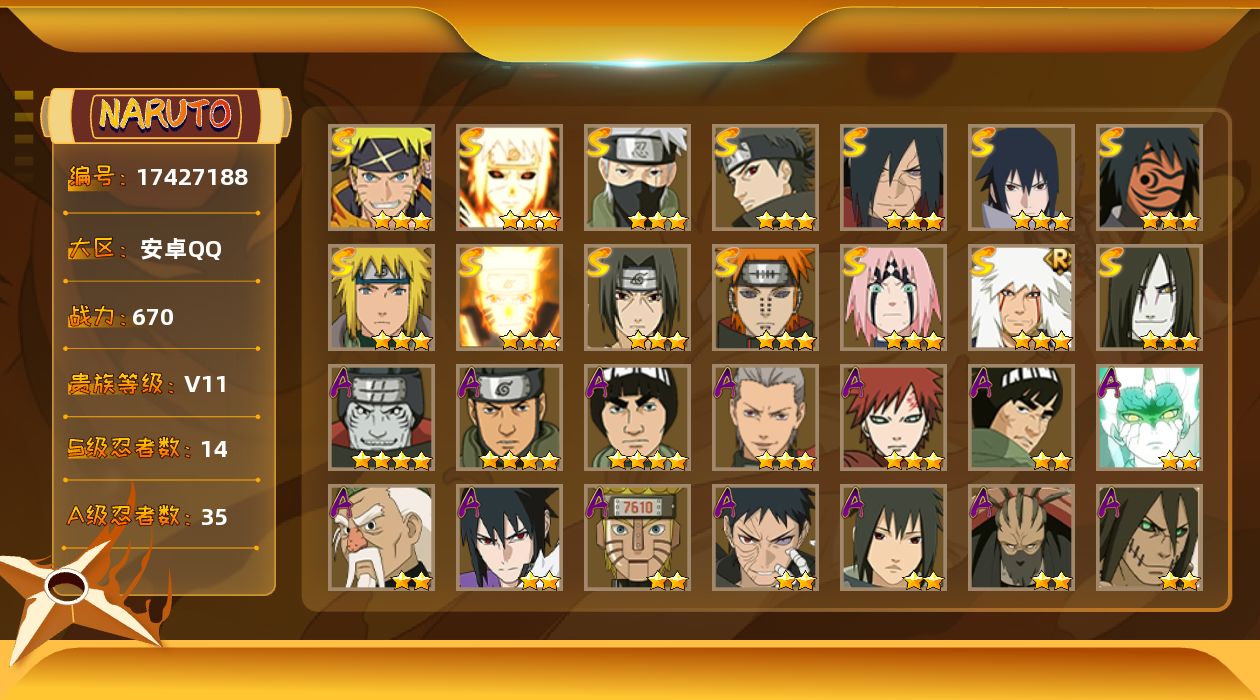 [17427188]14S级忍者数-35A级忍者数 【S级忍者】:宇智波斑「秽土转生·解」(3星),春野樱「忍界大战」(3星),宇智波鼬「须佐能乎」(3星),宇智波止水「须佐能乎」(3星),旗木卡卡西「须佐能乎」(3星),自来也「舞之豪杰」(3星),大蛇丸(3星),波风水门(3星),神秘面具男「红夜之刃」(3星),漩涡鸣人「九喇嘛连结」(3星),佩恩「天道」(3星),宇智波佐助「永恒万花筒」(3星),波风水门「九喇嘛连结」(3星),漩涡鸣人·宇智波佐助(3星) 【A级忍者】:艾「青年」(2星),长门「青年」(2星),波风水门「青年」(2星),迪达拉(2星),飞段(3星),飞段「死司凭血」(2星),干柿鬼鲛(4星),漩涡博人「桃式显现」(2星),机械鸣人「初始形态」(2星),迈特凯(4星),旗木卡卡西「万花筒写轮眼」(2星),我爱罗「疾风传」(3星),蝎(2星),蝎「绯流琥」(2星),小南「漂泊浪客」(2星),角都「秽土转生」(2星),猿飞阿斯玛(4星),宇智波鼬(2星),宇智波佐助「侠隐江湖」(2星),药师兜「半蛇斗篷」(2星),照美冥「五代目水影」(2星),日向宁次「忍界大战」(2星),日向雏田「最终章」(2星),宇智波带土「暴怒」(2星),宇智波带土「漂泊浪客」(2星),长十郎「六代目水影」(2星),佩恩·六道「漂泊浪客」(2星),李洛克「忍界大战」(2星),黑土「博人传」(2星),秋道丁次「忍界大战」(2星),千代「近松十人卫」(2星),宇智波泉奈(2星),大野木「侠隐江湖」(2星),巳月「仙人模式」(2星),迈特凯「青春爆炸」(2星)