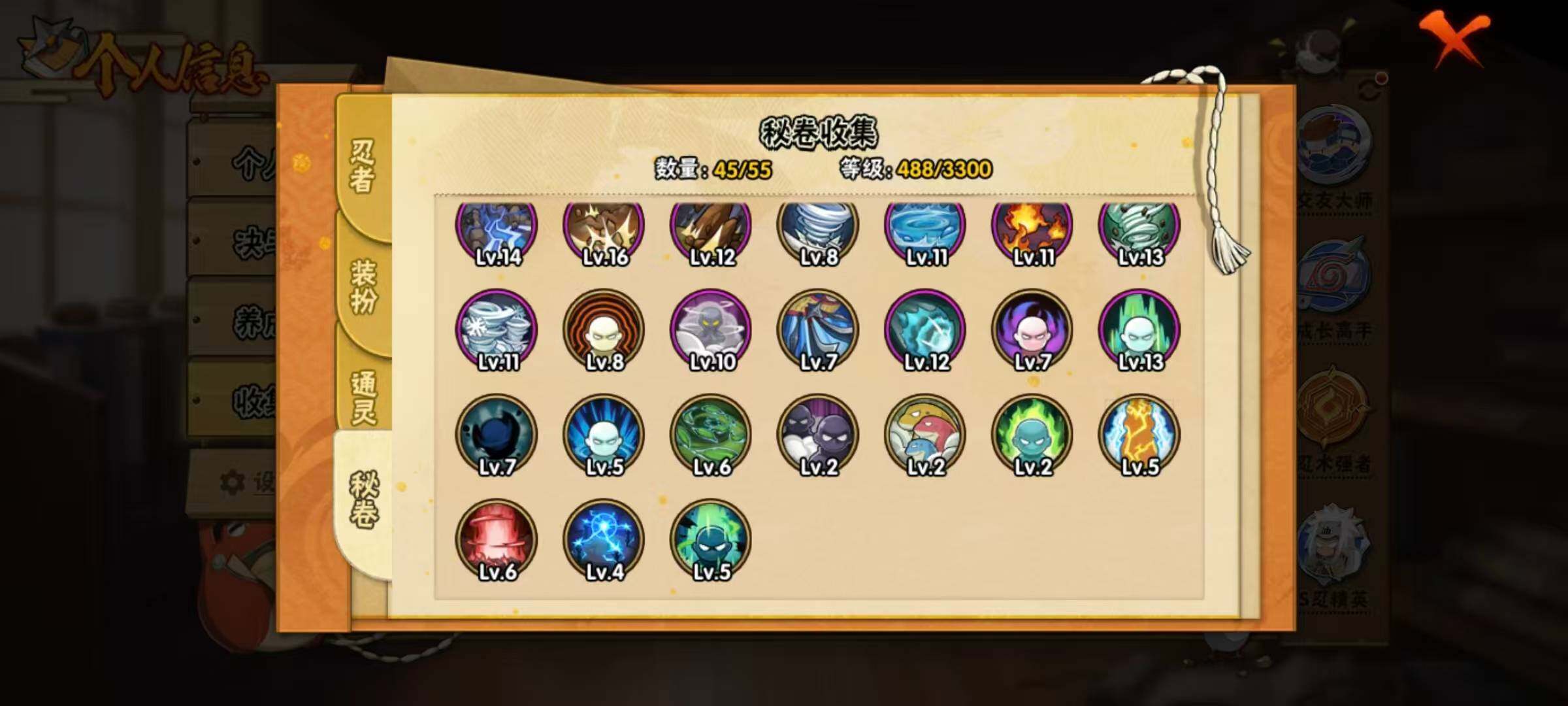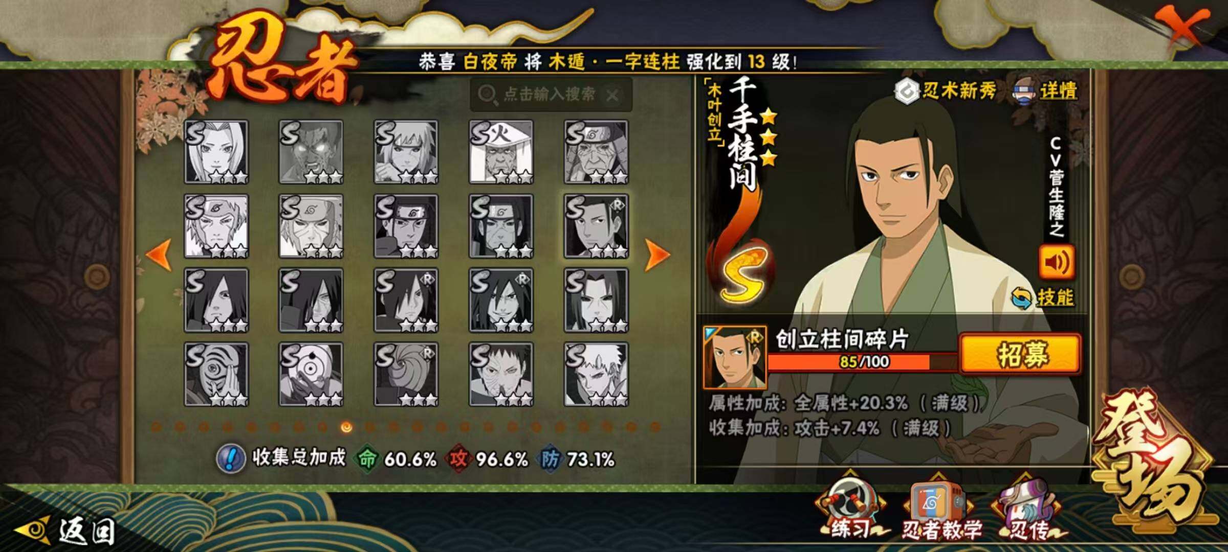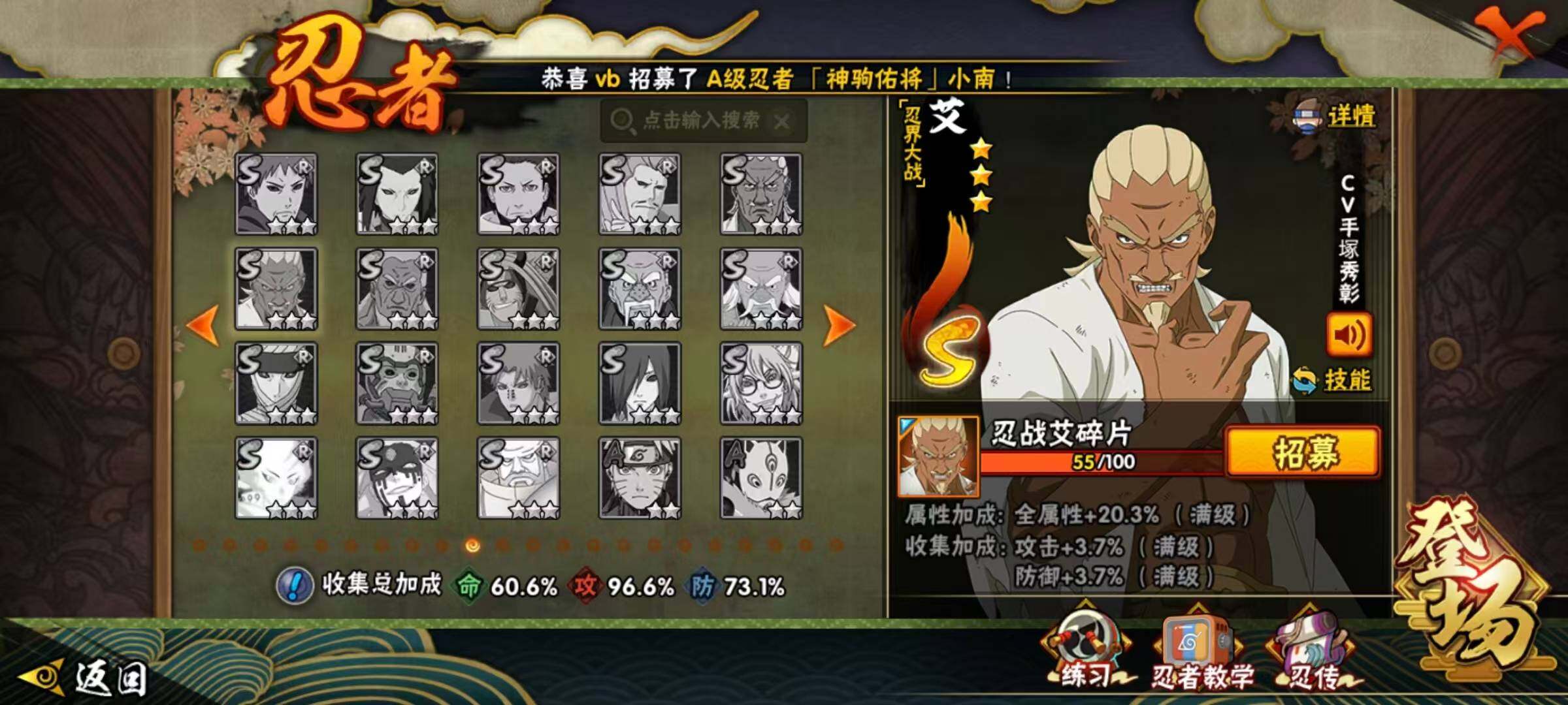 [17427188]14S级忍者数-35A级忍者数 【S级忍者】:宇智波斑「秽土转生·解」(3星),春野樱「忍界大战」(3星),宇智波鼬「须佐能乎」(3星),宇智波止水「须佐能乎」(3星),旗木卡卡西「须佐能乎」(3星),自来也「舞之豪杰」(3星),大蛇丸(3星),波风水门(3星),神秘面具男「红夜之刃」(3星),漩涡鸣人「九喇嘛连结」(3星),佩恩「天道」(3星),宇智波佐助「永恒万花筒」(3星),波风水门「九喇嘛连结」(3星),漩涡鸣人·宇智波佐助(3星) 【A级忍者】:艾「青年」(2星),长门「青年」(2星),波风水门「青年」(2星),迪达拉(2星),飞段(3星),飞段「死司凭血」(2星),干柿鬼鲛(4星),漩涡博人「桃式显现」(2星),机械鸣人「初始形态」(2星),迈特凯(4星),旗木卡卡西「万花筒写轮眼」(2星),我爱罗「疾风传」(3星),蝎(2星),蝎「绯流琥」(2星),小南「漂泊浪客」(2星),角都「秽土转生」(2星),猿飞阿斯玛(4星),宇智波鼬(2星),宇智波佐助「侠隐江湖」(2星),药师兜「半蛇斗篷」(2星),照美冥「五代目水影」(2星),日向宁次「忍界大战」(2星),日向雏田「最终章」(2星),宇智波带土「暴怒」(2星),宇智波带土「漂泊浪客」(2星),长十郎「六代目水影」(2星),佩恩·六道「漂泊浪客」(2星),李洛克「忍界大战」(2星),黑土「博人传」(2星),秋道丁次「忍界大战」(2星),千代「近松十人卫」(2星),宇智波泉奈(2星),大野木「侠隐江湖」(2星),巳月「仙人模式」(2星),迈特凯「青春爆炸」(2星)