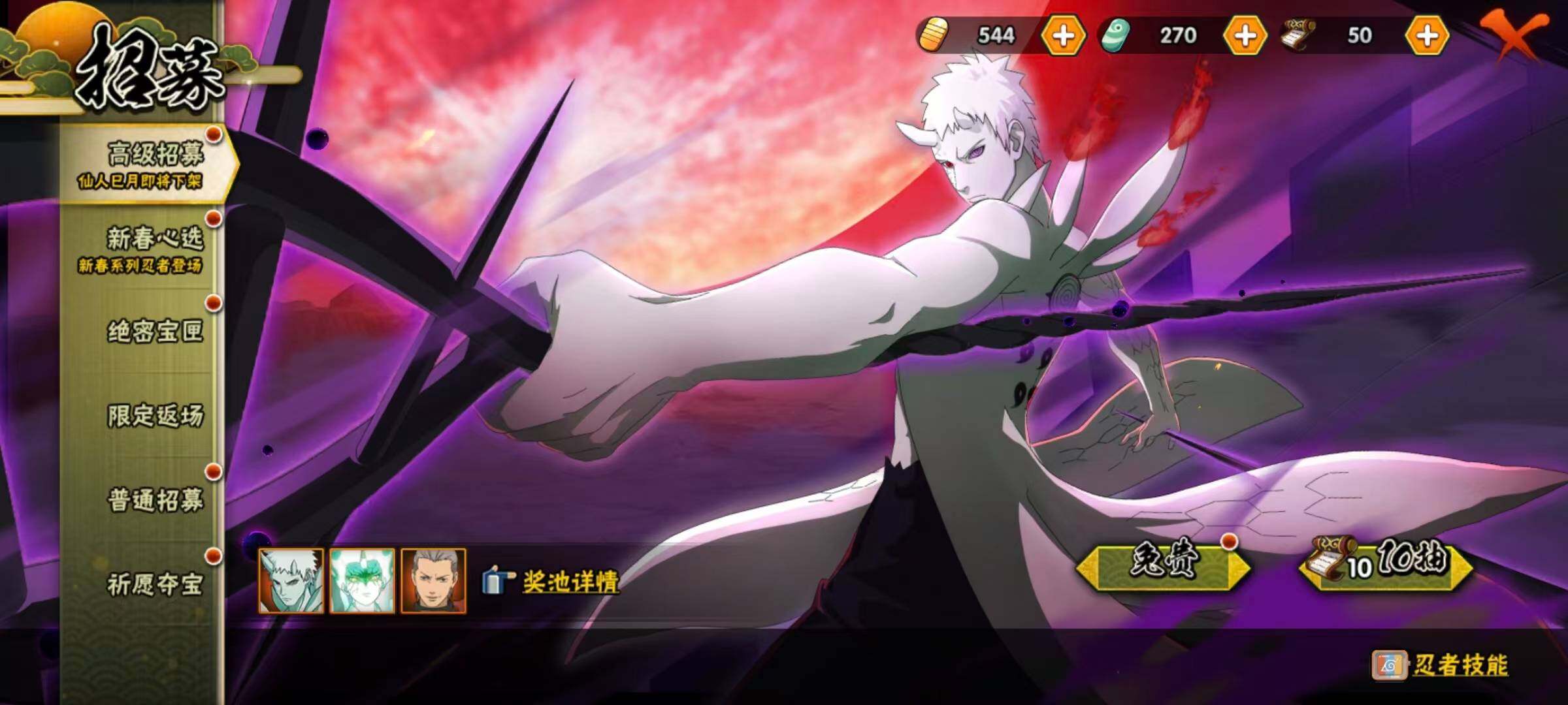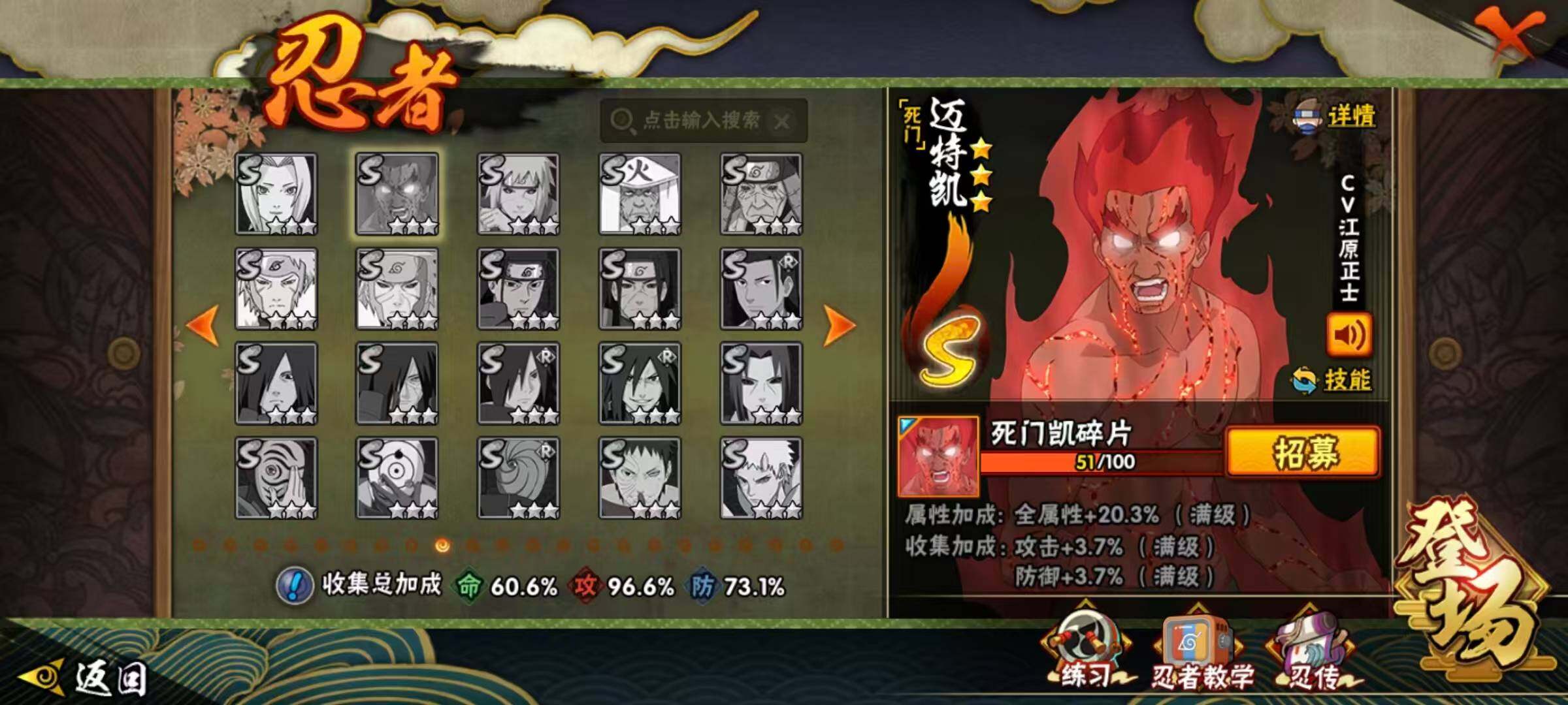 【S级忍者】:宇智波斑「秽土转生·解」(3星),春野樱「忍界大战」(3星),宇智波鼬「须佐能乎」(3星),宇智波止水「须佐能乎」(3星),旗木卡卡西「须佐能乎」(3星),自来也「舞之豪杰」(3星),大蛇丸(3星),波风水门(3星),神秘面具男「红夜之刃」(3星),漩涡鸣人「九喇嘛连结」(3星),佩恩「天道」(3星),宇智波佐助「永恒万花筒」(3星),波风水门「九喇嘛连结」(3星),漩涡鸣人·宇智波佐助(3星)