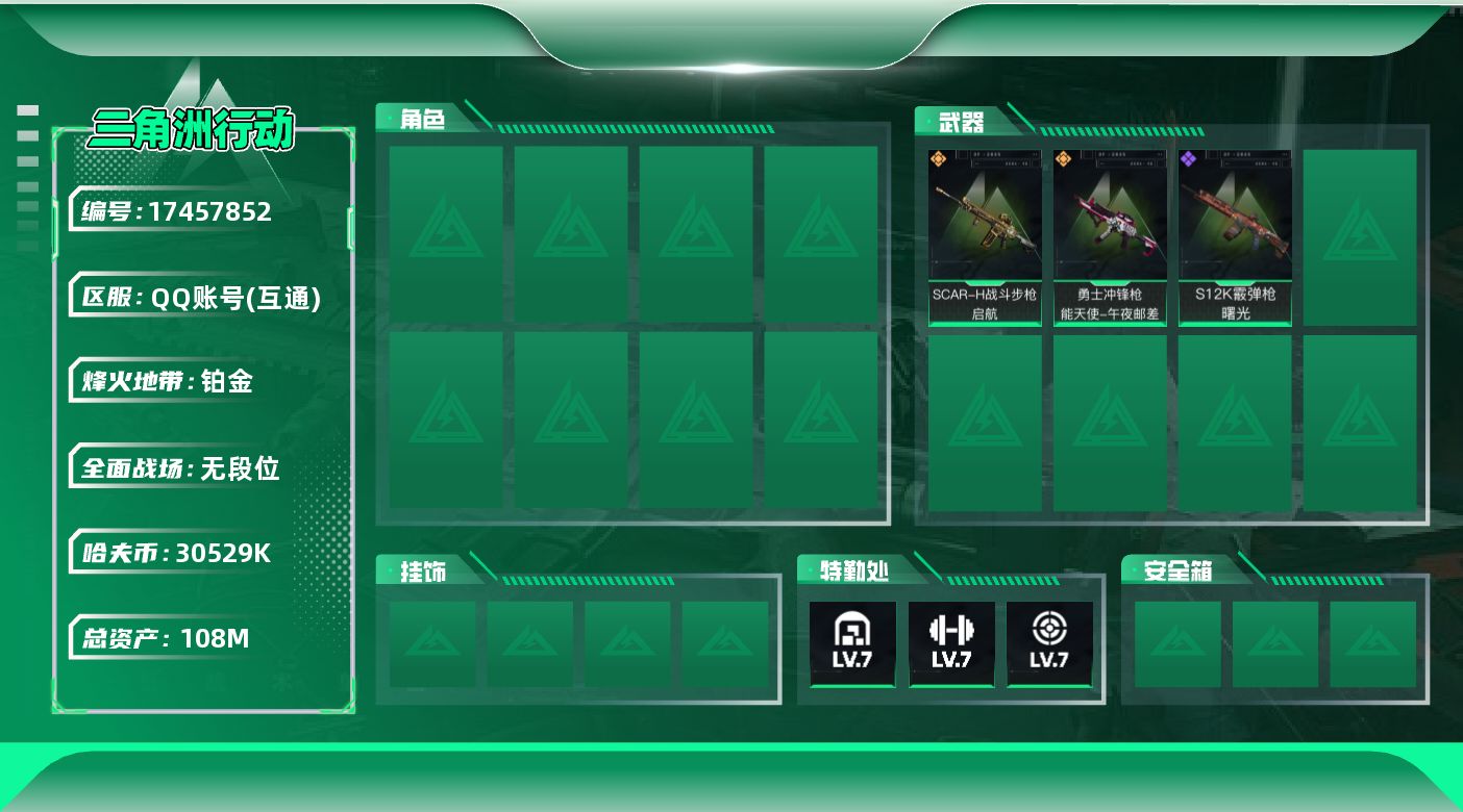 [17457852]【特价出售/店主推荐】108m总资产-30529k哈伏币-58烽火等级-铂金-1战场等级-无军衔 【近战皮肤】:近战-黑鹰 【传说外观】:SCAR-H战斗步枪-启航,勇士冲锋枪-能天使-午夜邮差 【史诗外观】:S12K霰弹枪-曙光 【稀有外观】:AKM突击步枪-肃杀,K416突击步枪-碳纤维,K437突击步枪-生存指令,MK47突击步枪-精英联盟,SMG-45冲锋枪-幻影结构,SR-25射手步枪-开拓 【普通外观】:M4A1突击步枪-粉色涂装,M4A1突击步枪-高雅黑,M4A1突击步枪-海色,QBZ191突击步枪-三角洲力量,SG552突击步枪-浅蓝涂装,SCAR-H战斗步枪-数码迷彩,G3战斗步枪-高雅黑,PTR-32突击步枪-黄蜂,MP5冲锋枪-海色,MP5冲锋枪-黄蜂,Vector冲锋枪-几何迷彩,野牛冲锋枪-高雅黑,M1014霰弹枪-高雅黑,SKS射手步枪-三角洲力量,SR-25射手步枪-黄蜂 【载具外观】:轮式突击炮-荣耀 【军牌】:军牌-展示,军牌-来点薯条,军牌-修整,军牌-神秘艺术,军牌-信誉优秀 【挂饰】:挂饰-启程