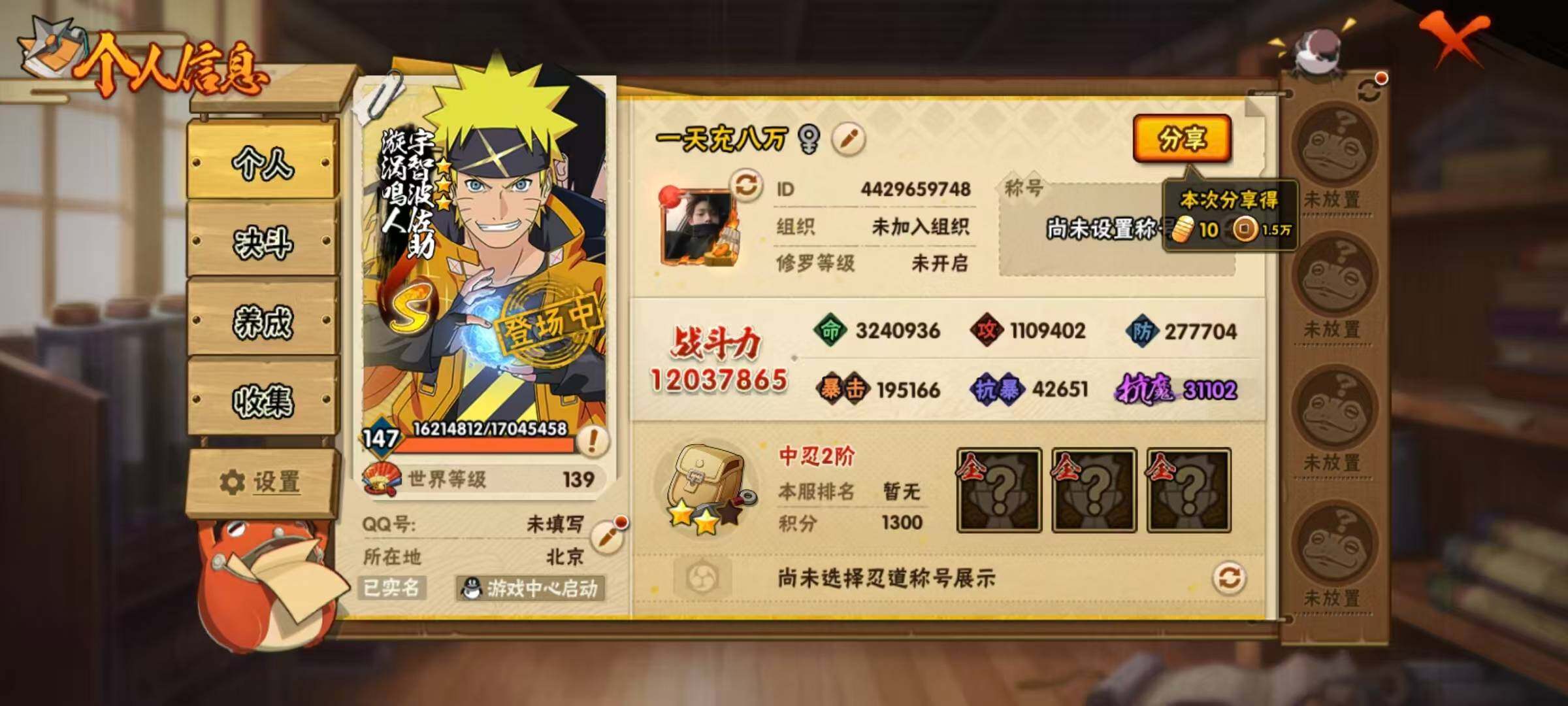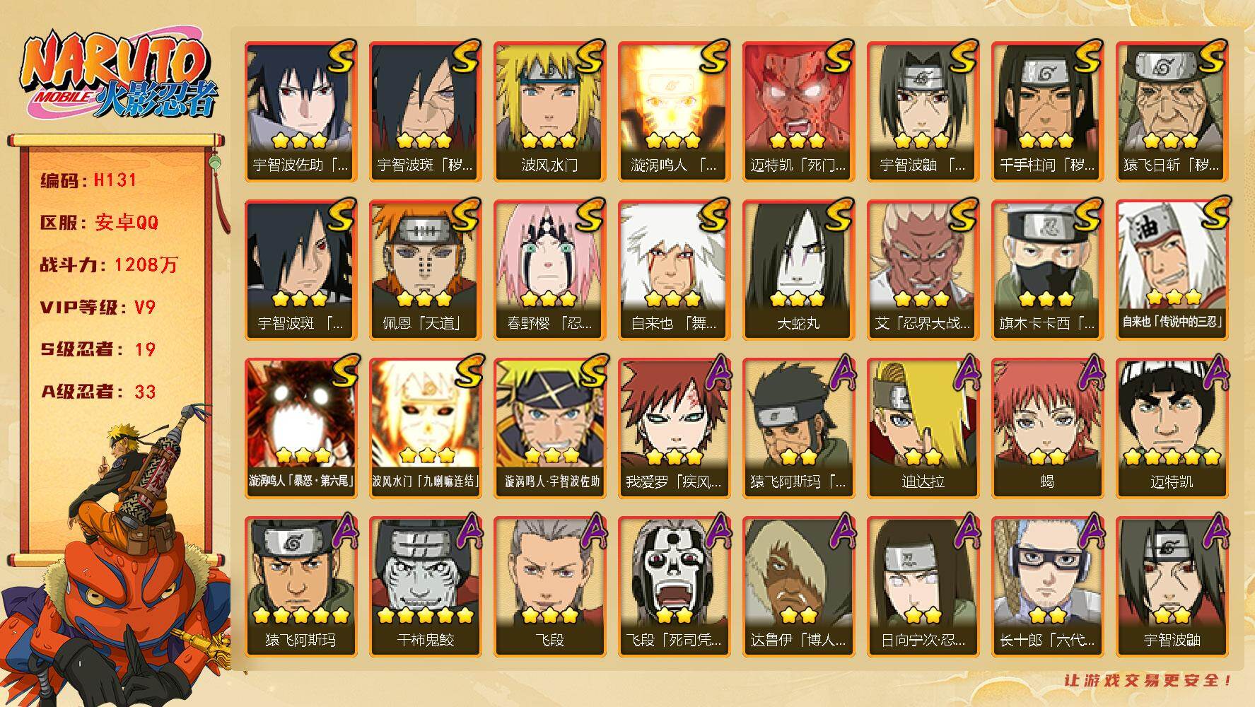 - [11443725]V8 9S忍 34A忍 16通灵 663.3W战力 可二次 可修改实名 优质装备:宇智波鼬「秽土转生」,宇智波佐助「永恒万花筒」,宇智波斑「秽土转生·解」,自来也 「传说中的三忍」 S级忍者:自来也 「舞之豪杰」,宇智波鼬 「须佐能乎」,佩恩「天道」,波风水门,大蛇丸