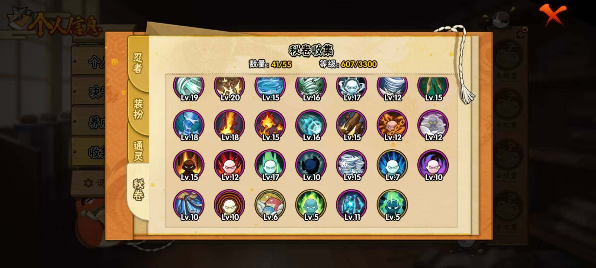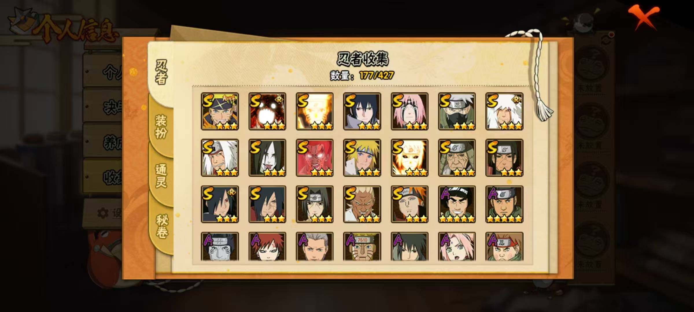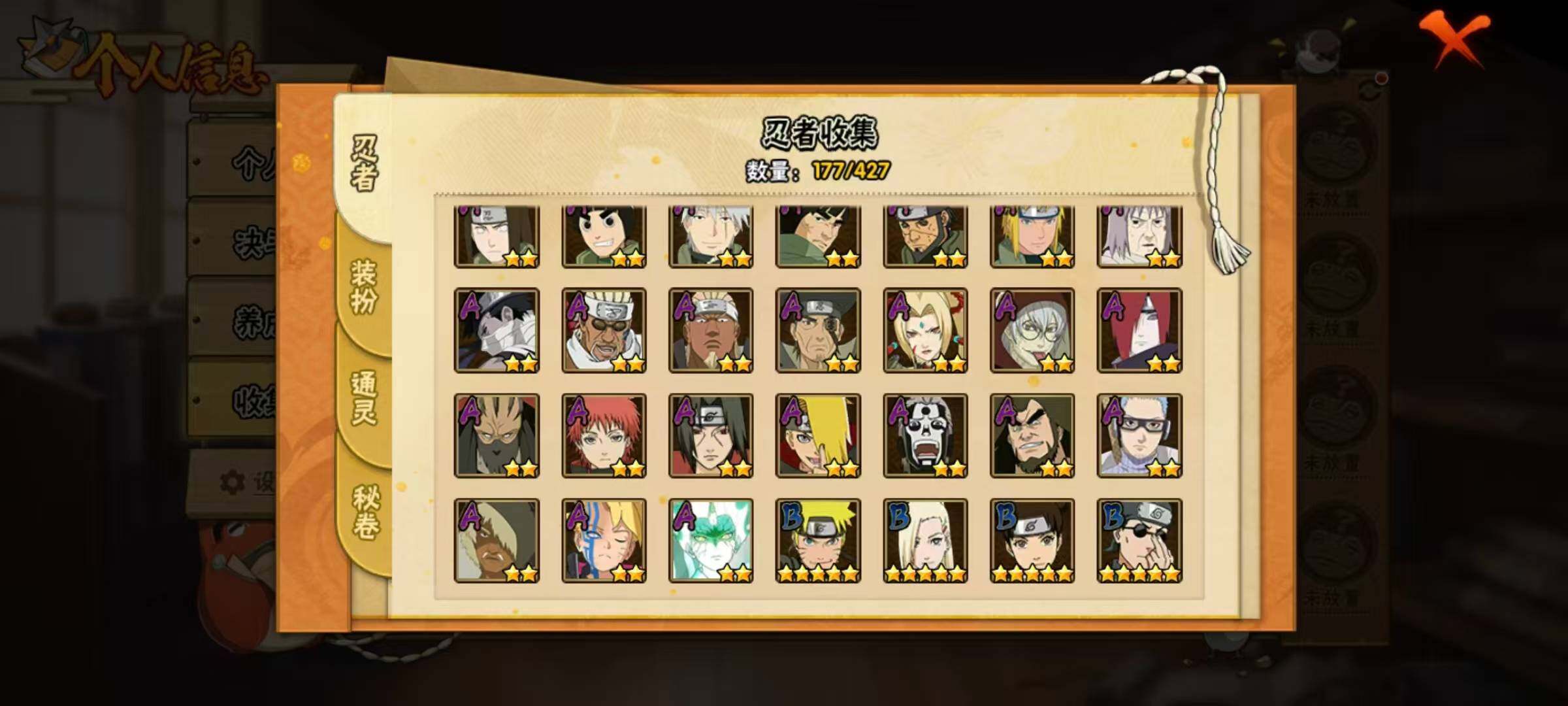 【A级忍者】:艾「青年」(2星),长门「青年」(2星),波风水门「青年」(2星),达鲁伊「博人传」(2星),迪达拉(2星),奇拉比(2星),飞段(3星),飞段「死司凭血」(2星),干柿鬼鲛(5星),漩涡博人「桃式显现」(2星),机械鸣人「初始形态」(2星),迈特凯(5星),旗木卡卡西「幻之真容」(2星),桃地再不斩「秽土转生」(2星),我爱罗「疾风传」(3星),蝎(2星),蝎「绯流琥」(2星),猿飞阿斯玛(5星),猿飞阿斯玛「秽土转生」(2星),宇智波鼬(2星),药师兜「半蛇斗篷」(2星),日向宁次「忍界大战」(2星),长十郎「六代目水影」(2星),李洛克「忍界大战」(2星),春野樱「百豪」(2星),秋道丁次「忍界大战」(2星),千代「近松十人卫」(2星),神农「羁绊」(2星),土台「忍界大战」(2星),宇智波泉奈(2星),巳月「仙人模式」(2星),纲手「妖怪奇谭」(2星),迈特凯「青春爆炸」(2星)