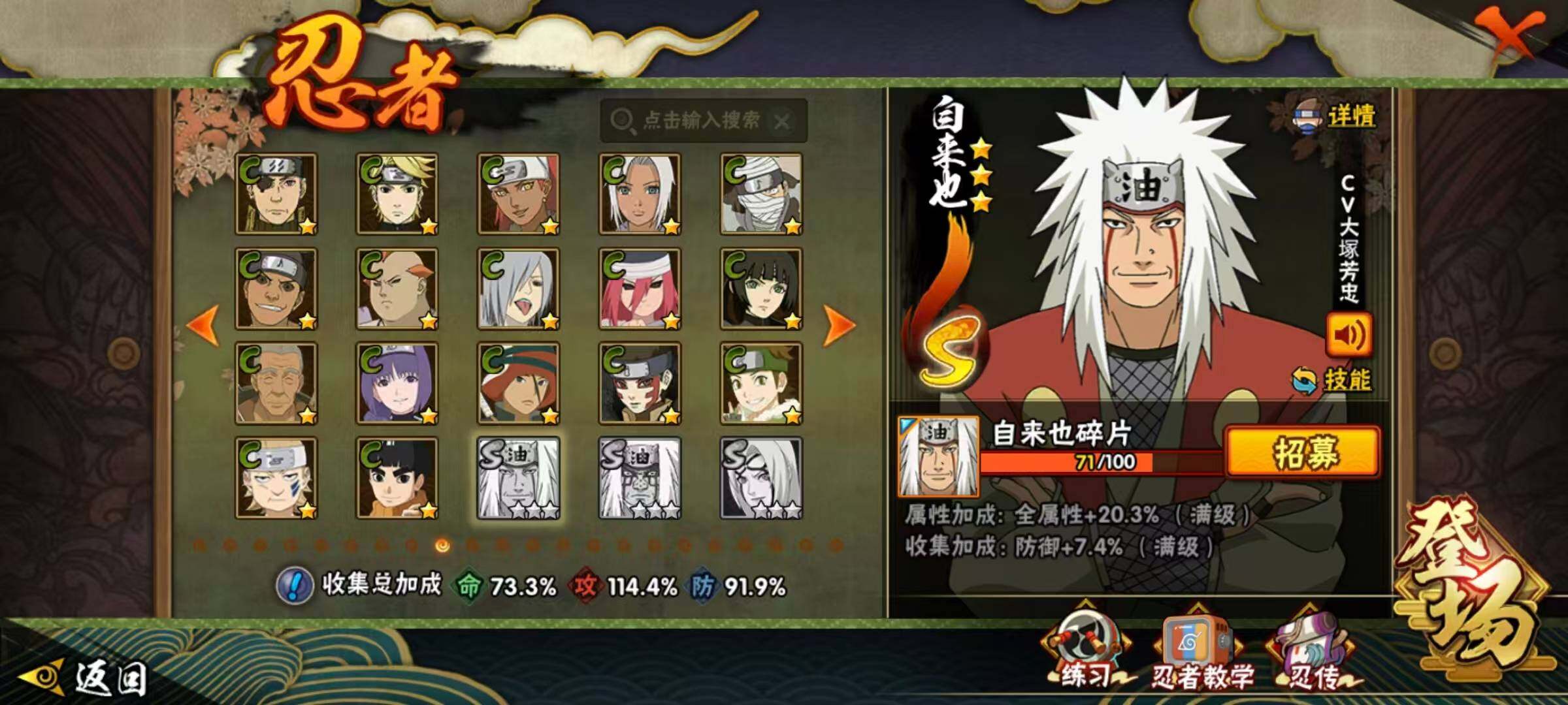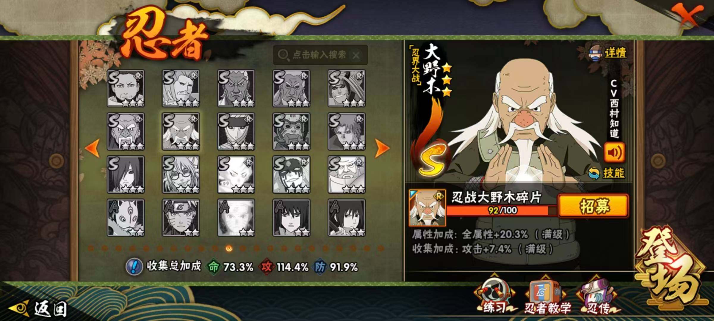 [17322864]19S级忍者数-33A级忍者数 【S级忍者】:猿飞日斩「秽土转生」(3星),千手柱间「秽土转生」(3星),宇智波斑「秽土转生·解」(3星),春野樱「忍界大战」(3星),艾「忍界大战」(3星),宇智波鼬「须佐能乎」(3星),旗木卡卡西「须佐能乎」(3星),宇智波斑「木叶创立」(3星),自来也「舞之豪杰」(3星),大蛇丸(3星),自来也「传说中的三忍」(3星),波风水门(3星),漩涡鸣人「九喇嘛连结」(3星),迈特凯「死门」(3星),佩恩「天道」(3星),宇智波佐助「永恒万花筒」(3星),漩涡鸣人「暴怒·第六尾」(3星),波风水门「九喇嘛连结」(3星),漩涡鸣人·宇智波佐助(3星) 【A级忍者】:艾「青年」(2星),长门「青年」(2星),波风水门「青年」(2星),达鲁伊「博人传」(2星),迪达拉(2星),奇拉比(2星),飞段(3星),飞段「死司凭血」(2星),干柿鬼鲛(5星),漩涡博人「桃式显现」(2星),机械鸣人「初始形态」(2星),迈特凯(5星),旗木卡卡西「幻之真容」(2星),桃地再不斩「秽土转生」(2星),我爱罗「疾风传」(3星),蝎(2星),蝎「绯流琥」(2星),猿飞阿斯玛(5星),猿飞阿斯玛「秽土转生」(2星),宇智波鼬(2星),药师兜「半蛇斗篷」(2星),日向宁次「忍界大战」(2星),长十郎「六代目水影」(2星),李洛克「忍界大战」(2星),春野樱「百豪」(2星),秋道丁次「忍界大战」(2星),千代「近松十人卫」(2星),神农「羁绊」(2星),土台「忍界大战」(2星),宇智波泉奈(2星),巳月「仙人模式」(2星),纲手「妖怪奇谭」(2星),迈特凯「青春爆炸」(2星)