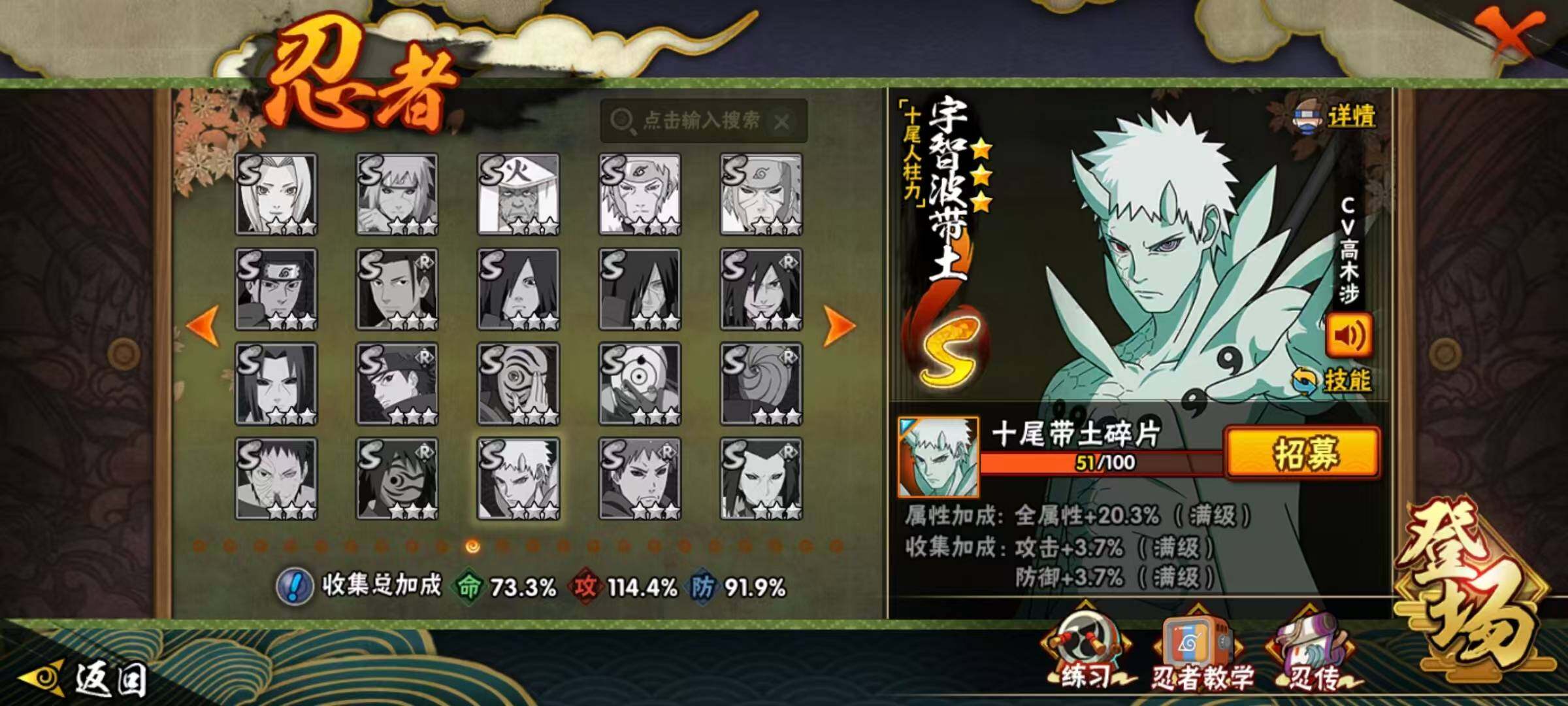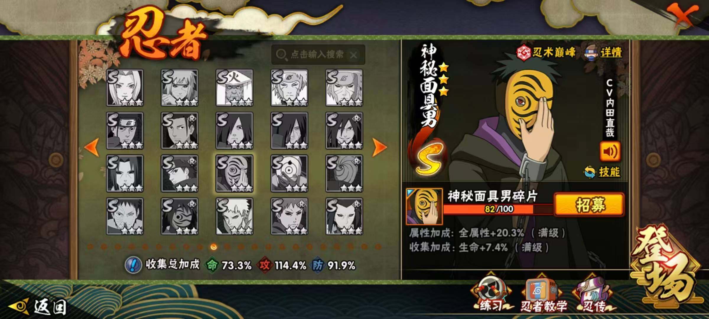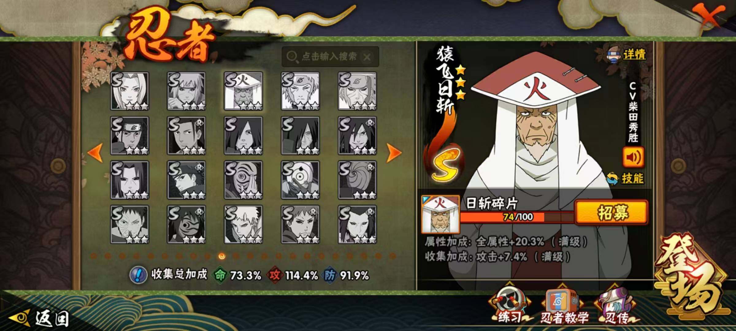 【S级忍者】:猿飞日斩「秽土转生」(3星),千手柱间「秽土转生」(3星),宇智波斑「秽土转生·解」(3星),春野樱「忍界大战」(3星),艾「忍界大战」(3星),宇智波鼬「须佐能乎」(3星),旗木卡卡西「须佐能乎」(3星),宇智波斑「木叶创立」(3星),自来也「舞之豪杰」(3星),大蛇丸(3星),自来也「传说中的三忍」(3星),波风水门(3星),漩涡鸣人「九喇嘛连结」(3星),迈特凯「死门」(3星),佩恩「天道」(3星),宇智波佐助「永恒万花筒」(3星),漩涡鸣人「暴怒·第六尾」(3星),波风水门「九喇嘛连结」(3星),漩涡鸣人·宇智波佐助(3星)
