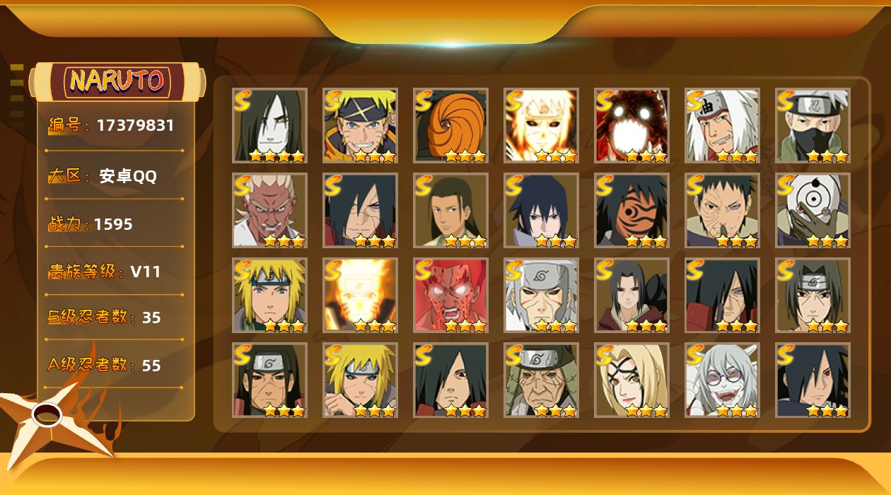 [17379831]35S级忍者数-55A级忍者数 【S级忍者】:长门「秽土转生」(3星),猿飞日斩「秽土转生」(3星),波风水门「秽土转生」(3星),千手扉间「秽土转生」(3星),千手柱间「秽土转生」(3星),宇智波鼬「秽土转生」(3星),宇智波斑「秽土转生」(3星),宇智波斑「秽土转生·解」(3星),大野木「忍界大战」(3星),宇智波带土「忍界大战」(3星),艾「忍界大战」(3星),宇智波鼬「须佐能乎」(3星),旗木卡卡西「须佐能乎」(3星),宇智波斑「木叶创立」(3星),千手柱间「木叶创立」(3星),自来也(3星),自来也「舞之豪杰」(3星),大蛇丸(4星),自来也「传说中的三忍」(3星),纲手(3星),纲手「百豪」(3星),宇智波斑(3星),波风水门(3星),药师兜「仙人模式」(3星),神秘面具男「红夜之刃」(3星),漩涡鸣人「九喇嘛连结」(3星),迈特凯「死门」(3星),佩恩「天道」(3星),宇智波佐助「永恒万花筒」(3星),宇智波斑 「白面具」(3星宇智波斑「白面具」),大筒木金式(3星),漩涡鸣人「暴怒·第六尾」(3星),波风水门「九喇嘛连结」(3星),宇智波斑「五影会谈」(3星),漩涡鸣人·宇智波佐助(3星) 【A级忍者】:艾「青年」(3星),长门「青年」(2星),波风水门「青年」(2星),波风水门「新春限定」(2星),达鲁伊「博人传」(2星),迪达拉(2星),迪达拉「秽土转生」(2星),大蛇丸「晓」(2星),奇拉比(2星),奇拉比「忍界大战」(2星),飞段(4星),飞段「死司凭血」(3星),干柿鬼鲛(5星),漩涡博人「桃式显现」(3星),漩涡鸣人「仙人模式」(2星),漩涡鸣人「九尾查克拉」(2星),机械鸣人「初始形态」(2星),迈特凯(5星),旗木卡卡西「万花筒写轮眼」(2星),旗木卡卡西「幻之真容」(2星),桃地再不斩「秽土转生」(2星),我爱罗「疾风传」(4星),我爱罗「忍界大战」(2星),蝎(5星),蝎「绯流琥」(2星),小南(2星),小南「新春限定」(2星),小南「夏日泳装」(2星),小南「漂泊浪客」(2星),猿飞阿斯玛(5星),猿飞阿斯玛「秽土转生」(2星),宇智波止水(2星),宇智波鼬(2星),宇智波鼬「新春限定」(2星),宇智波佐助「须佐能乎」(2星),宇智波佐助「万花筒写轮眼」(2星),药师兜「半蛇斗篷」(2星),照美冥「五代目水影」(2星),日向宁