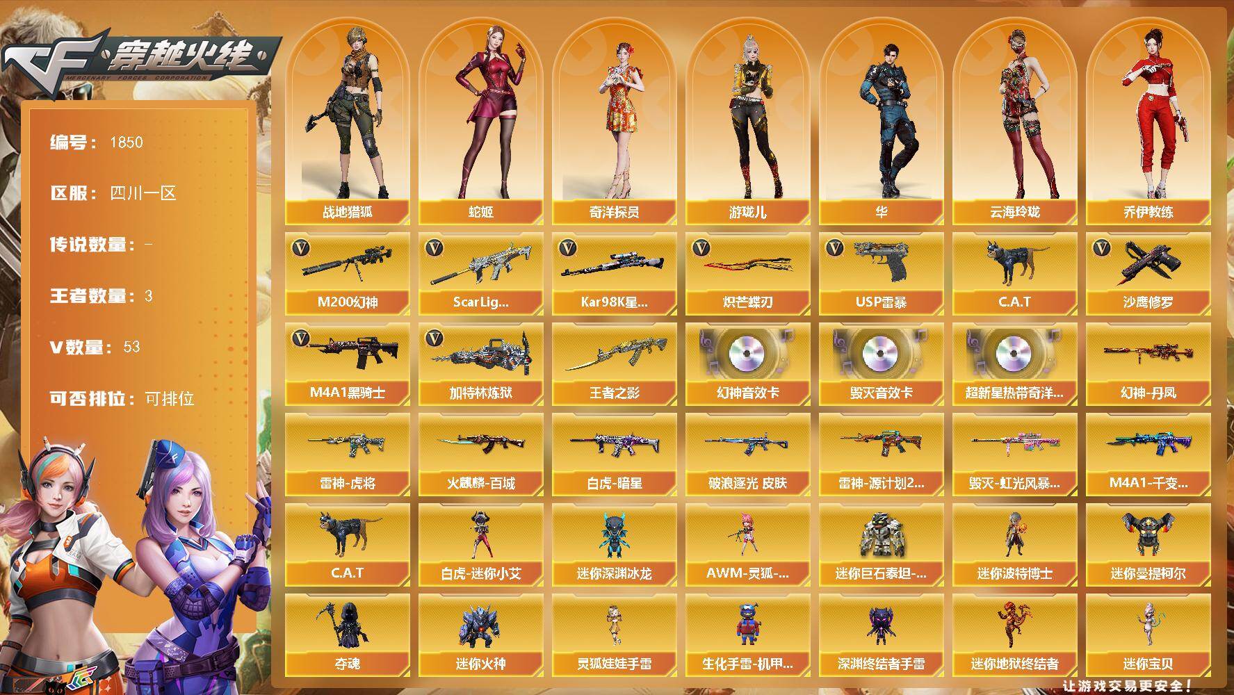 [17460201]四川一区-53V-3王者-0炫金 【热门武器】:Scar Light-白虎,M200-幻神,Kar98K-星神,C.A.T,M4A1-黑骑士*2,加特林-炼狱,USP-雷暴,沙鹰-修罗*3,炽芒蝶刃 【王者炫金武器】:王者之影 【音效卡】:AN94-超新星-热带奇洋音效卡,M200-幻神音效卡,Barrett-毁灭音效卡 【皮肤】:幻神-丹凤,Scar Light-白虎-暗星,金色蔷薇-破浪逐光 皮肤,雷神-虎将,雷神-源计划2.0专属 皮肤,火麒麟-百城,毁灭-虹光风暴 皮肤,M4A1-千变-孔明皮肤 【角色】:樱,华,战地猎狐,王者零-华冠丽服,王者凌霄,奇洋探员,乔伊教练,修道士,云海玲珑,暗夜-X,芳心审判者,飞虎队-X,风暴女,嘉年华灵狐,兰妹妹,猎狐者-追月,灵狐-花神,灵狐者-X,麻雀,潘多拉-X,青霞仙子,蛇姬,铁骑荣耀,雪莉杨-摸金校尉,夜玫瑰-幻能朋克,游珑儿 【人偶武器】:白虎-迷你小艾,迷你宝贝,迷你地狱终结者,AWM-灵狐-15周年嘉年华,C.A.T,迷你深渊冰龙,迷你波特博士,迷你曼提柯尔,夺魂,迷你火种*2,生化手雷-机甲核心*3,深渊终结者手雷,迷你巨石泰坦-魔花研究所,灵狐娃娃手雷*3 【暴走生化】:超级对讲机 【挑战大师】:暴君乱世-超越Max,神圣爆裂者III,冰龙粉碎者-白马银枪*2,激光毁灭者III-白马银枪,VEPR-12-金魔,激光毁灭者III*2,机甲撕裂者III,试炼破坏者III*2,KAC-圣炎切割者III,神圣爆裂者-末日III,阐释者III,惩戒者III 【英雄级武器】:M4A1-黑龙,M4A1-雷神,M4A1-黑骑士*2,Scar Light-白虎,王者之城-觉醒版,黑骑士-海王,QBZ-03-王者蔷薇-觉醒版,Barrett-毁灭,M200-幻神,Kar98K-星神,加特林-炼狱,烈龙-云海游龙,AA-12-雷霆,沙鹰-修罗*3,沙鹰-天神*3,USP-雷暴,COP-雷霆,天神-动感闪耀,擎天-竞技荣光,炽芒蝶刃,屠龙-动感闪耀*2,擎天-云海游龙,斩神刀-雷暴,高爆手雷-雷霆,高爆手雷-雷暴,高爆手雷-竞技荣光*2,手雷-动感闪耀,高爆手雷-云龙,手雷-云海游龙,闪光弹-雷霆,闪光弹-雷暴,闪光弹-竞技荣光*3,闪光弹-云龙*2,烟雾弹-雷霆,烟雾弹-雷暴,烟雾弹-竞技荣光*2,烟雾弹-云龙,M4A1-