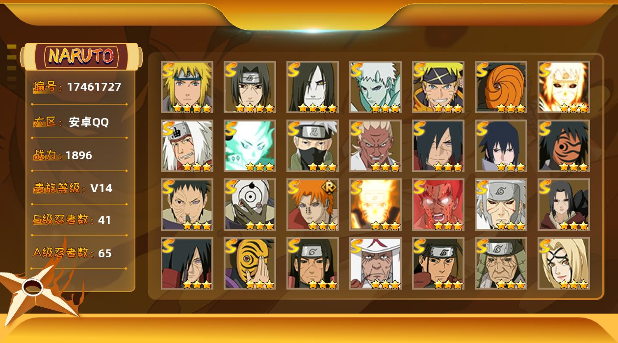 [17461727]41S级忍者数-65A级忍者数 【S级忍者】:长门「秽土转生」(3星),猿飞日斩「秽土转生」(3星),千手扉间「秽土转生」(3星),千手柱间「秽土转生」(3星),宇智波鼬「秽土转生」(3星),宇智波斑「秽土转生」(3星),宇智波斑「秽土转生·解」(3星),大野木「忍界大战」(3星),春野樱「忍界大战」(3星),宇智波带土「忍界大战」(3星),艾「忍界大战」(3星),宇智波鼬「须佐能乎」(4星),旗木卡卡西「须佐能乎」(3星),宇智波斑「木叶创立」(3星),无「二代目土影」(3星),艾「四代目雷影」(3星),罗砂「四代目风影」(3星),鬼灯幻月「二代目水影」(3星),自来也(3星),自来也「舞之豪杰」(3星),大蛇丸(4星),自来也「传说中的三忍」(3星),纲手(3星),纲手「百豪」(3星),千手柱间(3星),猿飞日斩(3星),波风水门(4星),药师兜「仙人模式」(3星),神秘面具男(3星),神秘面具男「红夜之刃」(3星),漩涡鸣人「九喇嘛连结」(3星),迈特凯「死门」(3星),佩恩「天道」(3星),佩恩·天道「超」(3星),宇智波佐助「永恒万花筒」(3星),宇智波斑 「白面具」(3星宇智波斑「白面具」),大筒木舍人「最终章」(3星),波风水门「九喇嘛连结」(3星),宇智波斑「五影会谈」(3星),漩涡鸣人·宇智波佐助(3星),宇智波带土「十尾人柱力」(3星) 【A级忍者】:艾「青年」(2星),长门「青年」(2星),波风水门「青年」(2星),波风水门「新春限定」(2星),达鲁伊「博人传」(2星),达鲁伊(2星),迪达拉(3星),迪达拉「秽土转生」(2星),大蛇丸「晓」(2星),奇拉比(2星),奇拉比「忍界大战」(2星),飞段(4星),飞段「死司凭血」(3星),干柿鬼鲛(5星),漩涡博人「桃式显现」(3星),漩涡鸣人「仙人模式」(2星),漩涡鸣人「九尾查克拉」(3星),机械鸣人「初始形态」(2星),迈特凯(5星),迈特凯「惊门」(2星),旗木卡卡西(3星),旗木卡卡西「万花筒写轮眼」(2星),桃地再不斩「漂泊武士」(2星),桃地再不斩「秽土转生」(2星),我爱罗「疾风传」(4星),我爱罗「忍界大战」(2星),蝎(5星),蝎「绯流琥」(2星),小南(2星),小南「新春限定」(2星),小南「神驹佑将」(2星),角都「秽土转生」(2星),猿飞阿斯玛(5星),猿飞阿斯玛「秽土转