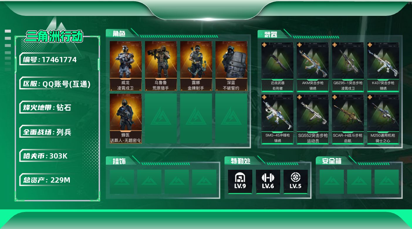 [17461774]【特价出售/店主推荐】229m总资产-303k哈伏币-60烽火等级-钻石-12战场等级-列兵 【干员外观】:威龙-凌霄戍卫,蜂医-送葬人·无题密令,深蓝-不破誓约,露娜-金牌射手,乌鲁鲁-荒原猎手 【近战皮肤】:近战-处刑者1级,近战-黑鹰 【传说外观】:AKM突击步枪-锦绣,QBZ95-1突击步枪-凌霄戍卫,M16A4突击步枪-狩猎时刻,SG552突击步枪-运动员,SCAR-H战斗步枪-启航,G3战斗步枪-狩猎时刻,腾龙突击步枪-捞点薯条,K437突击步枪-锦绣,Vector冲锋枪-狩猎时刻,SMG-45冲锋枪-锦绣,725双管霰弹枪-送葬人-无题密令,M250通用机枪-骑士之心,M14射手步枪-电锯惊魂,M14射手步枪-蛮荒,AWM狙击步枪-捞点薯条,93R-捞点薯条,复合弓-黑·天际线 【史诗外观】:ASh-12战斗步枪-无极限,K416突击步枪-腊梅,K416突击步枪-阿萨拉特攻,M16A4突击步枪-竞赛选手,AUG突击步枪-蝮蛇,M7战斗步枪-百步穿杨,SG552突击步枪-哈夫克警备,SCAR-H战斗步枪-囚徒,G3战斗步枪-流沙送葬,G3战斗步枪-哈夫克警备,AS Val突击步枪-典狱官,AS Val突击步枪-百步穿杨,腾龙突击步枪-无垢,腾龙突击步枪-猎鳄行动,K437突击步枪-守护者,K437突击步枪-丛影谍踪,MP5冲锋枪-战术竞备,MP5冲锋枪-竞技风,Vector冲锋枪-猎鳄行动,Vector冲锋枪-百步穿杨,SR-3M紧凑突击步枪-荒野求生,SR-3M紧凑突击步枪-战术竞备,SR-3M紧凑突击步枪-开工大吉,勇士冲锋枪-深海恐惧,勇士冲锋枪-工业狂潮,勇士冲锋枪-丛影谍踪,MP7冲锋枪-无垢,MP7冲锋枪-守护者,MP7冲锋枪-六套之力,PKM通用机枪-荒野求生,PKM通用机枪-阿萨拉特攻,M249轻机枪-丛影谍踪,QJB201轻机枪-炽焰,QJB201轻机枪-Old Habits,Mini-14射手步枪-守护者,VSS射手步枪-丛影谍踪,SVD狙击步枪-荒野求生,M14射手步枪-工业狂潮,PSG-1射手步枪-无垢,SV-98狙击步枪-林中猎手,SV-98狙击步枪-囚徒,M700狙击步枪-百步穿杨,AWM狙击步枪-无极限,AWM狙击步枪-流沙送葬,复合弓-守护者 【稀有外观】:M4A1突击步枪-繁盛,AKM突击步枪-战术演练,AKM突击步枪