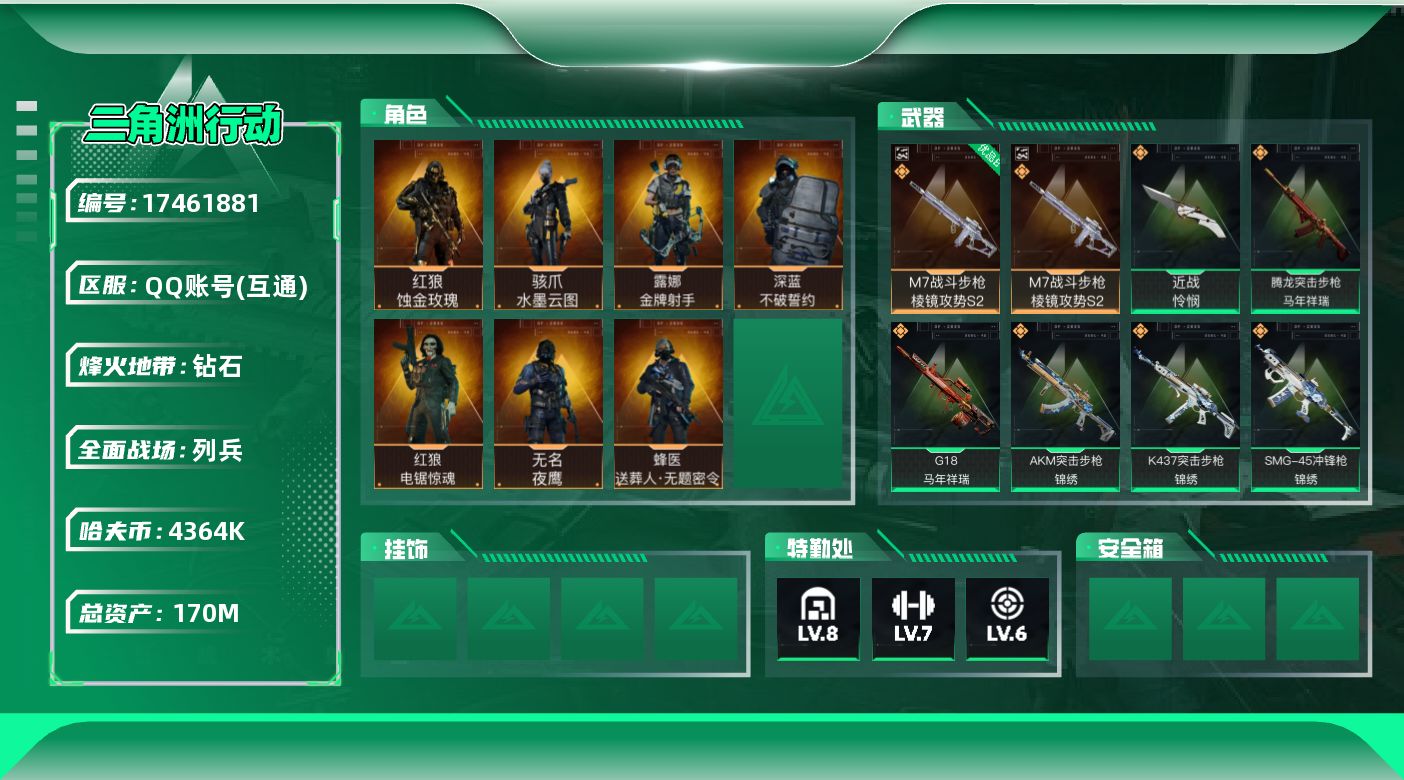 - [17574702]【特价出售/店主推荐】100m总资产-3642k哈伏币-60烽火等级-黑鹰-16战场等级-上等兵 【近战皮肤】:近战-处刑者4级,近战-黑鹰 【载具外观】:轮式突击炮-荣耀 【稀有外观】:SR-3M紧凑突击步枪-巨兽,M14射手步枪-巨兽,PSG-1射手步枪-休闲时光,AKM突击步枪-肃杀,K416突击步枪-一帆风顺,SG552突击步枪-马年新春,SG552突击步枪-贴花艺术, AK-12突击步枪-马年新春,SCAR-H战斗步枪-荣耀列队,CAR-15突击步枪-来财,K437突击步枪-生存指令,KC17突击步枪-来财,MK47突击步枪-精英联盟,MP5冲锋枪-弄臣,Vector冲锋枪-先锋,UZI冲锋枪-亚特兰蒂斯,SMG-45冲锋枪-行动开启,SMG-45冲锋枪-幻影结构,SMG-45冲锋枪-精英联盟,SR-3M紧凑突击步枪-马年新春,勇士冲锋枪-冰天雪地,M249轻机枪-冰天雪地,QJB201轻机枪-哈夫克卫队,Mini-14射手步枪-荣耀列队,Mini-14射手步枪-来财,SKS射手步枪-弄臣,SV-98狙击步枪-星链科技,SV-98狙击步枪-哈夫克航天,SV-98狙击步枪-精英联盟,QSZ92G-一帆风顺,G18-精英联盟 【史诗外观】:K416突击步枪-腊梅,K416突击步枪-阿萨拉特攻,AUG突击步枪-蝮蛇,SG552突击步枪-哈夫克警备,腾龙突击步枪-猎鳄行动,K437突击步枪-丛影谍踪,KC17突击步枪-缄默情歌,MP5冲锋枪-竞技风,SMG-45冲锋枪-阿萨拉特攻,SR-3M紧凑突击步枪-开工大吉,勇士冲锋枪-丛影谍踪,MP7冲锋枪-六套之力,PKM通用机枪-阿萨拉特攻,M249轻机枪-丛影谍踪,QJB201轻机枪-炽焰,VSS射手步枪-丛影谍踪,SV-98狙击步枪-猎鳄行动,M700狙击步枪-竞技风,沙漠之鹰-曙光 【挂饰】:挂饰-崩岩重炮*3,挂饰-暗行哨兵*4,挂饰-福禄*3,挂饰-聚宝盆*4,挂饰-卡皮巴拉,挂饰-锦绣,挂饰-汤圆,挂饰-北非蛋,挂饰-饺子,挂饰-悠然茶歇,挂饰-紧急撤离*29,挂饰-麻将*23 【普通外观】:M7战斗步枪-噬菌体,M4A1突击步枪-粉色涂装,M4A1突击步枪-高雅黑,M4A1突击步枪-海色,QBZ95-1突击步枪-海浪,QBZ95-1突击步枪-三角洲力量,QBZ95-1突击步枪-2026,K416突击步枪