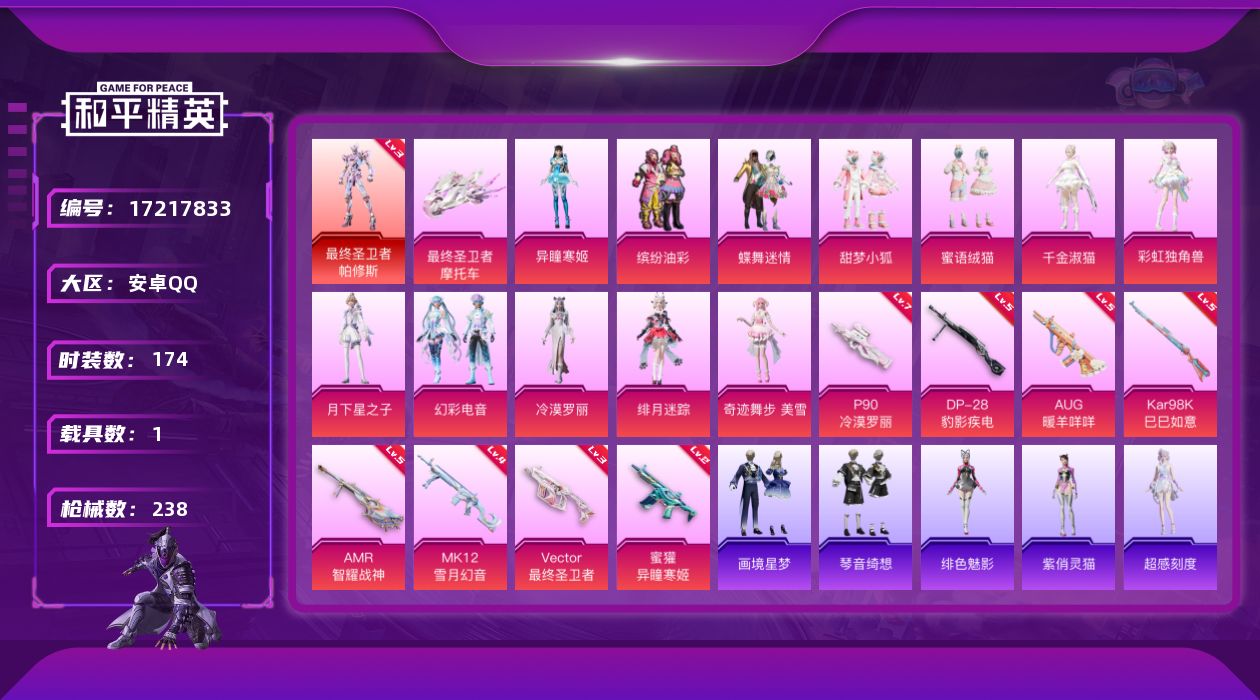 [17217833]安卓 手Q-1神装-12粉装-8特效枪-1载具-5粉色飞行器-77392热力值-11王牌印记-174套装-238枪皮