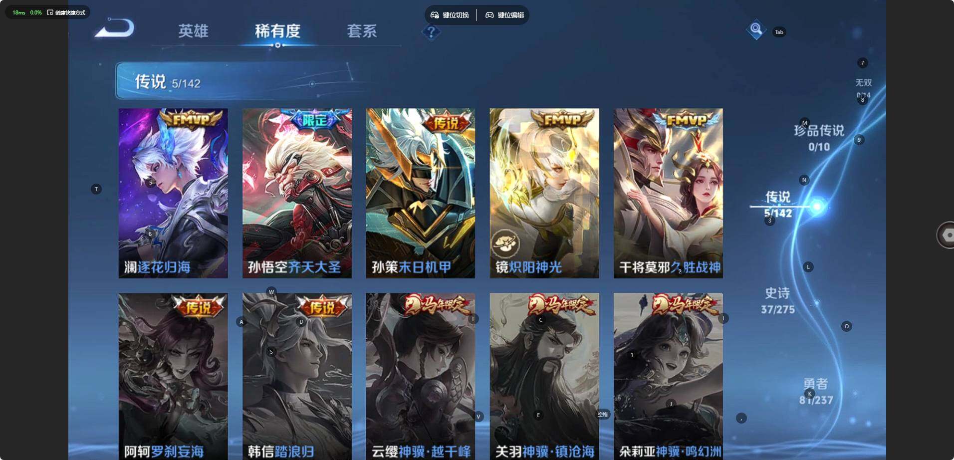 - PX_2103051-Q/至尊星耀/252皮肤/125英雄/2典藏/0珍品无双/1无双/4珍品传说/15传说/69史诗/9稀有英雄 【4 珍品传说】朽木白哉 暃,黑崎一护 宫本武藏,怪盗基德 马可波罗,江户川柯南 鲁班七号, 【2 典藏皮肤】鸣剑·曳影 李白,星域神启 诸葛亮, 【1 无双皮肤】器灵·螭龙剑 曜, 【15 传说皮肤】胖达荣荣 梦奇,启明星使 虞姬,逐花归海 澜,无双飞将 马超,诗剑