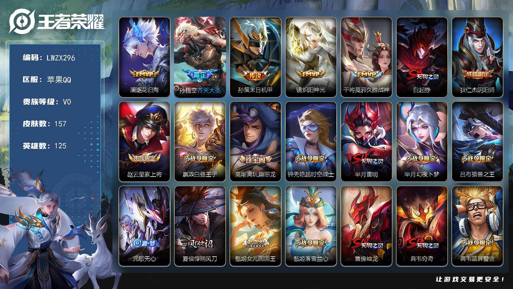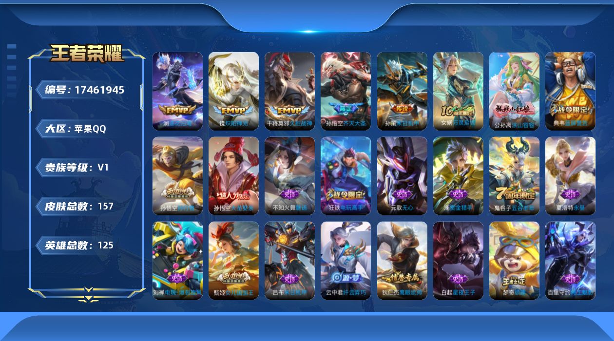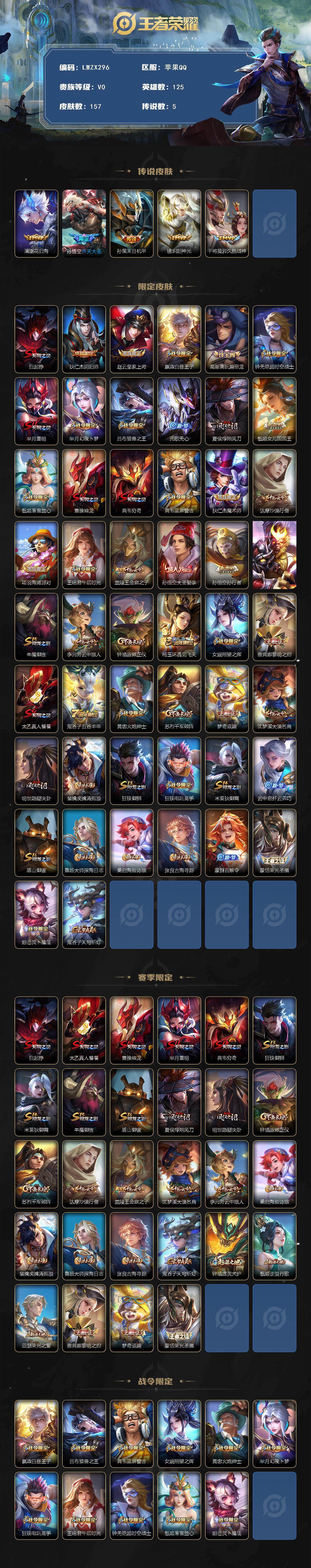 [17461945]苹果Q-V0-永恒钻石II段位-125英雄-157皮肤-5传说-37史诗
