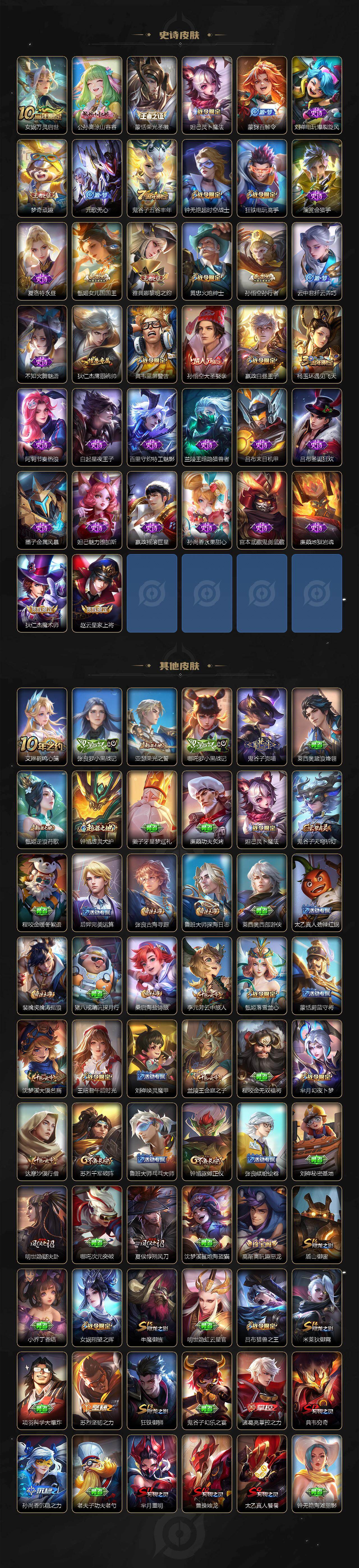 【史诗皮肤】:女娲万灵启世,公孙离涂山容容,蒙恬荣光圣徽,妲己灵卜魔法,蒙犽百解令,刘禅电玩爆裂旋风,梦奇顽趣,元歌无心,鬼谷子五谷丰年,钟无艳超时空战士,狂铁电玩高手,澜赏金猎手,夏洛特永昼,甄姬女儿国国王,雅典娜黎明之约,黄忠火炮绅士,孙悟空孙行者,云中君纤云弄巧,不知火舞魅语,狄仁杰鹰眼统帅,典韦蓝屏警告,孙悟空大圣娶亲,嬴政白昼王子,杨玉环遇见飞天,阿轲节奏热浪,白起星夜王子,百里守约特工魅影,兰陵王暗隐猎兽者,吕布末日机甲,吕布圣诞狂欢,墨子金属风暴,妲己魅力维加斯,嬴政摇滚巨星,孙尚香水果甜心,宫本武藏鬼剑武藏,廉颇地狱岩魂,狄仁杰魔术师,赵云皇家上将