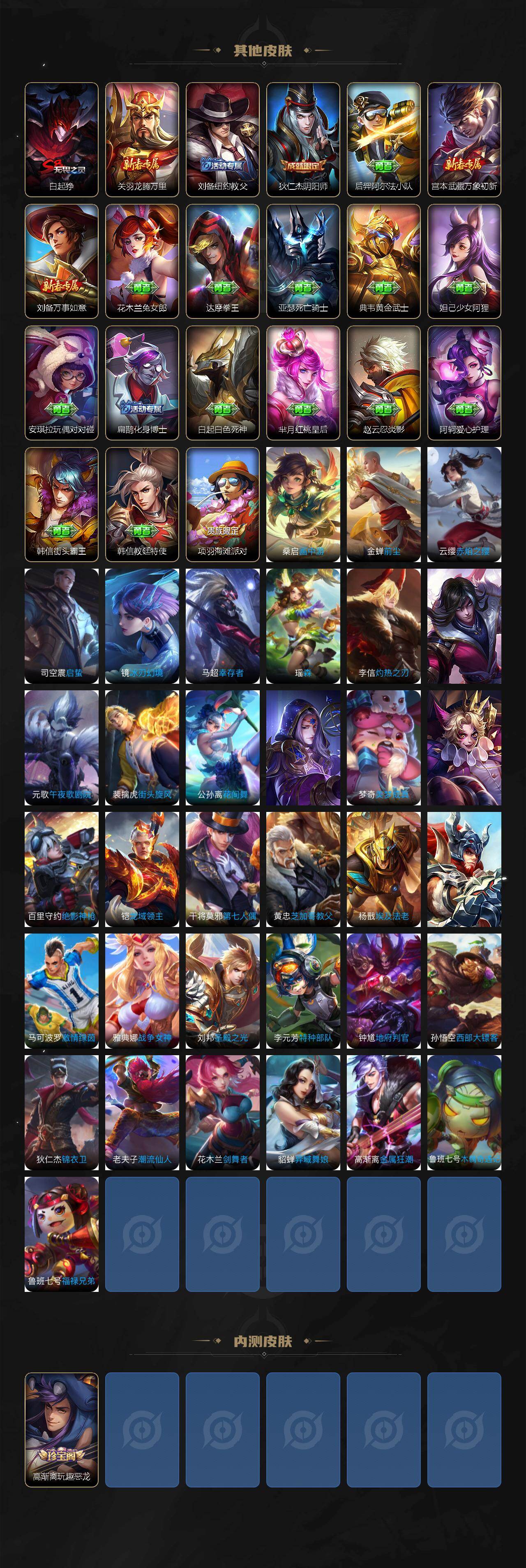 【限定皮肤】:白起狰,狄仁杰阴阳师,赵云皇家上将,嬴政白昼王子,高渐离玩趣恶龙,钟无艳超时空战士,芈月重明,芈月幻夜卜梦,吕布猎兽之王,元歌无心,夏侯惇朔风刀,甄姬女儿国国王,甄姬落雪兰心,曹操烛龙,典韦穷奇,典韦蓝屏警告,狄仁杰魔术师,达摩沙漠行僧,项羽海滩派对,王昭君午后时光,兰陵王金庭之子,孙悟空大圣娶亲,孙悟空孙行者,孙悟空齐天大圣,牛魔御旌,李元芳云中旅人,钟馗驱傩正仪,杨玉环遇见飞天,女娲朔望之晖,雅典娜黎明之约,太乙真人饕餮,鬼谷子五谷丰年,黄忠火炮绅士,苏烈千军破阵,梦奇顽趣,沈梦溪大漠名商,明世隐疑决卦,裴擒虎擒涛扼浪,狂铁御狮,狂铁电玩高手,米莱狄御霄,云中君纤云弄巧,盾山御銮,鲁班大师探海日志,桑启海盐诗旅,张良古海寻踪,蒙犽百解令,蒙恬荣光圣徽,妲己灵卜魔法,鬼谷子天穹祈灯