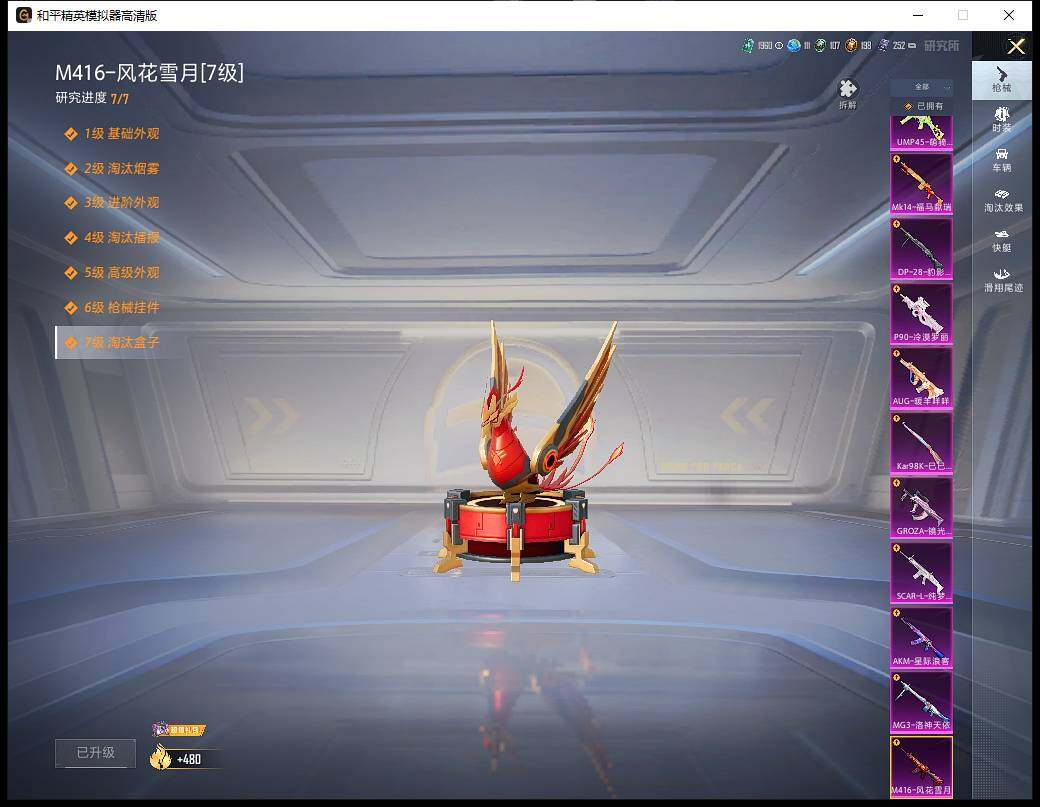【粉色枪皮等级】:AKM-星际浪客(六级),SCAR-L-纯梦嫁纱(七级),M416-风花雪月(七级),GROZA-镜光银凌(五级),AUG-暖羊咩咩(五级),UMP45-萌骑冒险(五级),P90-冷漠罗丽(七级),Kar98K-巳巳如意(五级),Mk14-福马献瑞(三级),DP-28-豹影疾电(五级),MG3-洛神天依(七级)