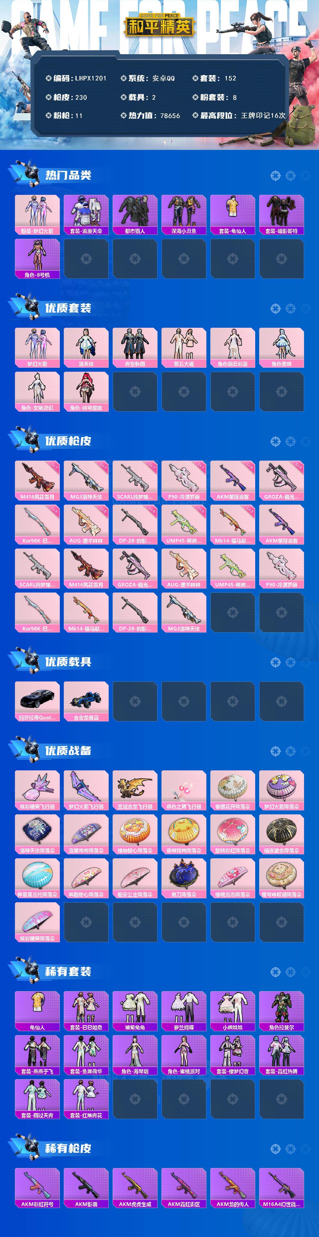 [17461961]安卓 手Q-8粉装-11特效枪-2载具-4粉色飞行器-78656热力值-16王牌印记-152套装-230枪皮 【热门品类】:粉装-梦幻火箭,套装-浪漫天命,套装-都市猎人,套装-深海小丑鱼,套装-龟仙人,套装-暗影哥特,角色-8号机 【粉色套装】:粉装-梦幻火箭,角色-洛天依,粉装-青空秋雨,粉装-第五大道,角色-烟云彩露,角色-美琪,角色-女娲灵识,角色-绯穹魔姬 【粉色枪皮等级】:AKM-星际浪客(六级),SCAR-L-纯梦嫁纱(七级),M416-风花雪月(七级),GROZA-镜光银凌(五级),AUG-暖羊咩咩(五级),UMP45-萌骑冒险(五级),P90-冷漠罗丽(七级),Kar98K-巳巳如意(五级),Mk14-福马献瑞(三级),DP-28-豹影疾电(五级),MG3-洛神天依(七级) 【粉色载具】:玛莎拉蒂Quattroporte(夜幕蓝),合金龙骨(蓝) 【粉色枪皮】:AKM-星际浪客,SCAR-L-纯梦嫁纱,M416-风花雪月,GROZA-镜光银凌,AUG-暖羊咩咩,UMP45-萌骑冒险,P90-冷漠罗丽,Kar98K-巳巳如意,Mk14-福马献瑞,DP-28-豹影疾电,MG3-洛神天依 【粉色飞行器】:炫彩糖果飞行器,梦幻火箭飞行器,圣域金龙飞行器,暮色之舞飞行器 【粉色降落伞】:春暖花开降落伞,梦幻火箭降落伞,洛神天依降落伞,流星咚咚降落伞,橘柚倾心降落伞,垂柳戏鸭降落伞,旋转彩虹降落伞,暗夜鎏金降落伞,仲夏莫吉托降落伞,飒粉甜心降落伞,临安公主降落伞,鬼刀降落伞,樱桃泡泡降落伞,星穹咏叹调降落伞,炫彩糖果降落伞 【稀有套装】:套装-龟仙人,套装-巳巳如意,套装-雪国风尚,套装-炫彩糖果,套装-雏菊兔兔,套装-萝兰蝴蝶,套装-小熊娃娃,角色-拉斐尔,套装-燕燕于飞,套装-鱼渊荷华,角色-海琴烟,角色-蜜桃派对,套装-樱梦幻音,套装-霓虹热舞,套装-雨过天青,套装-红釉青花 【稀有枪皮】:AUG-冰晶雪宝,AKM-彩虹符号,AKM-影袭,AKM-虎虎生威,AKM-霓虹街区,AKM-龙的传人,M16A4-幻世战舞者,SCAR-L-玉兔迎春,SCAR-L-甜蜜誓约,M416-糯团青竹,M416-红色方程式,M416-蓝色火焰,GROZA-异彩先驱,GROZA-影袭,GROZA-懵萌河马,GROZA-春暖花开,GROZA-田园牧歌,GROZA-蓝莓炮弹,A