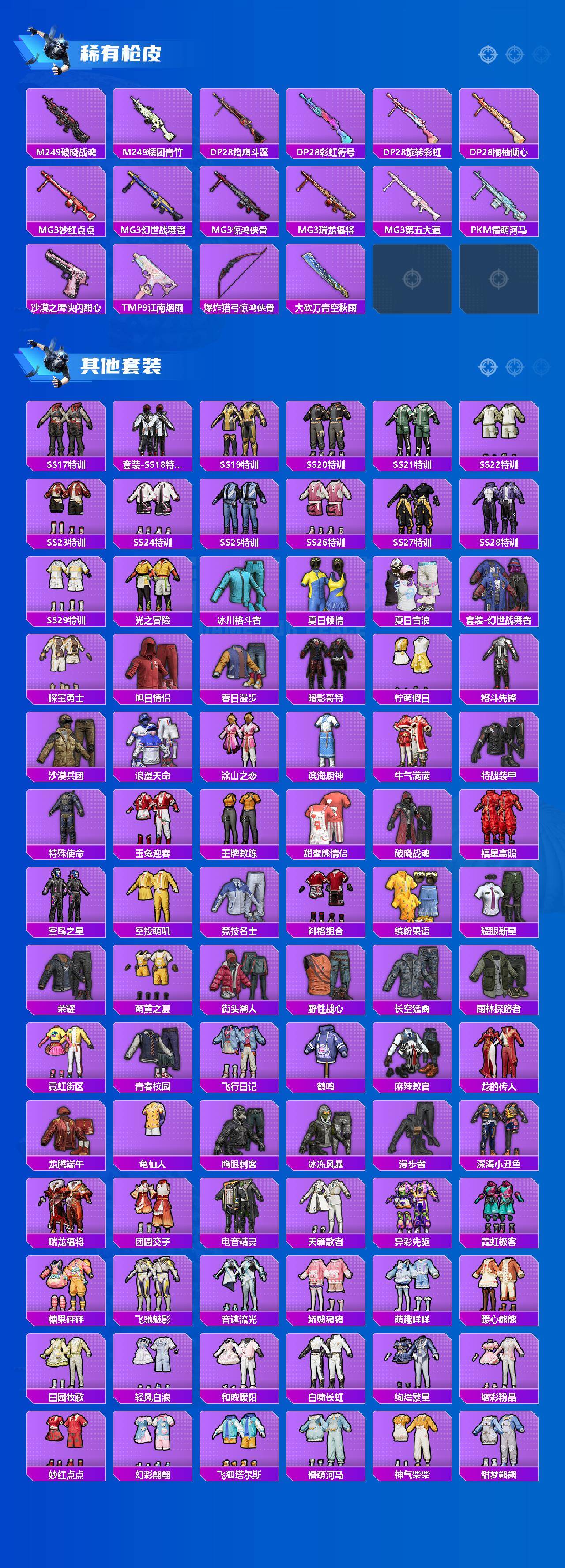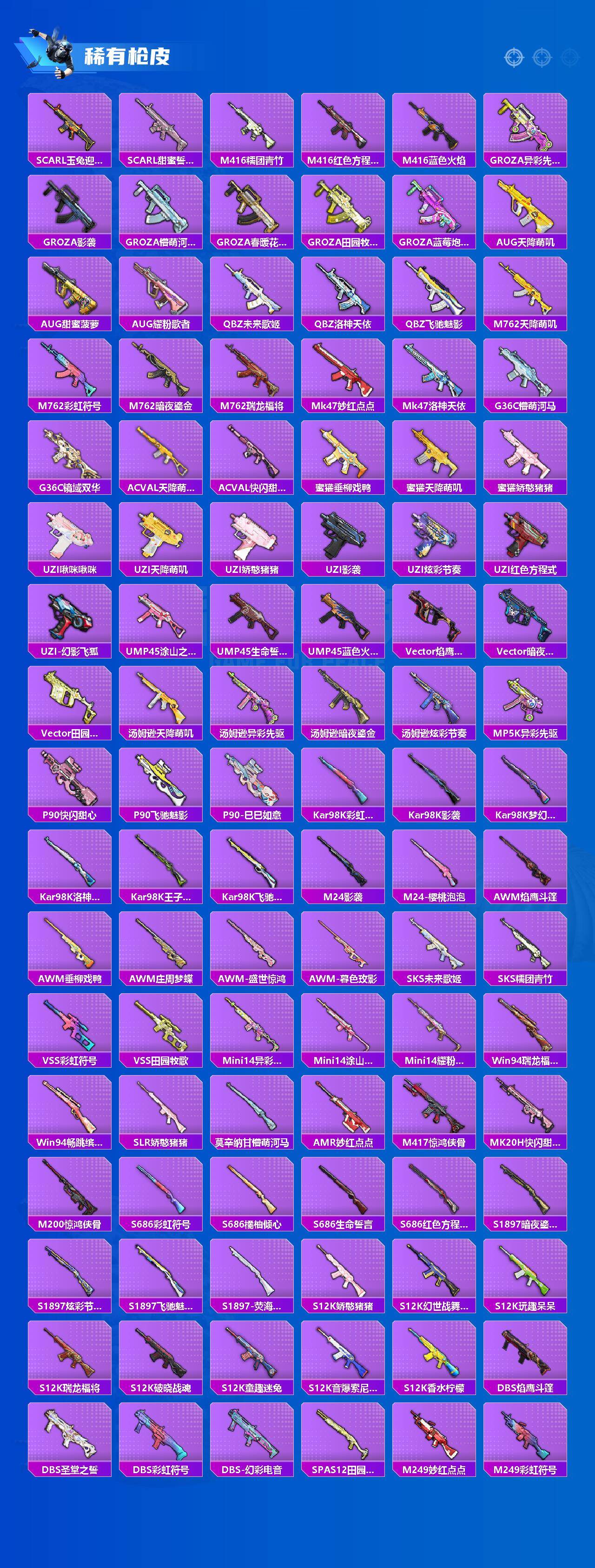 【粉色枪皮】:AKM-星际浪客,SCAR-L-纯梦嫁纱,M416-风花雪月,GROZA-镜光银凌,AUG-暖羊咩咩,UMP45-萌骑冒险,P90-冷漠罗丽,Kar98K-巳巳如意,Mk14-福马献瑞,DP-28-豹影疾电,MG3-洛神天依