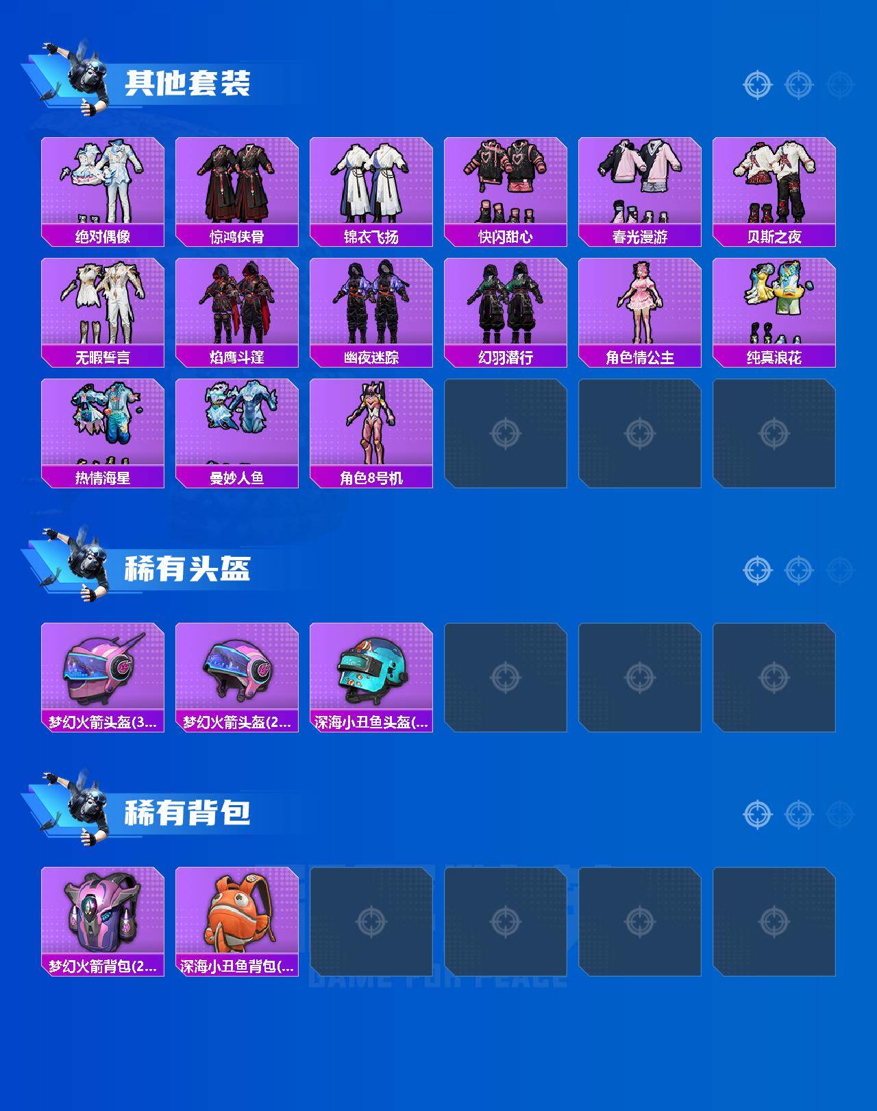 【热门品类】:粉装-梦幻火箭,套装-浪漫天命,套装-都市猎人,套装-深海小丑鱼,套装-龟仙人,套装-暗影哥特,角色-8号机