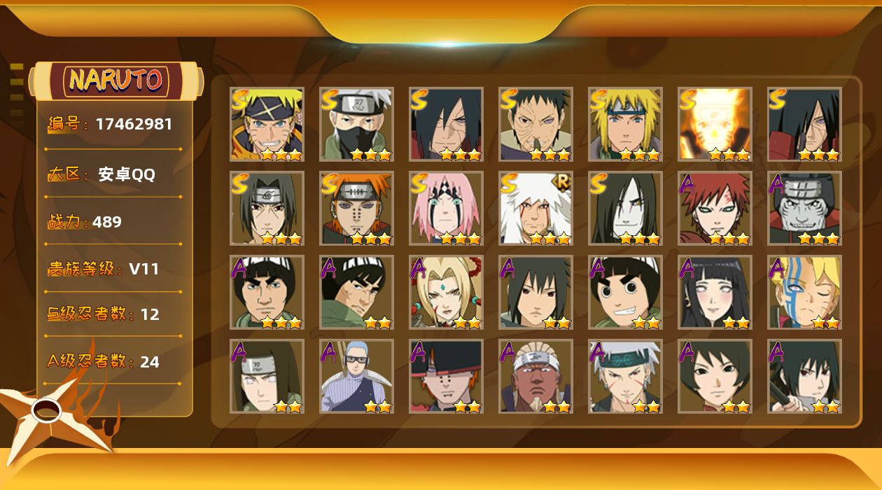 【S级忍者】:宇智波斑「秽土转生」(3星),宇智波斑「秽土转生·解」(3星),春野樱「忍界大战」(3星),宇智波带土「忍界大战」(3星),宇智波鼬「须佐能乎」(3星),旗木卡卡西「须佐能乎」(3星),自来也「舞之豪杰」(3星),大蛇丸(3星),波风水门(3星),漩涡鸣人「九喇嘛连结」(3星),佩恩「天道」(3星),漩涡鸣人·宇智波佐助(3星)