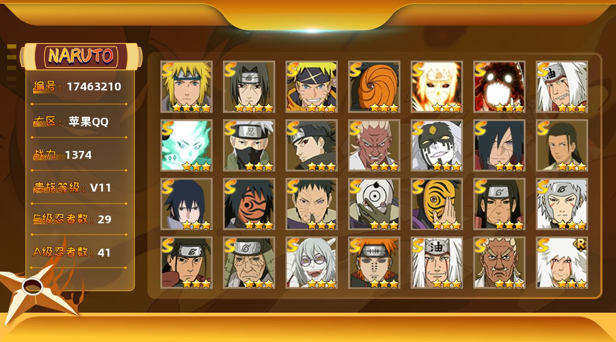 【S级忍者】:猿飞日斩「秽土转生」(3星),千手柱间「秽土转生」(3星),宇智波斑「秽土转生·解」(3星),宇智波带土「忍界大战」(3星),艾「忍界大战」(3星),宇智波鼬「须佐能乎」(4星),宇智波止水「须佐能乎」(3星),旗木卡卡西「须佐能乎」(3星),千手柱间「木叶创立」(3星),艾「四代目雷影」(3星),自来也(3星),自来也「舞之豪杰」(3星),大蛇丸(3星),自来也「传说中的三忍」(3星),千手柱间(3星),千手扉间(3星),波风水门(4星),药师兜「仙人模式」(3星),神秘面具男(3星),神秘面具男「红夜之刃」(3星),佩恩「天道」(3星),宇智波佐助「永恒万花筒」(3星),宇智波斑 「白面具」(3星宇智波斑「白面具」),大筒木桃式(3星),大筒木舍人「最终章」(3星),漩涡鸣人「暴怒·第六尾」(3星),波风水门「九喇嘛连结」(3星),宇智波斑「五影会谈」(3星),漩涡鸣人·宇智波佐助(3星)