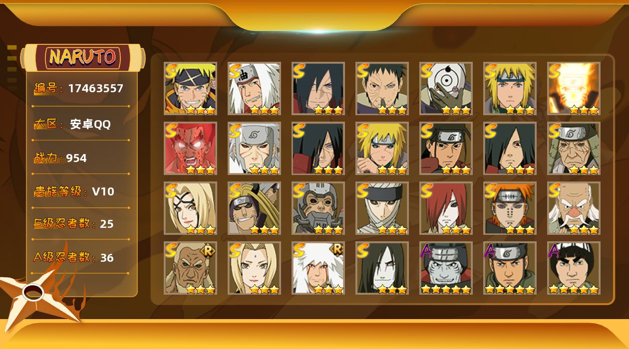 【A级忍者】:艾「青年」(2星),波风水门「青年」(2星),达鲁伊「博人传」(2星),迪达拉(2星),迪达拉「秽土转生」(2星),大蛇丸「晓」(2星),奇拉比(2星),飞段(4星),飞段「死司凭血」(3星),飞段「恶灵之影」(2星),干柿鬼鲛(5星),漩涡博人「桃式显现」(2星),漩涡鸣人「仙人模式」(2星),漩涡鸣人「九尾查克拉」(2星),迈特凯(5星),旗木卡卡西「万花筒写轮眼」(2星),我爱罗「疾风传」(3星),我爱罗「忍界大战」(2星),蝎(4星),角都「地怨虞」(2星),猿飞阿斯玛(5星),宇智波止水(2星),宇智波鼬(2星),宇智波佐助「须佐能乎」(2星),宇智波佐助「万花筒写轮眼」(2星),药师兜「半蛇斗篷」(2星),照美冥「五代目水影」(2星),日向宁次「忍界大战」(2星),李洛克「忍界大战」(2星),猿飞木叶丸「博人传」(2星),黑土「博人传」(2星),春野樱「百豪」(2星),秋道丁次「忍界大战」(2星),千代「近松十人卫」(2星),宇智波泉奈(2星),迈特凯「青春爆炸」(2星)