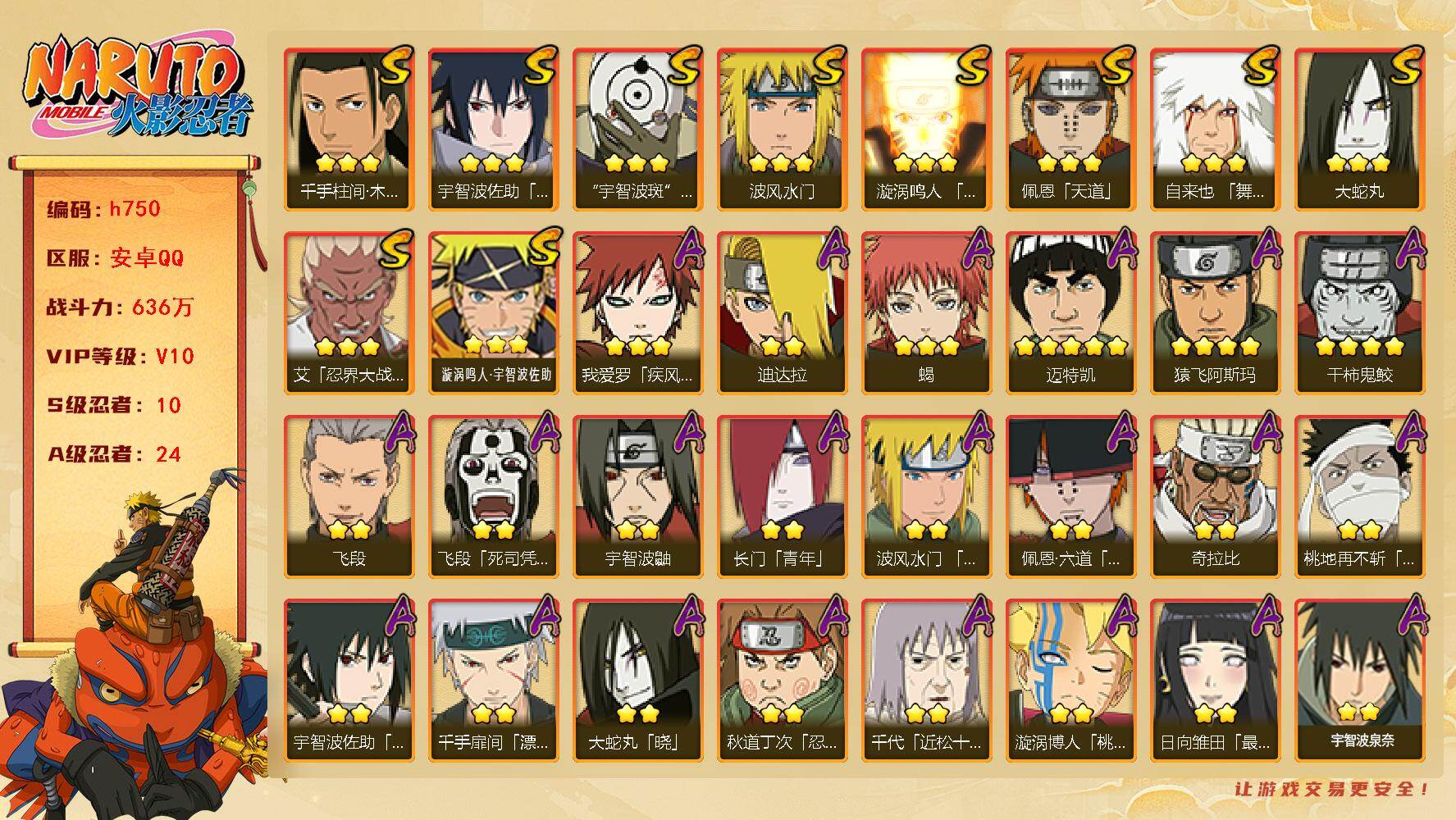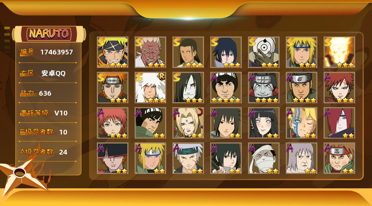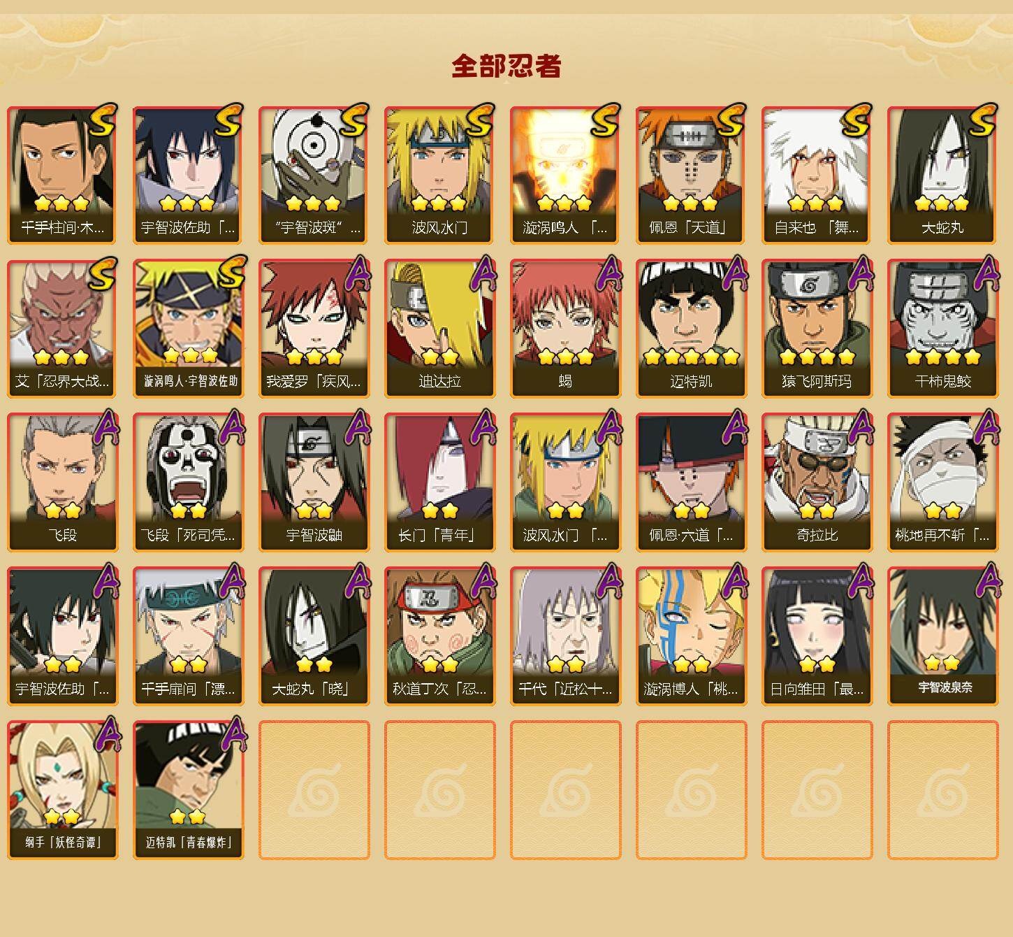 【S级忍者】:艾「忍界大战」(3星),千手柱间「木叶创立」(3星),自来也「舞之豪杰」(3星),大蛇丸(3星),波风水门(3星),漩涡鸣人「九喇嘛连结」(3星),佩恩「天道」(3星),宇智波佐助「永恒万花筒」(3星),宇智波斑 「白面具」(3星宇智波斑「白面具」),漩涡鸣人·宇智波佐助(3星)