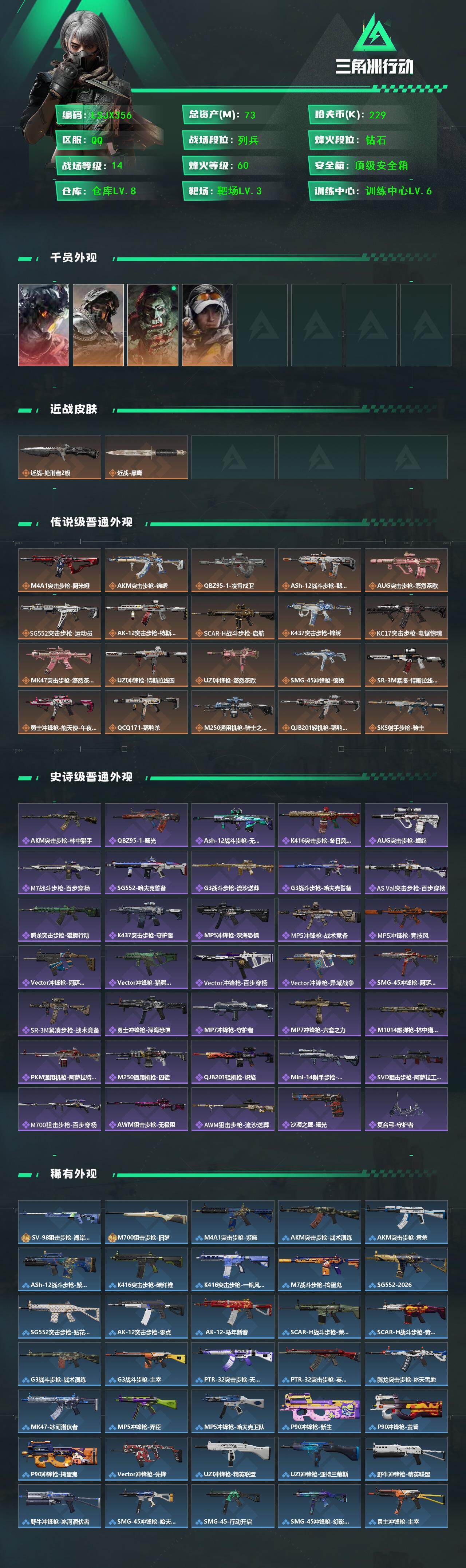 [17464543]【特价出售/店主推荐】73m总资产-229k哈伏币-60烽火等级-钻石-14战场等级-列兵 【干员外观】:威龙-凌霄戍卫,深蓝-不破誓约,红狼-电锯惊魂,露娜-金牌射手 【近战皮肤】:近战-处刑者2级,近战-黑鹰 【传说外观】:M4A1突击步枪-阿米娅,AKM突击步枪-锦绣,QBZ95-1突击步枪-凌霄戍卫,ASh-12战斗步枪-鹅鸭杀,AUG突击步枪-悠然茶歇,SG552突击步枪-运动员,AK-12突击步枪-特斯拉线圈,SCAR-H战斗步枪-启航,K437突击步枪-锦绣,KC17突击步枪-电锯惊魂,MK47突击步枪-悠然茶歇,UZI冲锋枪-特斯拉线圈,UZI冲锋枪-悠然茶歇,SMG-45冲锋枪-锦绣,SR-3M紧凑突击步枪-特斯拉线圈,勇士冲锋枪-能天使-午夜邮差,QCQ171冲锋枪-鹅鸭杀,M250通用机枪-骑士之心,QJB201轻机枪-鹅鸭杀,SKS射手步枪-骑士 【史诗外观】:AKM突击步枪-林中猎手,QBZ95-1突击步枪-曙光,ASh-12战斗步枪-无极限,K416突击步枪-冬日风情,AUG突击步枪-蝮蛇,M7战斗步枪-百步穿杨,SG552突击步枪-哈夫克警备,G3战斗步枪-流沙送葬,G3战斗步枪-哈夫克警备,AS Val突击步枪-百步穿杨,腾龙突击步枪-猎鳄行动,K437突击步枪-守护者,MP5冲锋枪-深海恐惧,MP5冲锋枪-战术竞备,MP5冲锋枪-竞技风,Vector冲锋枪-阿萨拉文明,Vector冲锋枪-猎鳄行动,Vector冲锋枪-百步穿杨,Vector冲锋枪-异域战争,SMG-45冲锋枪-阿萨拉特攻,SR-3M紧凑突击步枪-战术竞备,勇士冲锋枪-深海恐惧,MP7冲锋枪-守护者,MP7冲锋枪-六套之力,M1014霰弹枪-林中猎手,PKM通用机枪-阿萨拉特攻,M250通用机枪-囚徒,QJB201轻机枪-炽焰,Mini-14射手步枪-守护者,SVD狙击步枪-阿萨拉工艺,M700狙击步枪-百步穿杨,AWM狙击步枪-无极限,AWM狙击步枪-流沙送葬,沙漠之鹰-曙光,复合弓-守护者 【稀有外观】:SV-98狙击步枪-海岸线,M700狙击步枪-旧梦,M4A1突击步枪-繁盛,AKM突击步枪-战术演练,AKM突击步枪-肃杀,ASh-12战斗步枪-繁盛,K416突击步枪-碳纤维,K416突击步枪-一帆风顺,M7战斗步枪-捣蛋鬼,SG552突击步枪-2026,SG