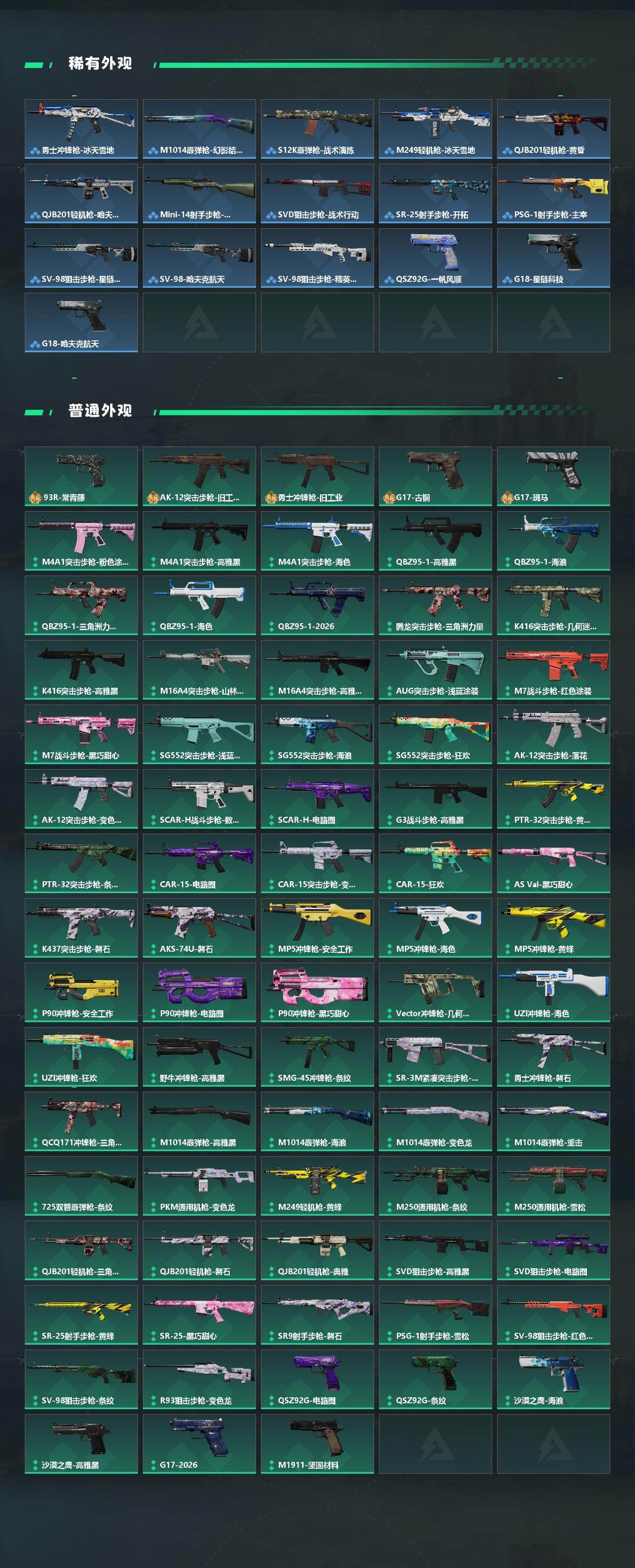 【稀有外观】:SV-98狙击步枪-海岸线,M700狙击步枪-旧梦,M4A1突击步枪-繁盛,AKM突击步枪-战术演练,AKM突击步枪-肃杀,ASh-12战斗步枪-繁盛,K416突击步枪-碳纤维,K416突击步枪-一帆风顺,M7战斗步枪-捣蛋鬼,SG552突击步枪-2026,SG