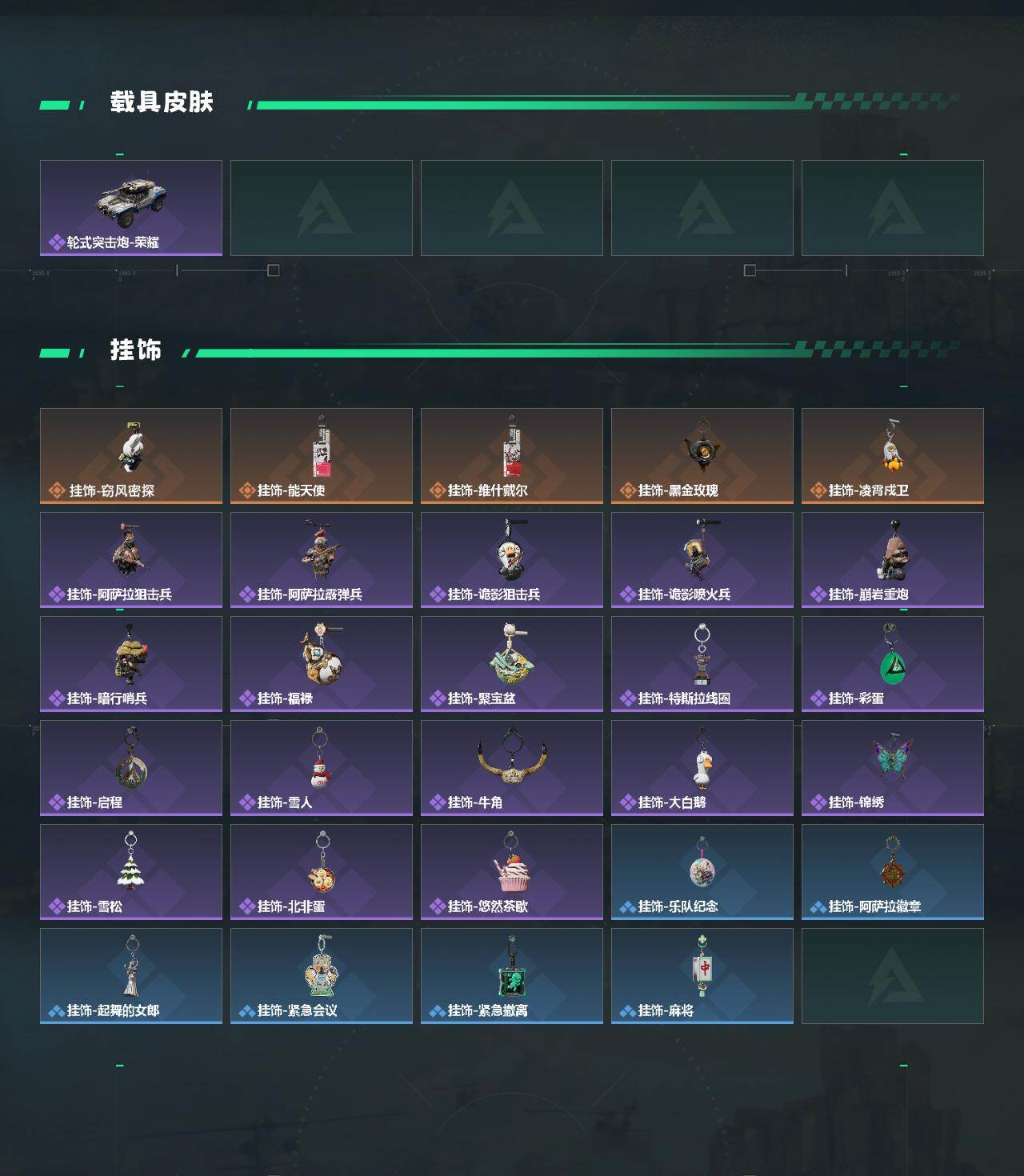 【史诗外观】:AKM突击步枪-林中猎手,QBZ95-1突击步枪-曙光,ASh-12战斗步枪-无极限,K416突击步枪-冬日风情,AUG突击步枪-蝮蛇,M7战斗步枪-百步穿杨,SG552突击步枪-哈夫克警备,G3战斗步枪-流沙送葬,G3战斗步枪-哈夫克警备,AS Val突击步枪-百步穿杨,腾龙突击步枪-猎鳄行动,K437突击步枪-守护者,MP5冲锋枪-深海恐惧,MP5冲锋枪-战术竞备,MP5冲锋枪-竞技风,Vector冲锋枪-阿萨拉文明,Vector冲锋枪-猎鳄行动,Vector冲锋枪-百步穿杨,Vector冲锋枪-异域战争,SMG-45冲锋枪-阿萨拉特攻,SR-3M紧凑突击步枪-战术竞备,勇士冲锋枪-深海恐惧,MP7冲锋枪-守护者,MP7冲锋枪-六套之力,M1014霰弹枪-林中猎手,PKM通用机枪-阿萨拉特攻,M250通用机枪-囚徒,QJB201轻机枪-炽焰,Mini-14射手步枪-守护者,SVD狙击步枪-阿萨拉工艺,M700狙击步枪-百步穿杨,AWM狙击步枪-无极限,AWM狙击步枪-流沙送葬,沙漠之鹰-曙光,复合弓-守护者