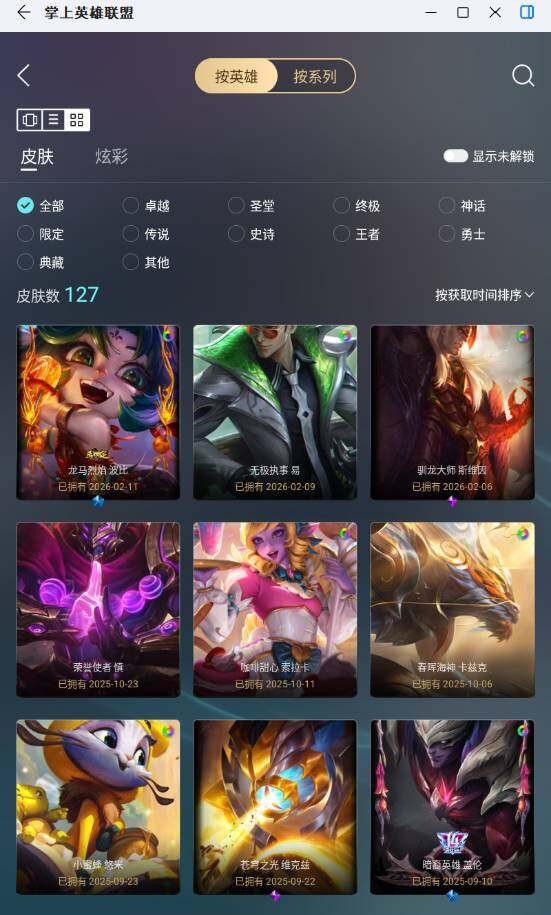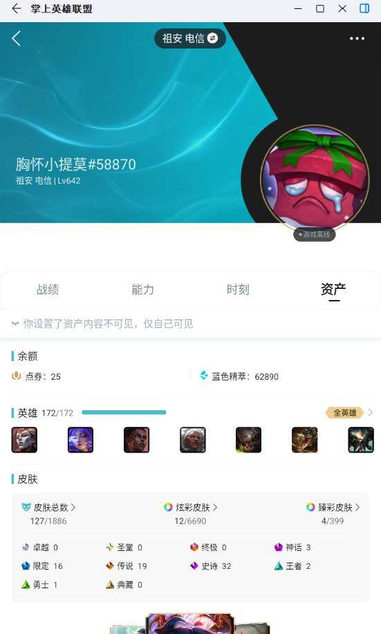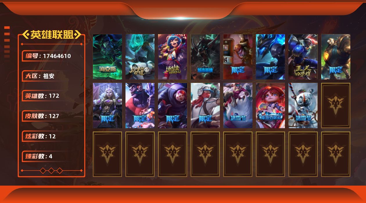 [17464610]未定级段位-172英雄-127皮肤-12炫彩-0终极-3神话-16限定-19传说-32史诗