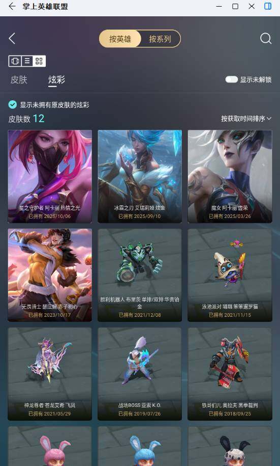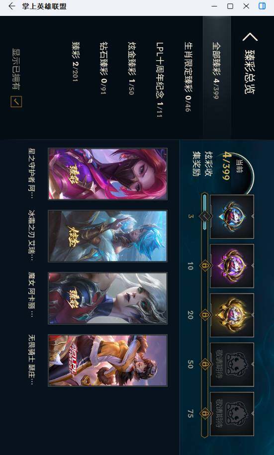 【臻彩皮肤】:无畏骑士瑟庄妮赤子初心,冰霜之刃艾瑞莉娅炫金,星之守护者阿卡丽热情之光,魔女阿卡丽虚荣