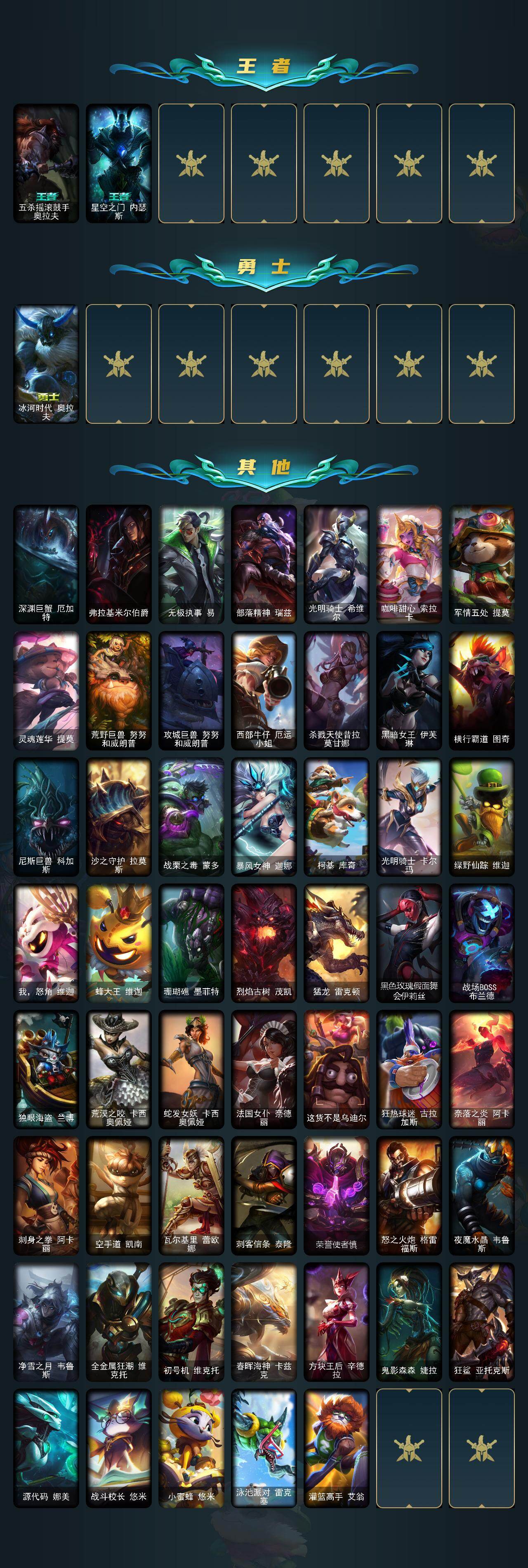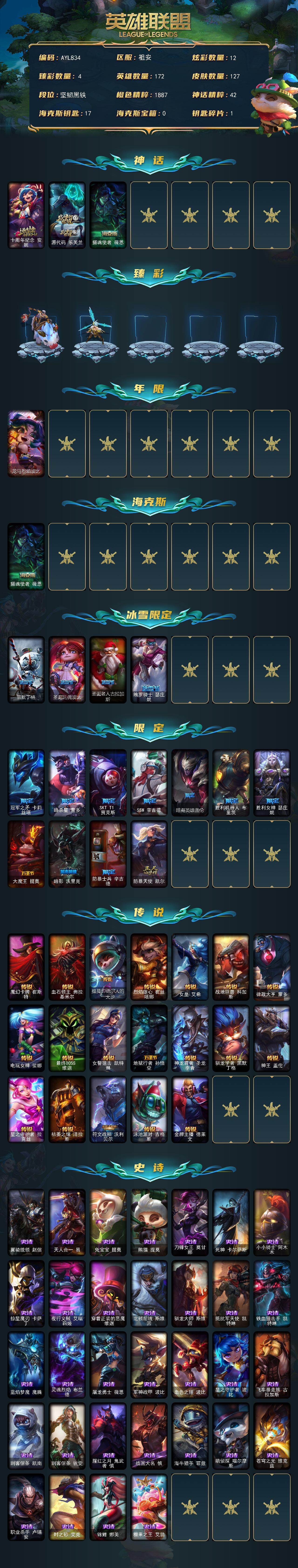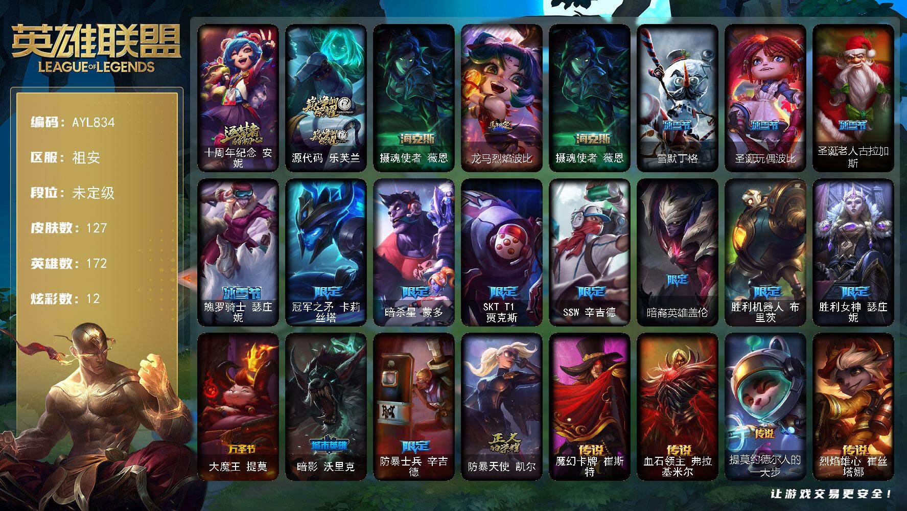 [17464610]未定级段位-172英雄-127皮肤-12炫彩-0终极-3神话-16限定-19传说-32史诗 【神话皮肤】:十周年纪念安妮,源代码乐芙兰,摄魂使者薇恩 【臻彩皮肤】:无畏骑士瑟庄妮赤子初心,冰霜之刃艾瑞莉娅炫金,星之守护者阿卡丽热情之光,魔女阿卡丽虚荣 【年限皮肤】:龙马烈焰波比 【海克斯皮肤】:摄魂使者薇恩 【冰雪限定】:雪默丁格,圣诞玩偶波比,圣诞老人古拉加斯,魄罗骑士瑟庄妮 【限定皮肤】:冠军之矛卡莉丝塔,暗杀星蒙多,SKTT1贾克斯,SSW辛吉德,暗裔英雄盖伦,胜利机器人布里茨,胜利女神瑟庄妮,大魔王提莫,暗影沃里克,防暴士兵辛吉德,防暴天使凯尔 【传说皮肤】:魔幻卡牌崔斯特,血石领主弗拉基米尔,提莫约德尔人的一大步,烈焰雄心崔丝塔娜,女皇艾希,战地巨兽科加斯,律政大亨蒙多,电玩女神娑娜,最终BOSS维迦,女警狙击凯特琳,地狱行者孙悟空,神龙尊者圣龙李青,驯龙学者黑默丁格,神王盖伦,星之守护者拉克丝,枯萎之壤泽拉斯,符文战熊沃利贝尔,泳池派对吉格斯,金牌主播德莱文 【史诗皮肤】:翼骑统领赵信,天人合一易,兔宝宝提莫,熊猫提莫,刀锋女王莫甘娜,死神卡尔萨斯,小小骑士阿木木,掠星魔刃卡萨丁,夜行义贼艾瑞莉娅,穿着正装的恶魔维迦,北领前线斯维因,驯龙大师斯维因,抵抗军天使凯特琳,铁血狙击手凯特琳,蓝焰梦魔魔腾,灵魂烈焰布兰德,屠龙勇士薇恩,军神战甲波比,血色之锤波比,星之守护者波比,飞车暴走族古拉加斯,刺客信条凯南,刺客信条锐雯,腥红之月鬼武者慎,战国大名慎,海牛猎手菲兹,萌侦探喵尔摩斯,苍穹之光维克兹,职业杀手卢锡安,时之砂艾克,锦鲤娜美,糖果之王艾翁 【王者皮肤】:五杀摇滚鼓手奥拉夫,星空之门内瑟斯 【勇士皮肤】:冰河时代奥拉夫 【其他皮肤1】:深渊巨蟹厄加特,弗拉基米尔伯爵,无极执事易,部落精神瑞兹,光明骑士希维尔,咖啡甜心索拉卡,军情五处提莫,灵魂莲华提莫,荒野巨兽努努和威朗普,攻城巨兽努努和威朗普,西部牛仔厄运小姐,杀戮天使昔拉莫甘娜,黑暗女王伊芙琳,横行霸道图奇,尼斯巨兽科加斯,沙之守护拉莫斯,战栗之毒蒙多,暴风女神迦娜,柯基库奇,光明骑士卡尔玛,绿野仙踪维迦,我怒角维迦,蜂大王维迦,珊瑚礁墨菲特,烈焰古树茂凯,猛龙雷克顿,黑色玫瑰假面舞会伊莉丝,战场BOSS布兰德,独眼海盗兰博,荒漠之咬卡西奥佩娅,蛇发女妖卡西奥佩娅,法国女仆奈德丽,这货不是乌迪尔,