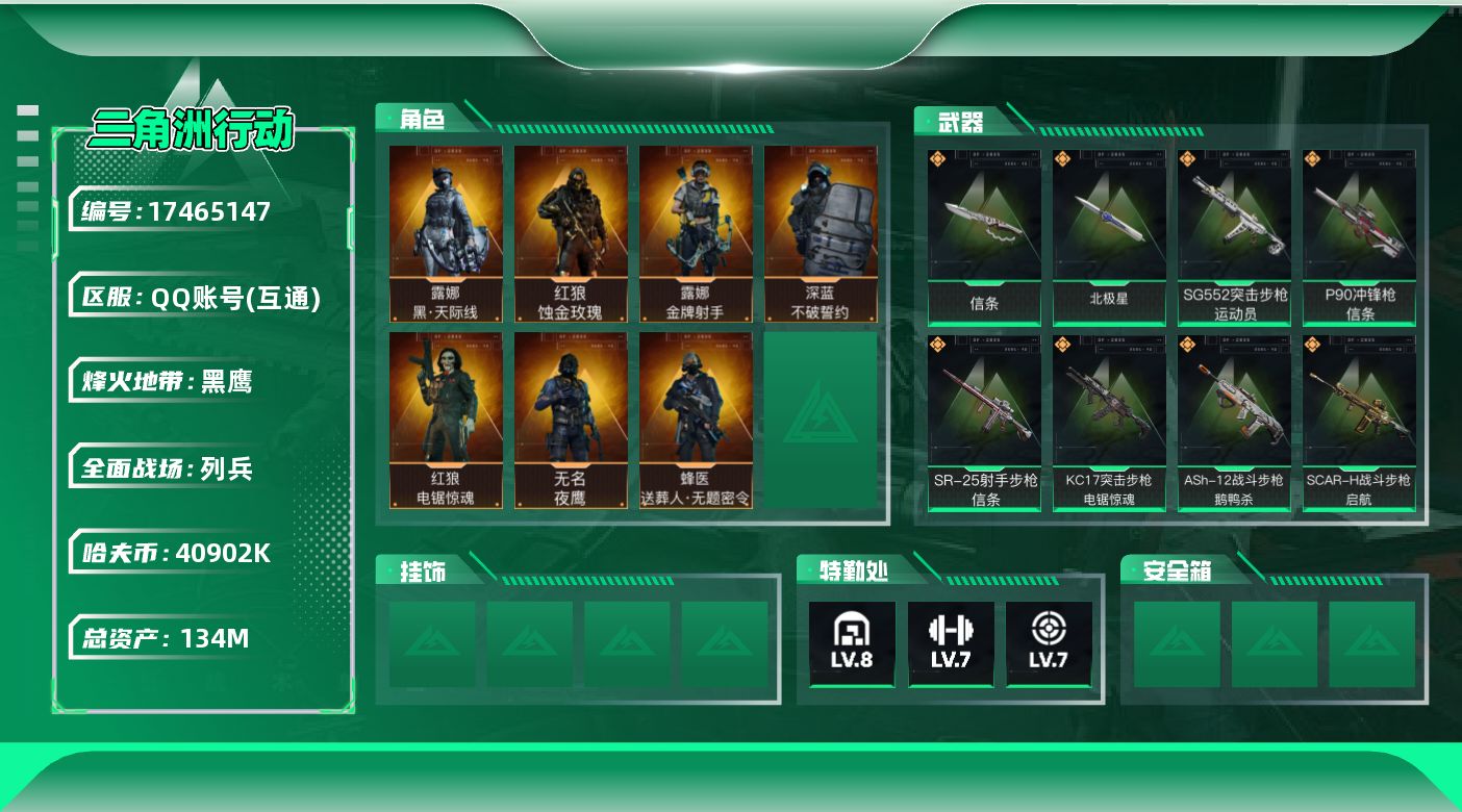 [17465147]134m总资产-40902k哈伏币-60烽火等级-黑鹰-15战场等级-列兵 【干员外观】:红狼-蚀金玫瑰,露娜-黑·天际线,蜂医-送葬人·无题密令,无名-夜鹰,深蓝-不破誓约,红狼-电锯惊魂,露娜-金牌射手 【近战皮肤】:近战-北极星,近战-信条,近战-黑鹰 【传说外观】:M4A1突击步枪-蚀金玫瑰,M4A1突击步枪-阿米娅,ASh-12战斗步枪-鹅鸭杀,SG552突击步枪-运动员,AK-12突击步枪-夜鹰,AK-12突击步枪-特斯拉线圈,SCAR-H战斗步枪-水墨云图,SCAR-H战斗步枪-启航,CAR-15突击步枪-阿米娅,腾龙突击步枪-捞点薯条,K437突击步枪-北极星,KC17突击步枪-电锯惊魂,P90冲锋枪-信条,UZI冲锋枪-特斯拉线圈,SMG-45冲锋枪-骑士,SR-3M紧凑突击步枪-特斯拉线圈,勇士冲锋枪-能天使-午夜邮差,QCQ171冲锋枪-北极星,QCQ171冲锋枪-鹅鸭杀,725双管霰弹枪-送葬人-无题密令,M250通用机枪-骑士之心,QJB201轻机枪-鹅鸭杀,SR-25射手步枪-信条,R93狙击步枪-维什戴尔,AWM狙击步枪-捞点薯条,93R-捞点薯条,复合弓-黑·天际线 【史诗外观】:AKM突击步枪-林中猎手,QBZ95-1突击步枪-曙光,ASh-12战斗步枪-守夜人,ASh-12战斗步枪-无极限,M16A4突击步枪-竞赛选手,AUG突击步枪-战术迷彩,AUG突击步枪-蝮蛇,M7战斗步枪-百步穿杨,SG552突击步枪-尖端治疗,SG552突击步枪-深海恐惧,SCAR-H战斗步枪-囚徒,G3战斗步枪-流沙送葬,AS Val突击步枪-尖端治疗,AS Val突击步枪-典狱官,AS Val突击步枪-百步穿杨,腾龙突击步枪-无垢,腾龙突击步枪-猎鳄行动,K437突击步枪-守护者,MP5冲锋枪-深海恐惧,MP5冲锋枪-战术竞备,MP5冲锋枪-竞技风,Vector冲锋枪-阿萨拉文明,Vector冲锋枪-百步穿杨,Vector冲锋枪-异域战争,SR-3M紧凑突击步枪-荒野求生,SR-3M紧凑突击步枪-战术竞备,勇士冲锋枪-深海恐惧,勇士冲锋枪-工业狂潮,MP7冲锋枪-无垢,MP7冲锋枪-守护者,M1014霰弹枪-林中猎手,S12K霰弹枪-曙光,PKM通用机枪-蝮蛇,PKM通用机枪-守夜人,PKM通用机枪-荒野求生,M250通用机枪-囚徒,Mini-14