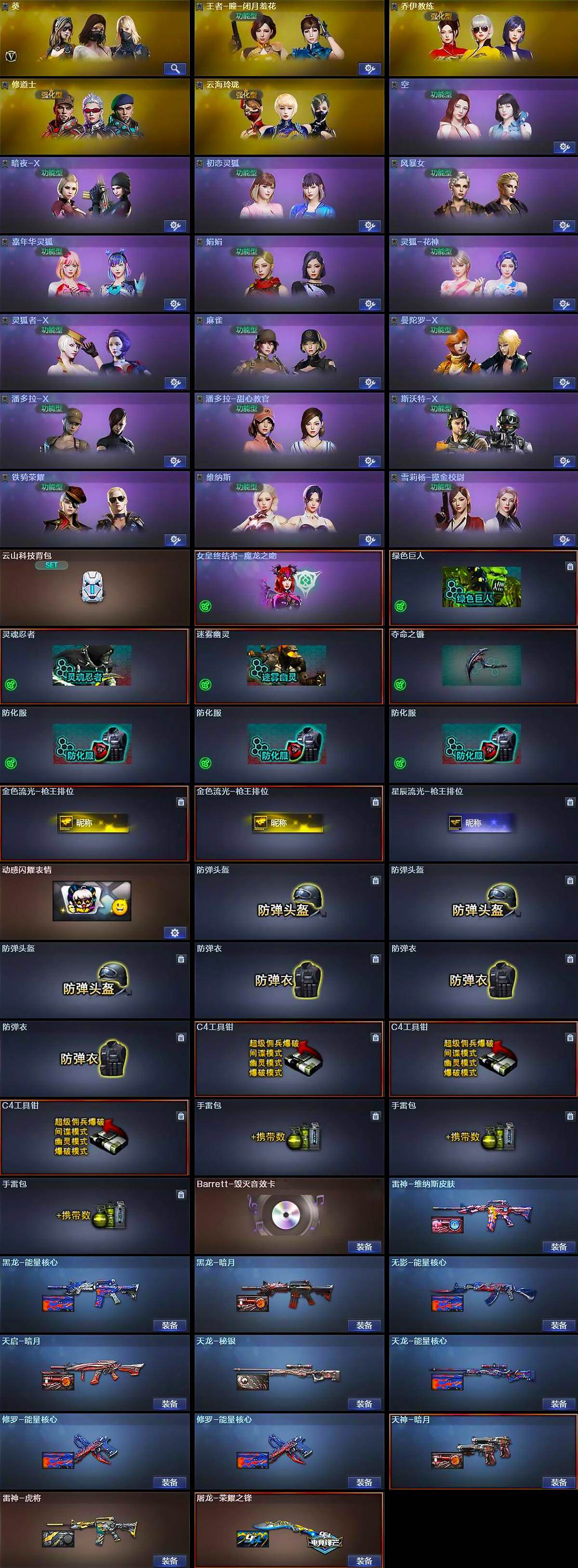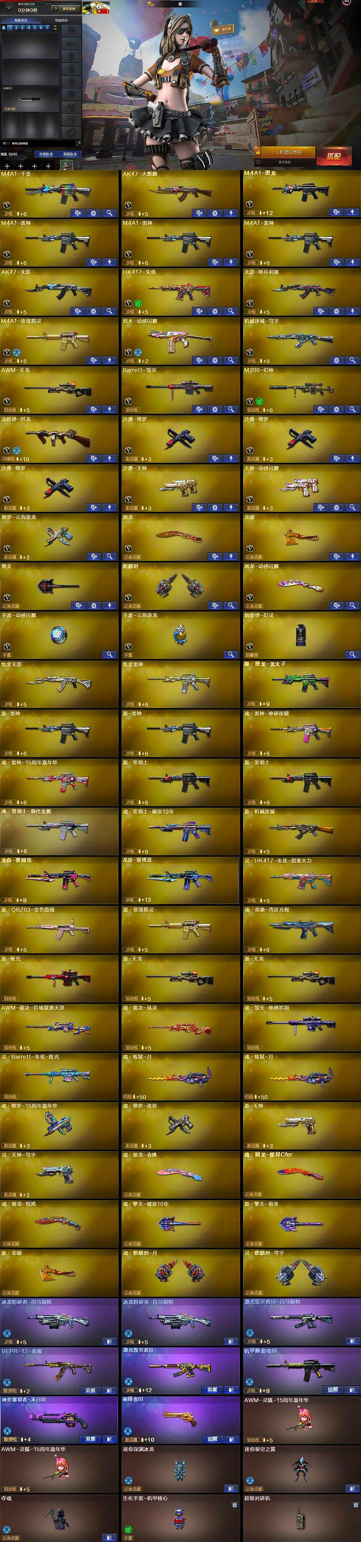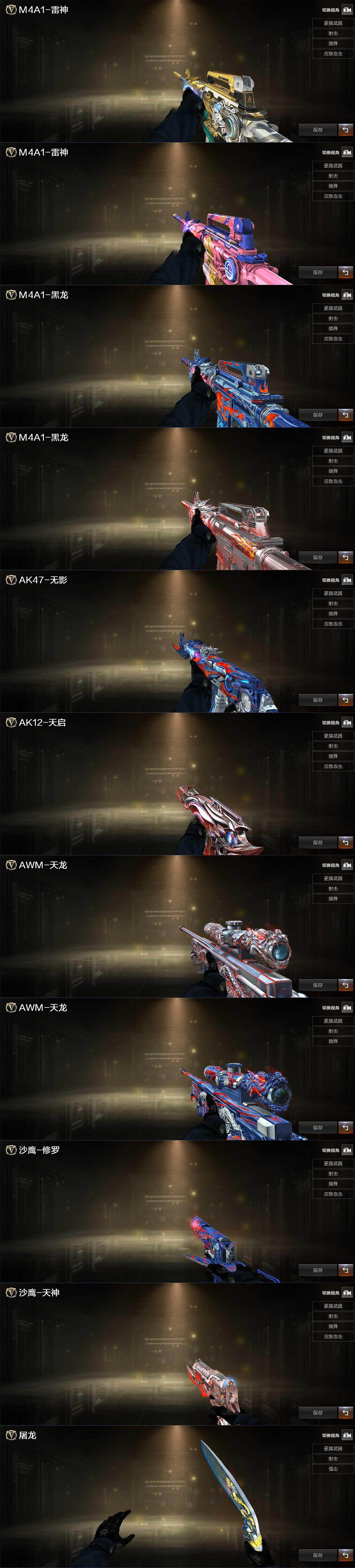 【英雄级武器】:M4A1-千变,AK47-火麒麟,M4A1-黑龙,M4A1-雷神*3,AK47-无影,HK417-朱雀,无影-神兵利器,M4A1-玫瑰精灵,烈火-动感闪耀,机械迷城-穹宇,AWM-天龙,Barrett-毁灭,M200-幻神,汤姆逊-烈龙,沙鹰-修罗*3,沙鹰-天神,天神-动感闪耀,修罗-云海游龙,屠龙,龙啸,擎天,麒麟刺,屠龙-动感闪耀,手雷-动感闪耀,手雷-云海游龙,烟雾弹-幻灵
