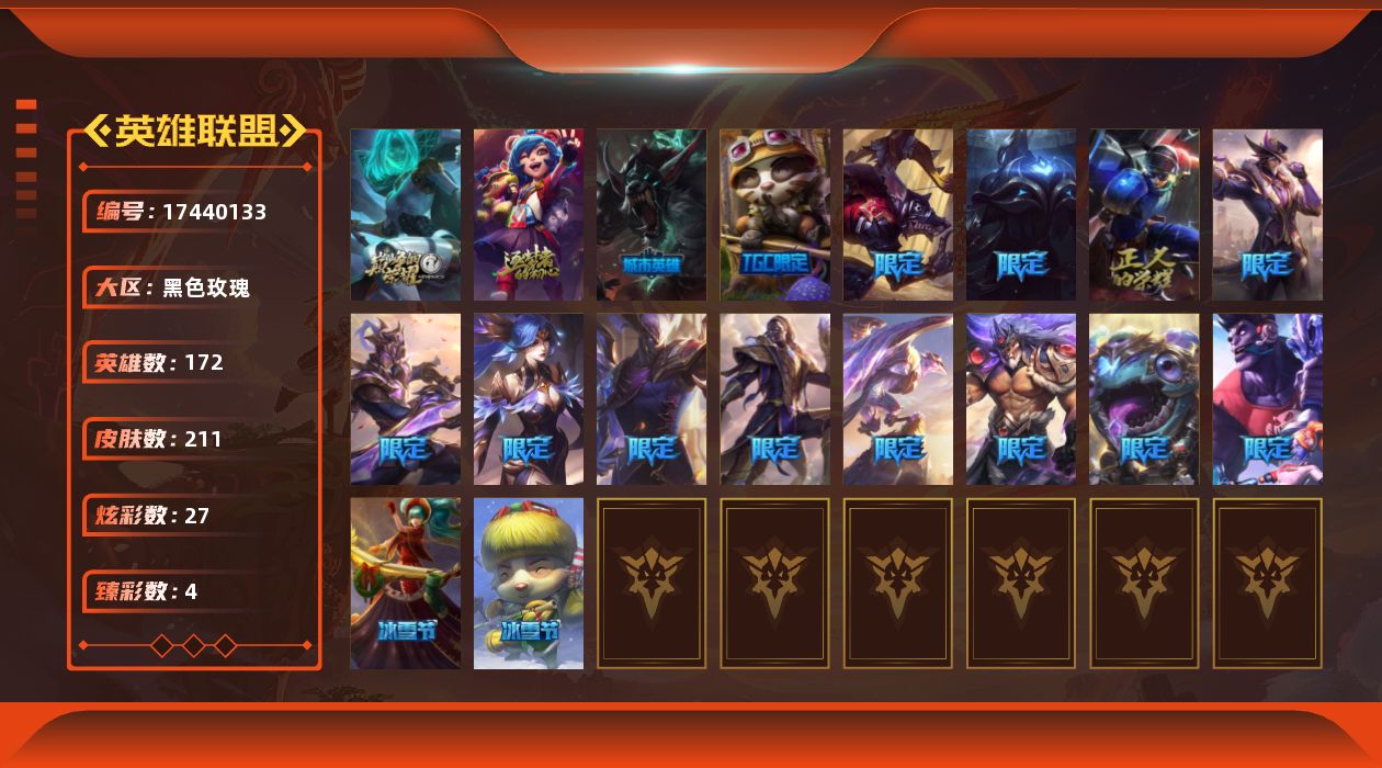 [17440133]黄金段位-172英雄-211皮肤-27炫彩-0终极-2神话-18限定-30传说-49史诗