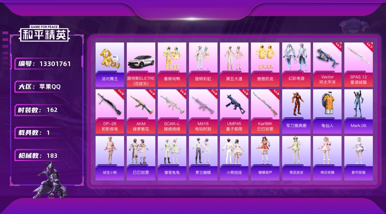[13301761]【1428】苹果 手Q-5粉装-8特效枪-1载具-0粉色飞行器-60791热力值-12王牌印记-162套装-183枪皮