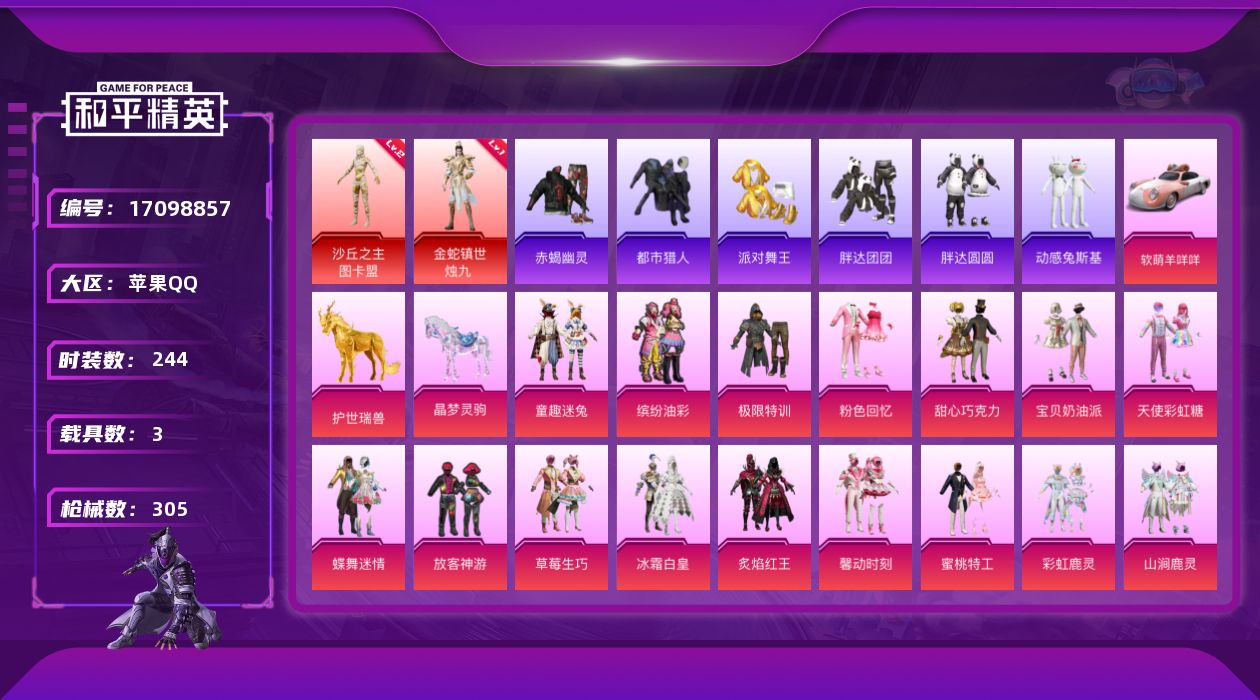 [17098857]【1569】苹果 手Q-无敌战神框-2神装-37粉装-19特效枪-3载具-14粉色飞行器-123634热力值-16王牌印记-244套装-305枪皮