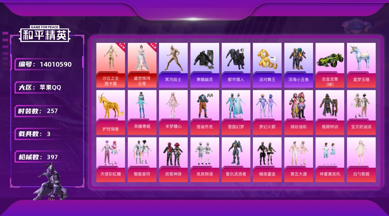 [14010590]【1570】苹果 手Q-无敌战神框-2神装-31粉装-37特效枪-3载具-27粉色飞行器-156145热力值-18王牌印记-257套装-397枪皮