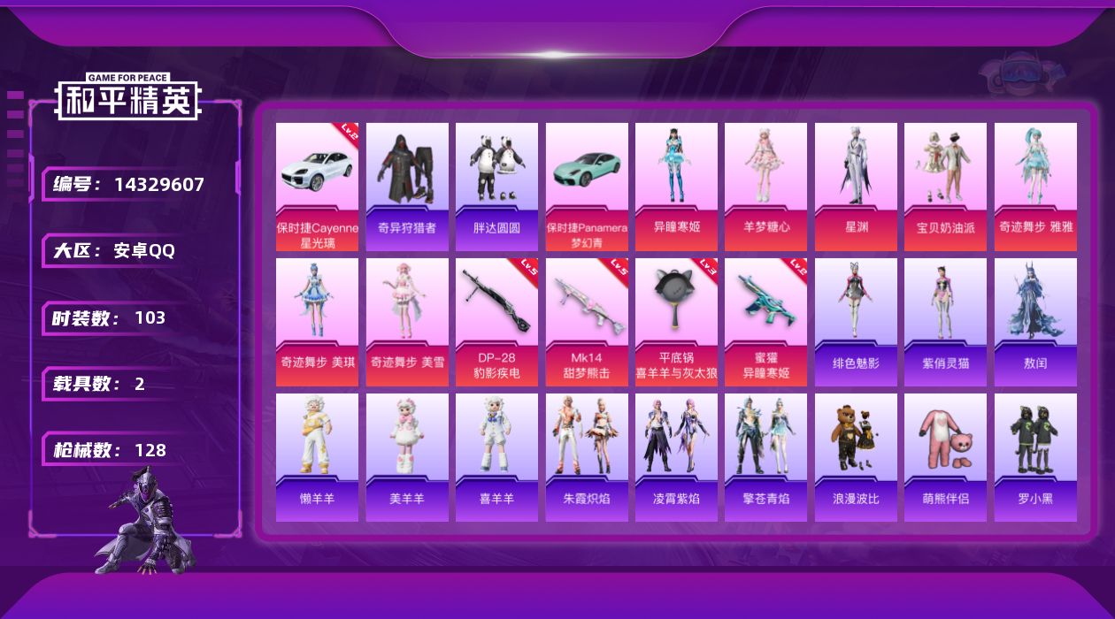 [14329607]【1601】安卓 手Q-7粉装-4特效枪-2载具-1粉色飞行器-40331热力值-1王牌印记-103套装-128枪皮 【红色载具】:保时捷Cayenne(星光璃)(二级) 【热门品类】:套装-浪漫天命,套装-奇异狩猎者,套装-胖达圆圆,套装-星河浪客,套装-暗影哥特,套装-浪漫波比,套装-萌熊伴侣,套装-糯粉咩咩 【粉色载具】:保时捷Panamera(梦幻青),保时捷Cayenne(星光璃) 【粉色套装】:粉装-宝贝奶油派,角色-奇迹舞步 雅雅,角色-奇迹舞步 美琪,角色-奇迹舞步 美雪,角色-星渊,角色-羊梦糖心,角色-异瞳寒姬 【粉色枪皮等级】:蜜獾-异瞳寒姬(二级),Mk14-甜梦熊击(五级),DP-28-豹影疾电(五级),平底锅-喜羊羊与灰太狼(三级) 【粉色枪皮】:蜜獾-异瞳寒姬,Mk14-甜梦熊击,DP-28-豹影疾电,平底锅-喜羊羊与灰太狼 【粉色降落伞】:未来战士降落伞,王牌四分卫降落伞,智耀战神降落伞,星穹咏叹调降落伞,奇迹舞步降落伞,喜羊羊与灰太狼降落伞,魔童闹海 敖丙降落伞,异瞳寒姬降落伞 【稀有套装】:角色-拉斐尔,套装-粉恋花,套装-紫幽梦,套装-蓝冰羽,套装-星影赞美诗,套装-云朵鹅,套装-雪绒豹,角色-乐音,套装-朱霞炽焰,套装-凌霄紫焰,套装-擎苍青焰,玩偶服-懒羊羊,玩偶服-美羊羊,玩偶服-喜羊羊,角色-敖闰,角色-绯色魅影,角色-紫俏灵猫,套装-炫彩糖果,套装-雁字回时 【稀有枪皮】:AUG-冰晶雪宝,AKM-彩虹符号,M16A4-凝视深渊,SCAR-L-夜灯,SCAR-L-流星咚咚,SCAR-L-炫彩节奏,M416-糯团青竹,M416-萌萌史莱姆,GROZA-异彩先驱,AUG-天降萌叽,AUG-耀粉歌者,AUG-青春冒险家,QBZ-彩虹符号,QBZ-飞驰魅影,M762-天降萌叽,M762-奇异狩猎者,M762-彩虹符号,M762-云朵鹅,ARX-凌霄紫焰,UZI-天降萌叽,Vector-彩虹符号,Vector-生命誓言,Vector-田园牧歌,汤姆逊-奇异狩猎者,汤姆逊-异彩先驱,MP5K-异彩先驱,JS9-凌霄紫焰,P90-飞驰魅影,Kar98K-彩虹符号,Kar98K-洛神天依,Kar98K-飞驰魅影,Kar98K-星穹咏叹调,AWM-恐龙拽拽,AWM-王牌四分卫,AWM-奇迹舞步,VSS-彩虹符号,VSS-田园牧歌,Mi