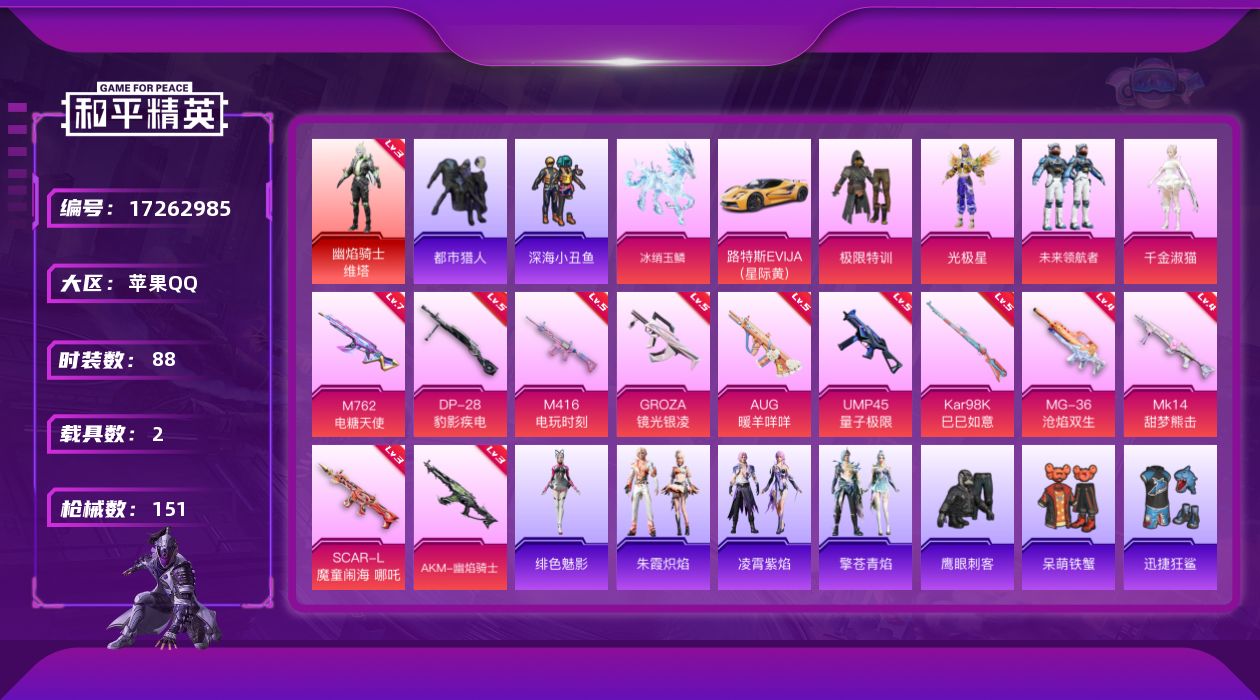 [17262985]【1603】苹果 手Q-1神装-4粉装-11特效枪-2载具-10粉色飞行器-50989热力值-6王牌印记-88套装-151枪皮