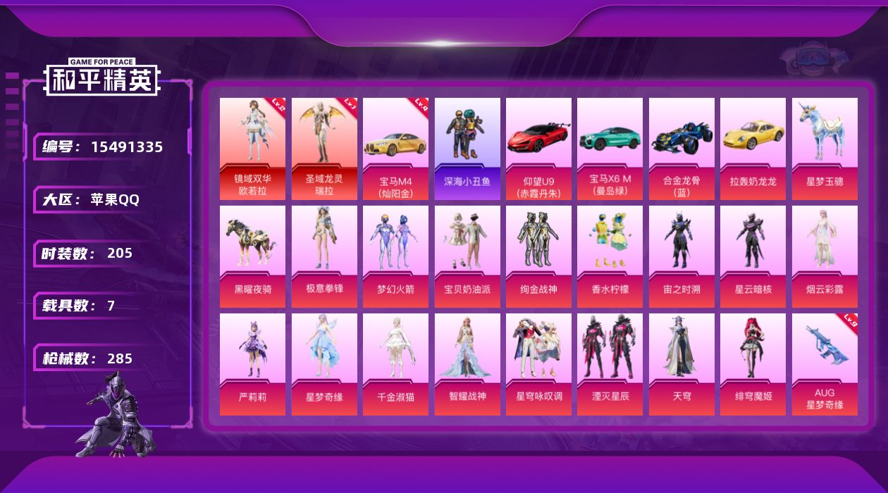 [15491335]【1690】苹果 手Q-2神装-16粉装-20特效枪-7载具-8粉色飞行器-114293热力值-15王牌印记-205套装-285枪皮 【红色载具】:宝马M4(灿阳金)(四级) 【红色神装等级】:圣域龙灵-瑞拉(一级),镜域双华-欧若拉(二级) 【红色角色神装】:圣域龙灵-瑞拉,镜域双华-欧若拉 【热门品类】:粉装-梦幻火箭,套装-深海小丑鱼,套装-小丑鱼,角色-2P战斗服款,套装-龟仙人,套装-暗影哥特,角色-Mark.06 【粉色套装】:粉装-宝贝奶油派,粉装-梦幻火箭,粉装-绚金战神,粉装-香水柠檬,角色-宙之时溯,角色-星云暗核,角色-烟云彩露,角色-严莉莉,角色-星梦奇缘,角色-千金淑猫,角色-智耀战神,粉装-星穹咏叹调,粉装-湮灭星辰,角色-天穹,角色-绯穹魔姬,粉装-极意拳锋 【粉色枪皮等级】:AKM-炫紫旋律(五级),AKM-绿萝繁花(五级),SCAR-L-时空协奏(三级),M416-风花雪月(一级),M416-电玩时刻(五级),M416-灵猫魔法师(八级),GROZA-香水柠檬(七级),AUG-星梦奇缘(九级),AUG-许七安(一级),蜜獾-异瞳寒姬(二级),Vector-绯穹魔姬(一级),AKS-74U-星穹咏叹调(五级),P90-甜蜜草莓(五级),Kar98K-巳巳如意(五级),Kar98K-圣域龙灵(三级),M24-镜域双华(三级),AMR-智耀战神(三级),DP-28-千金淑猫(六级),DP-28-豹影疾电(五级),破片手榴弹-美味星星糖(五级) 【粉色载具】:仰望U9(赤霞丹朱),宝马M4(灿阳金),宝马X6 M(曼岛绿),合金龙骨(蓝),拉轰奶龙龙,僚机-圣域龙宝,星梦玉骢,黑曜夜骑 【粉色枪皮】:AKM-炫紫旋律,AKM-绿萝繁花,SCAR-L-时空协奏,M416-风花雪月,M416-电玩时刻,M416-灵猫魔法师,GROZA-香水柠檬,AUG-星梦奇缘,AUG-许七安,蜜獾-异瞳寒姬,Vector-绯穹魔姬,AKS-74U-星穹咏叹调,P90-甜蜜草莓,Kar98K-巳巳如意,Kar98K-圣域龙灵,M24-镜域双华,AMR-智耀战神,DP-28-千金淑猫,DP-28-豹影疾电,破片手榴弹-美味星星糖 【粉色飞行器】:超新星飞行器,镜光幻境飞行翼,镜域双华-灵镜之阶,圣域金龙飞行器,雀灵庇佑飞行器,灵猫魔法师飞行器 【粉色降落伞】: