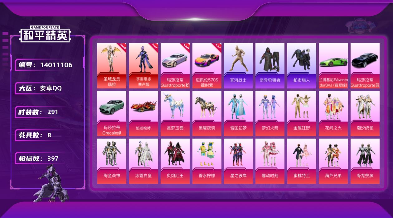 [14011106]【1572】安卓 手Q-无敌战神框-2神装-27粉装-27特效枪-8载具-9粉色飞行器-160976热力值-26王牌印记-291套装-397枪皮 【红色载具】:玛莎拉蒂Quattroporte(幻星粉)(四级),迈凯伦570S(镭射紫)(一级) 【红色神装等级】:圣域龙灵-瑞拉(二级),宇宙意志-塞卢姆(一级) 【红色角色神装】:圣域龙灵-瑞拉,宇宙意志-塞卢姆 【热门品类】:粉装-雪国幻梦,粉装-梦幻火箭,套装-浪漫天命,套装-都市猎人,套装-冥河战士,套装-奇异狩猎者,套装-暗夜行者,套装-暗夜之虎,套装-龟仙人,套装-暗影哥特,角色-8号机,角色-Mark.06,熔岩游骑兵面罩 【粉色载具】:兰博基尼Aventador SVJ(翡翠绿),玛莎拉蒂Quattroporte(幻星粉),玛莎拉蒂Quattroporte(夜幕蓝),玛莎拉蒂Grecale(薄荷绿),迈凯伦570S(镭射紫),焰龙咆哮,星梦玉骢,黑曜夜骑 【粉色套装】:粉装-雪国幻梦,粉装-梦幻火箭,粉装-金属狂野,粉装-花间之火,粉装-潮汐统领,粉装-绚金战神,粉装-冰霜白皇,粉装-炙焰红王,粉装-香水柠檬,粉装-星之彼岸,粉装-馨动时刻,粉装-蜜桃特工,粉装-葫芦兄弟,粉装-骨龙祭渊,角色-洛天依,粉装-暗星紫秘,粉装-旋转彩虹,粉装-冰川幽秘,粉装-海螺星光,粉装-第五大道,粉装-金丰海韵,角色-狂花道·不知火舞,粉装-幻彩电音,角色-荧海星豚,角色-奇迹舞步 贝贝,角色-奇迹舞步 美琪,角色-奇迹舞步 美雪 【粉色枪皮等级】:AKM-梦之光华(七级),M16A4-垂柳戏鸭(四级),SCAR-L-童趣迷兔(三级),M416-心之恋语(一级),M416-灵猫魔法师(八级),GROZA-香水柠檬(七级),GROZA-旋转彩虹(一级),GROZA-精灵之光(二级),AUG-星之彼岸(一级),AUG-星梦奇缘(九级),M762-甜蜜誓约(七级),UMP45-雪国精灵(六级),UMP45-宇宙意志(三级),AKS-74U-无垠阁(四级),JS9-奇迹舞步(三级),Kar98K-巳巳如意(四级),Kar98K-圣域龙灵(三级),Mk14-爆裂游戏(四级),AMR-炫光之旅(三级),AMR-智耀战神(一级),MK20-H-海螺星光(五级),DP-28-豹影疾电(五级),MG3-洛神天依(七级),MG-36-幻
