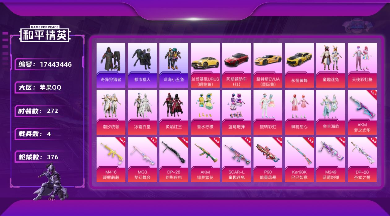 [17443446]苹果 手Q-无敌战神框-10粉装-13特效枪-4载具-3粉色飞行器-123294热力值-13王牌印记-272套装-376枪皮