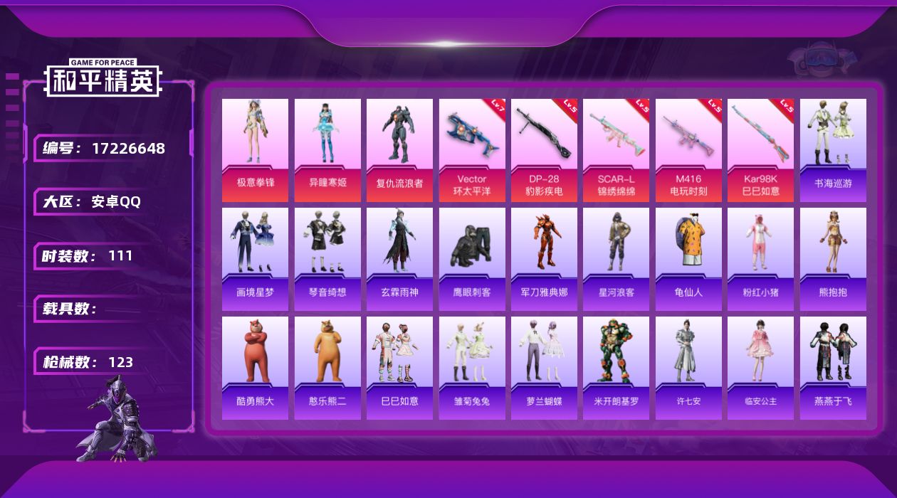 [17226648]安卓 手Q-3粉装-5特效枪-0载具-1粉色飞行器-38825热力值-13王牌印记-111套装-123枪皮 【热门品类】:角色-军刀雅典娜,套装-星河浪客,套装-龟仙人,套装-粉红小猪 【粉色套装】:角色-复仇流浪者,角色-异瞳寒姬,粉装-极意拳锋 【粉色枪皮等级】:SCAR-L-锦绣绵绵(五级),M416-电玩时刻(五级),Vector-环太平洋(七级),Kar98K-巳巳如意(五级),DP-28-豹影疾电(五级) 【粉色枪皮】:SCAR-L-锦绣绵绵,M416-电玩时刻,Vector-环太平洋,Kar98K-巳巳如意,DP-28-豹影疾电 【粉色降落伞】:绝对恒星降落伞,环太平洋降落伞,炫光之旅降落伞,圣堂之誓降落伞,猪猪侠降落伞,精灵梦叶罗丽降落伞,樱桃泡泡降落伞,星穹咏叹调降落伞,天象三御降落伞,炫彩糖果降落伞 【稀有套装】:套装-龟仙人,套装-熊抱抱,玩偶服-酷勇熊大,玩偶服-憨乐熊二,套装-巳巳如意,套装-雪国风尚,套装-炫彩糖果,套装-雏菊兔兔,套装-萝兰蝴蝶,角色-米开朗基罗,角色-许七安,角色-临安公主,套装-燕燕于飞,套装-鱼渊荷华,角色-糖霜甜心,角色-蜜桃派对,套装-粉恋花,套装-紫幽梦,套装-蓝冰羽,套装-霓虹热舞,角色-玄霖雨神,套装-书海巡游,套装-画境星梦,套装-琴音绮想 【稀有枪皮】:AUG-冰晶雪宝,AKM-影袭,AKM-环太平洋,AKM-霓虹街区,AKM-龙的传人,M16A4-蓝色火焰,SCAR-L-炫彩节奏,SCAR-L-天象三御,M416-糯团青竹,GROZA-影袭,GROZA-恐龙拽拽,AUG-天降萌叽,AUG-耀粉歌者,M762-彩虹符号,Mk47-炫光之旅,蜜獾-天降萌叽,ACE32-画境星梦,UZI-啾咪啾咪,UZI-天降萌叽,UZI-影袭,UMP45-炫光之旅,UMP45-绒宝小鹅,Vector-焰鹰斗篷,Vector-彩虹符号,Vector-生命誓言,汤姆逊-天降萌叽,汤姆逊-环太平洋,MP5K-画境星梦,P90-巳巳如意,Kar98K-彩虹符号,M24-影袭,M24-炫彩节奏,AWM-焰鹰斗篷,AWM-圣堂之誓,SKS-炫彩节奏,Mini14-炫彩节奏,AMR-鬼刀,M1加兰德-画境星梦,S686-彩虹符号,S686-巳巳如意,S686-千金淑猫,S12K-玩趣呆呆,DBS-焰鹰斗篷,DBS-圣堂之誓,AA1