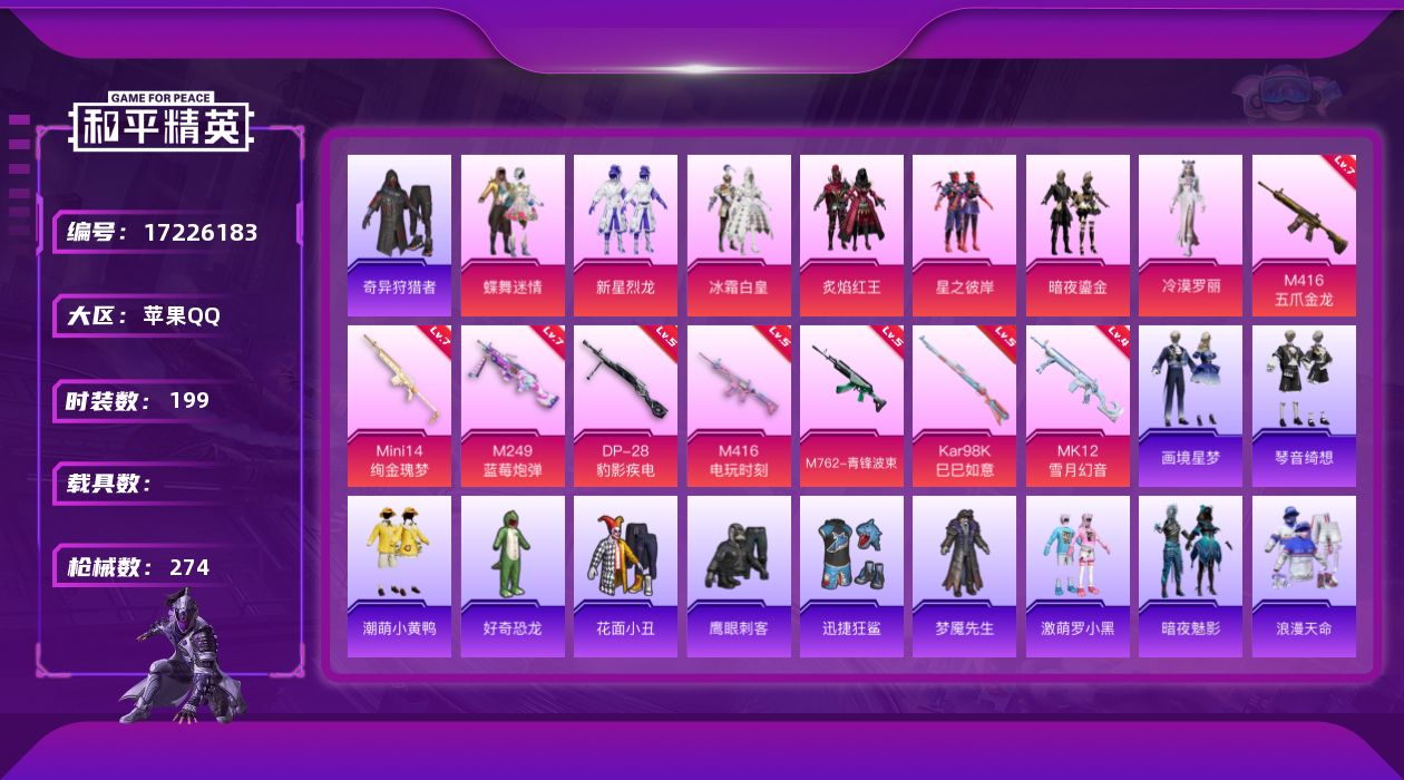 [17226183]苹果 手Q-7粉装-9特效枪-0载具-2粉色飞行器-93715热力值-10王牌印记-199套装-274枪皮